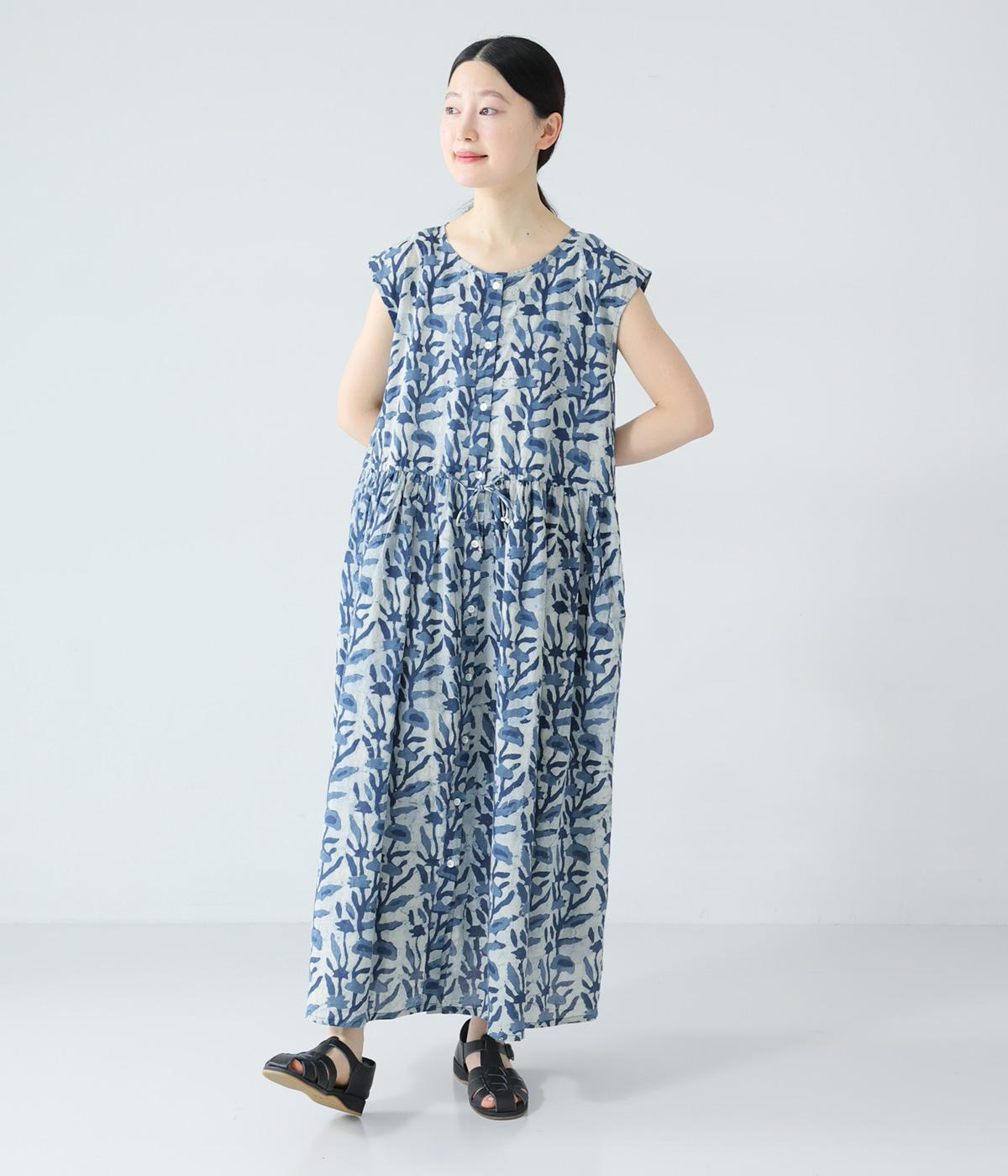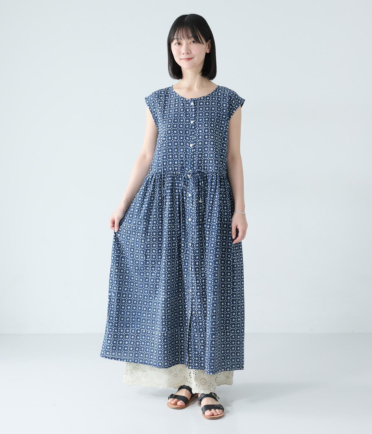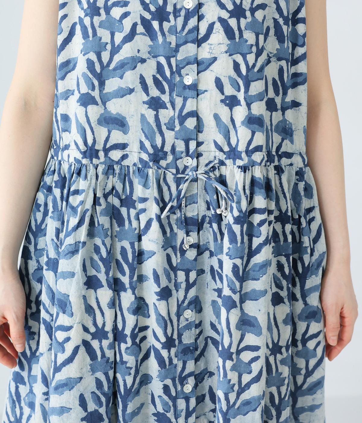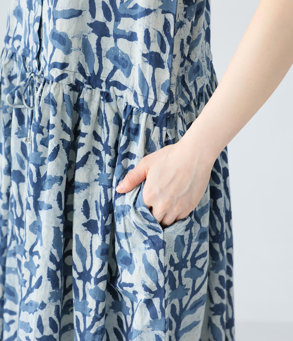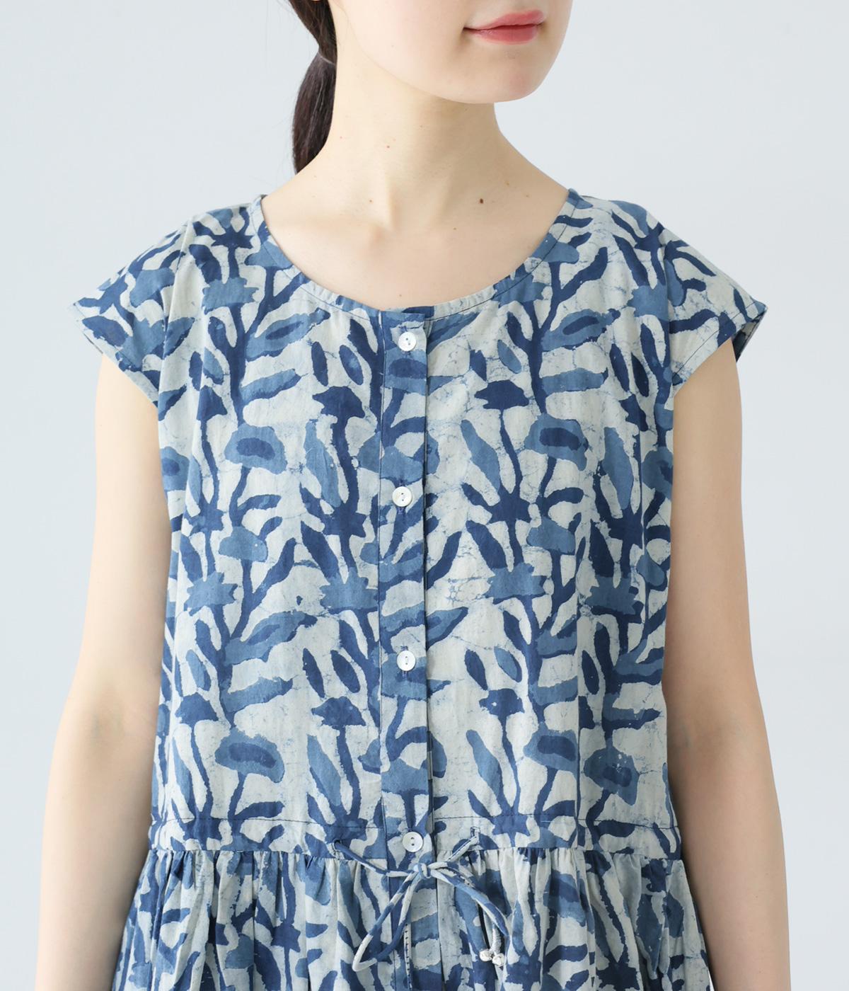 インドの伝統技法で染めた味わい深い柄が、さわやかに映えるワンピース。ウエストの切り替えからふんわり広がるシルエットが華やかさを添え、レイヤードスタイルにもなじみます。暑い季節にも涼やかさを運ぶ一枚です。