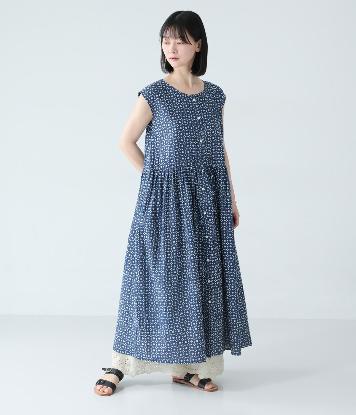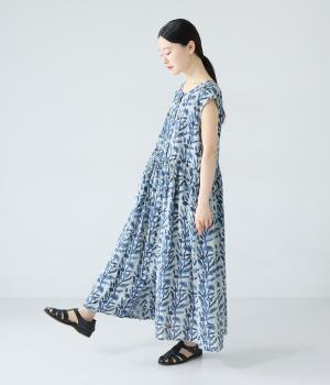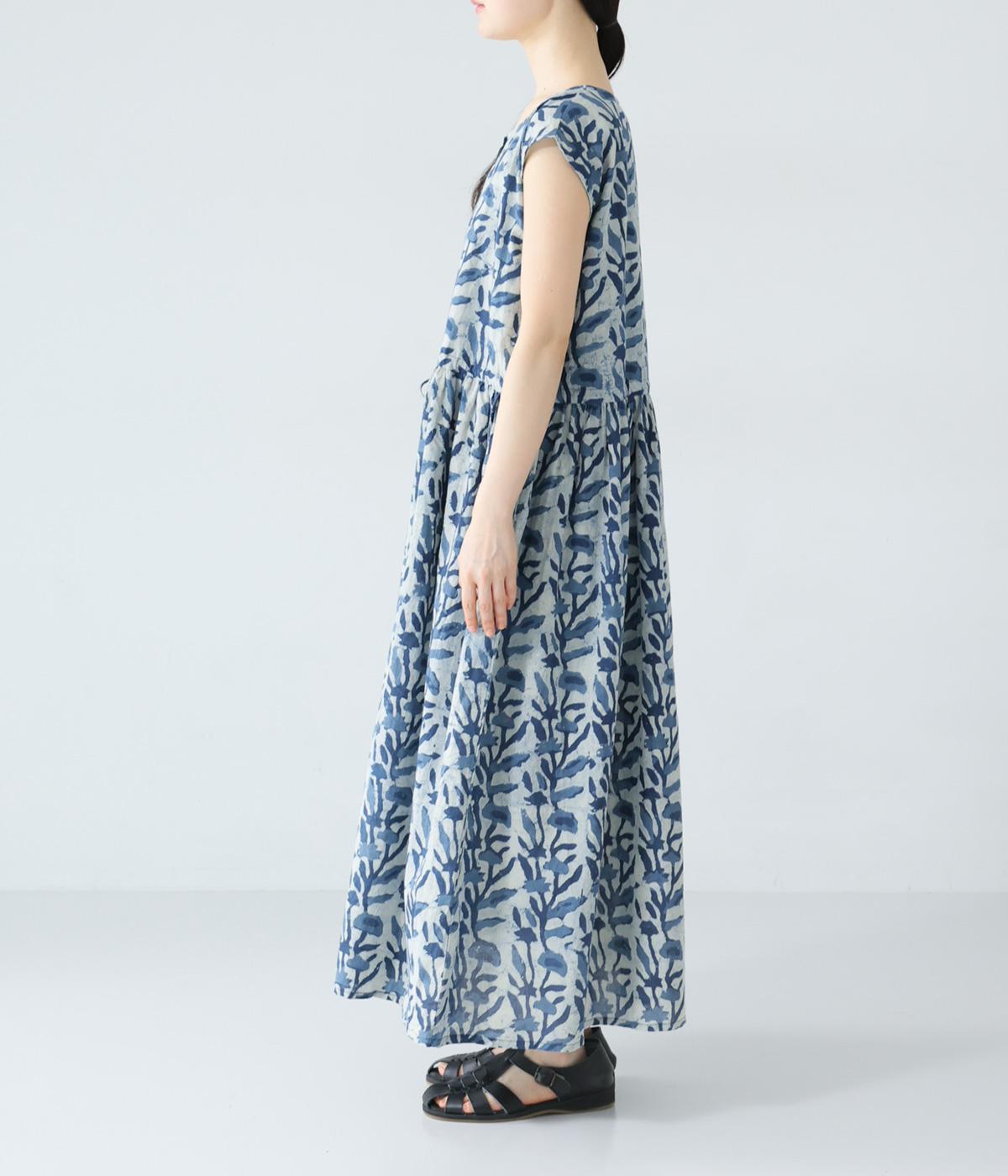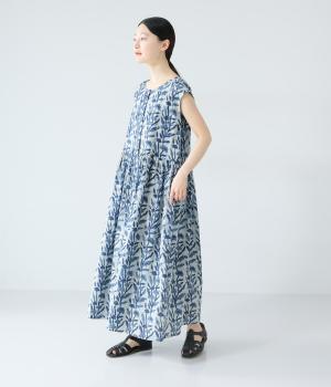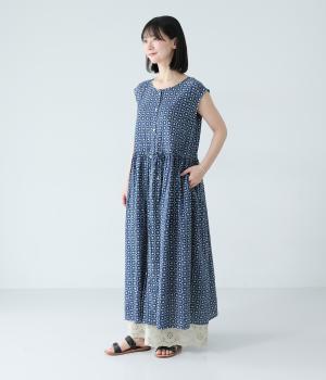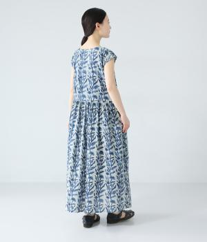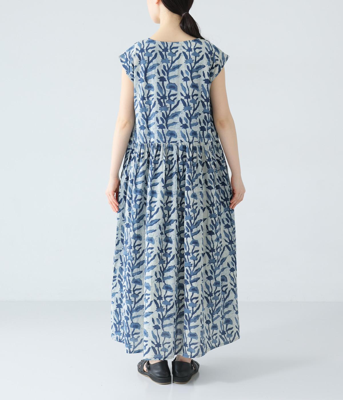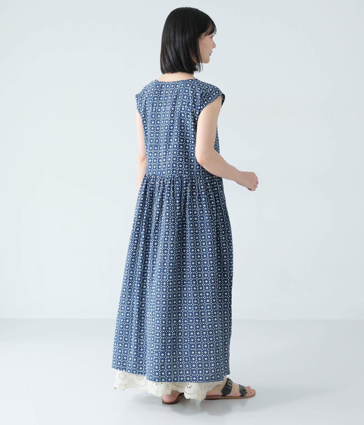 インドの伝統技法で染めた味わい深い柄が、さわやかに映えるワンピース。ウエストの切り替えからふんわり広がるシルエットが華やかさを添え、レイヤードスタイルにもなじみます。暑い季節にも涼やかさを運ぶ一枚です。
