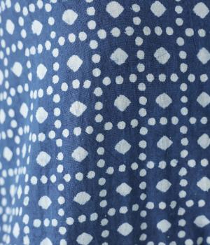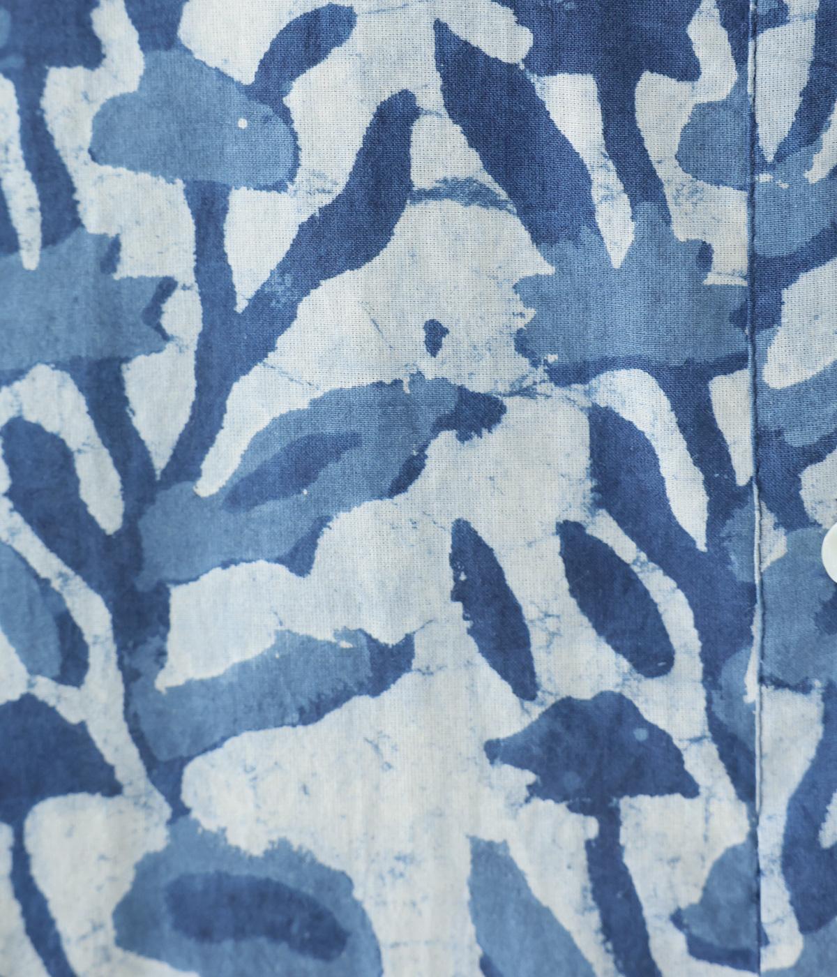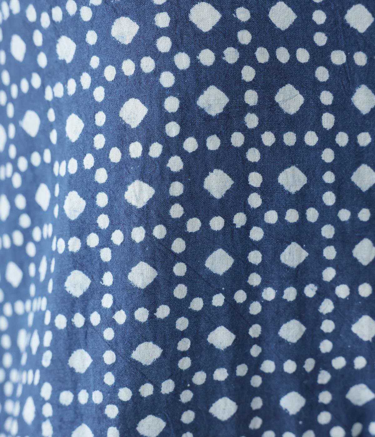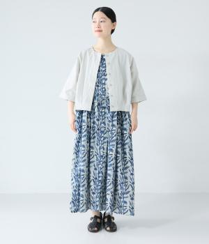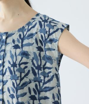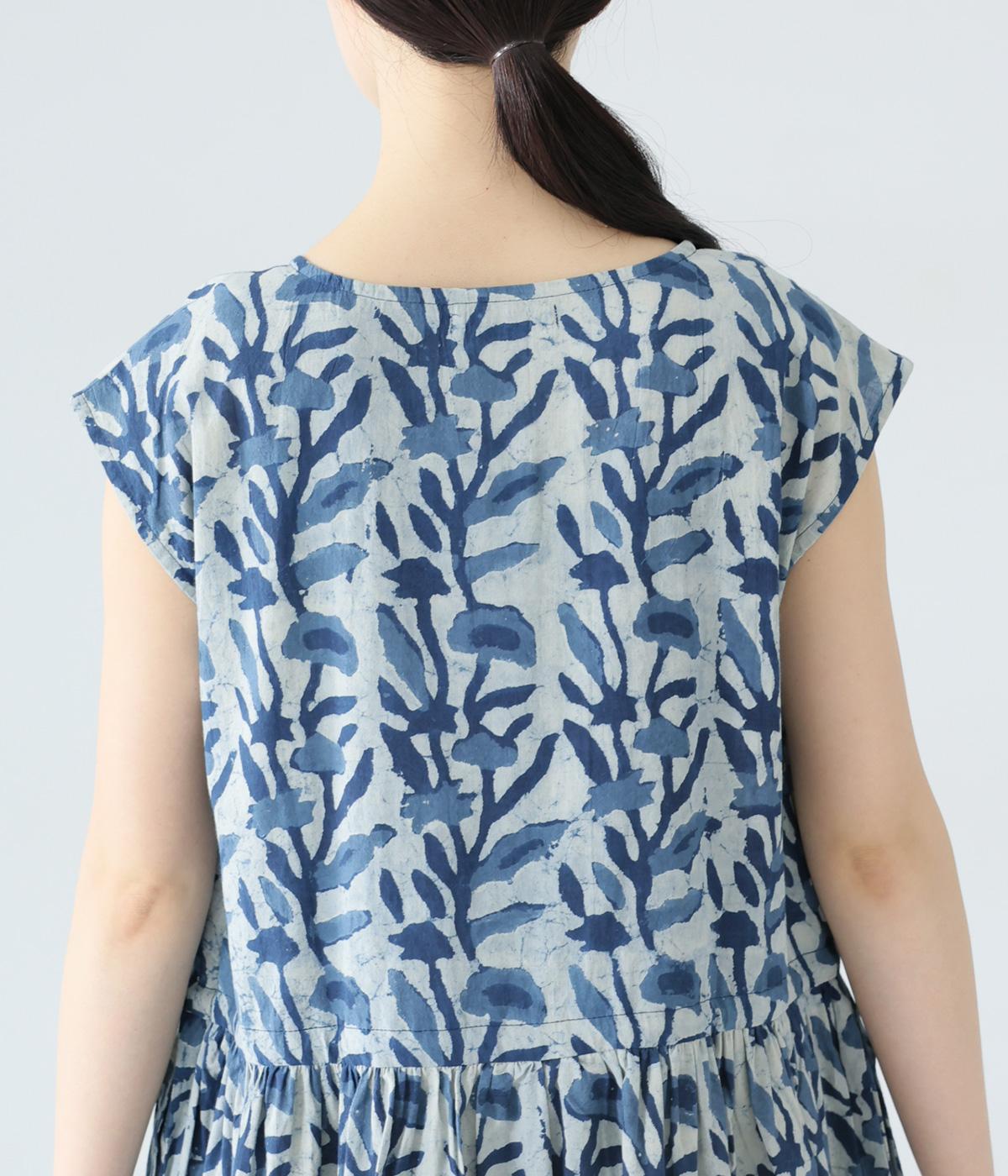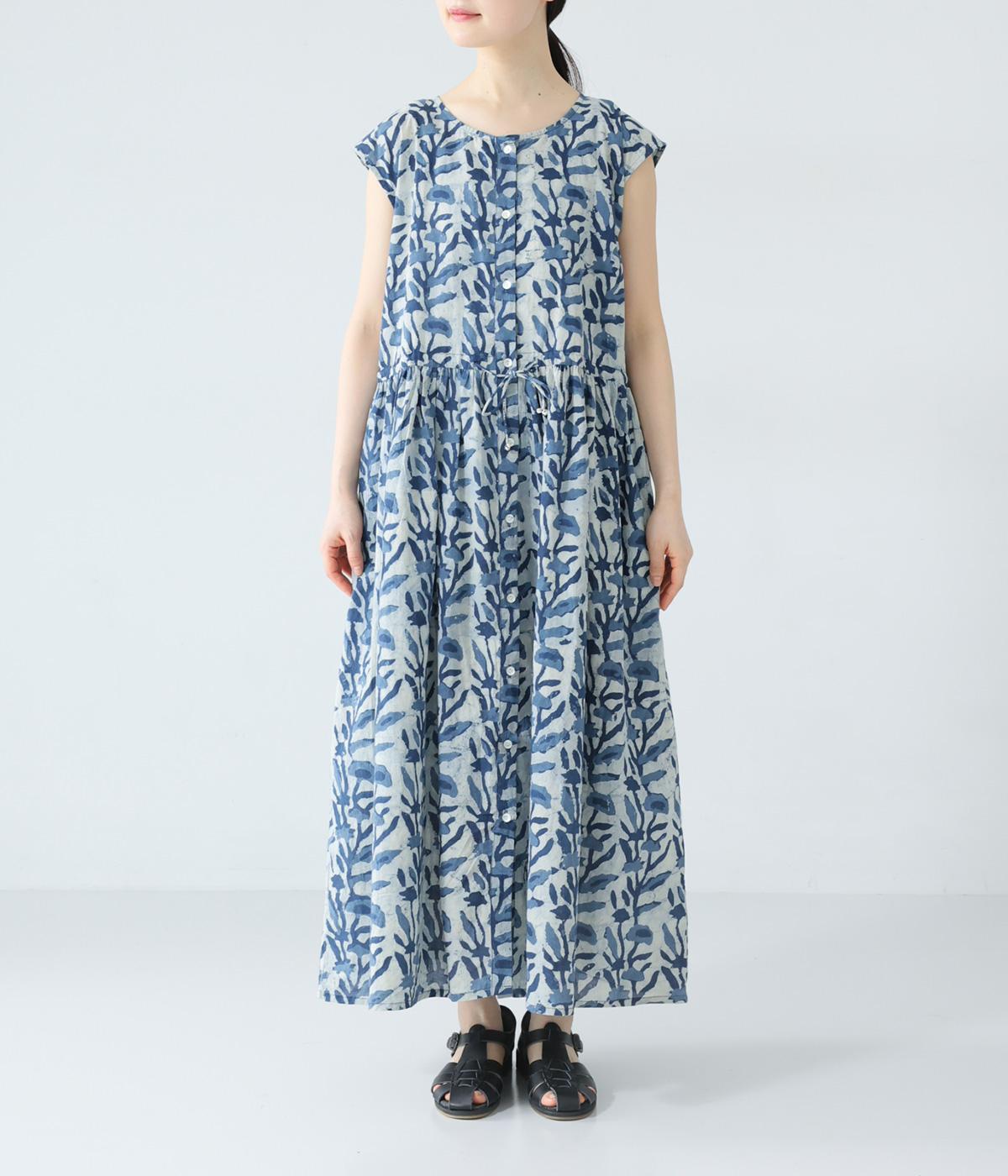 インドの伝統技法で染めた味わい深い柄が、さわやかに映えるワンピース。ウエストの切り替えからふんわり広がるシルエットが華やかさを添え、レイヤードスタイルにもなじみます。暑い季節にも涼やかさを運ぶ一枚です。