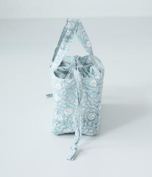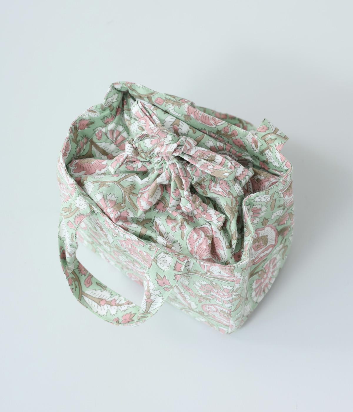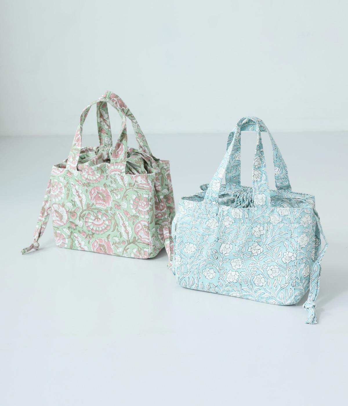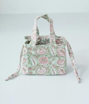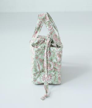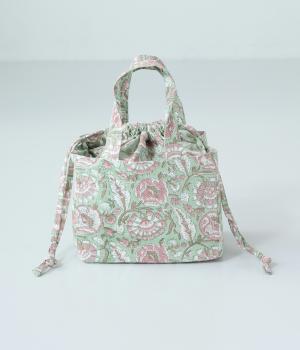 落ち着いた色調のブロックプリントをあしらった巾着付き保冷バッグです。開口部が広く、高さのある容器も収納しやすく、お弁当バッグとして使いやすいサイズ感。伝統的な木版プリントの温かみを感じる一品です。
