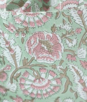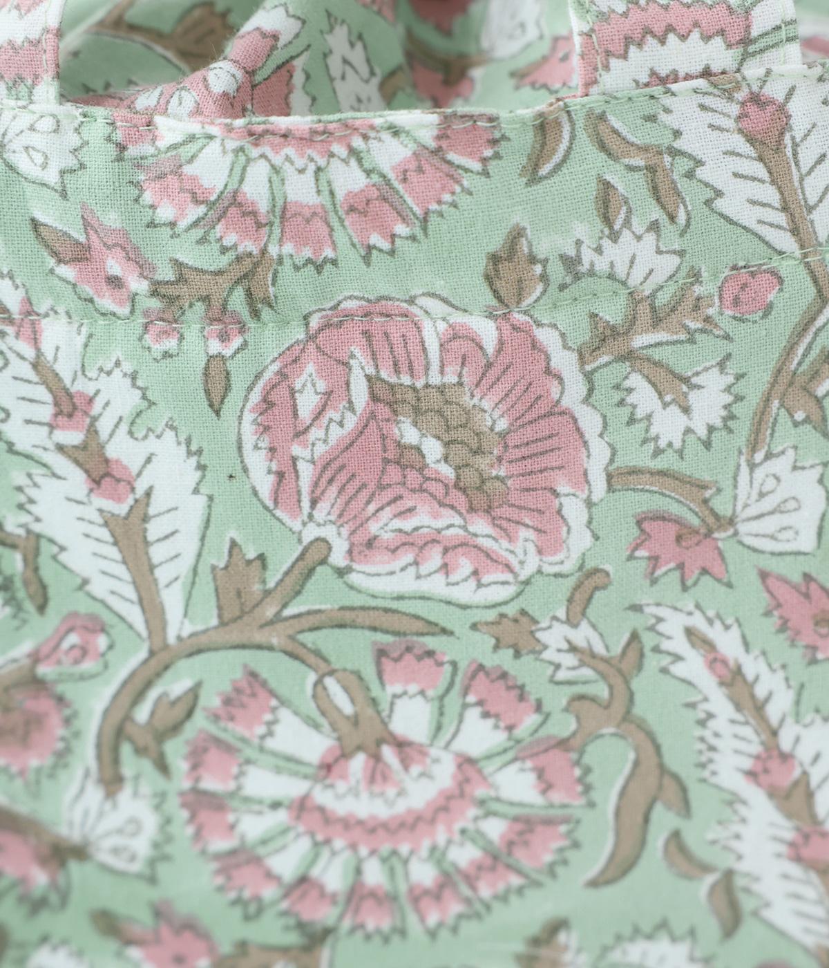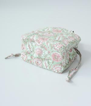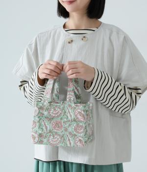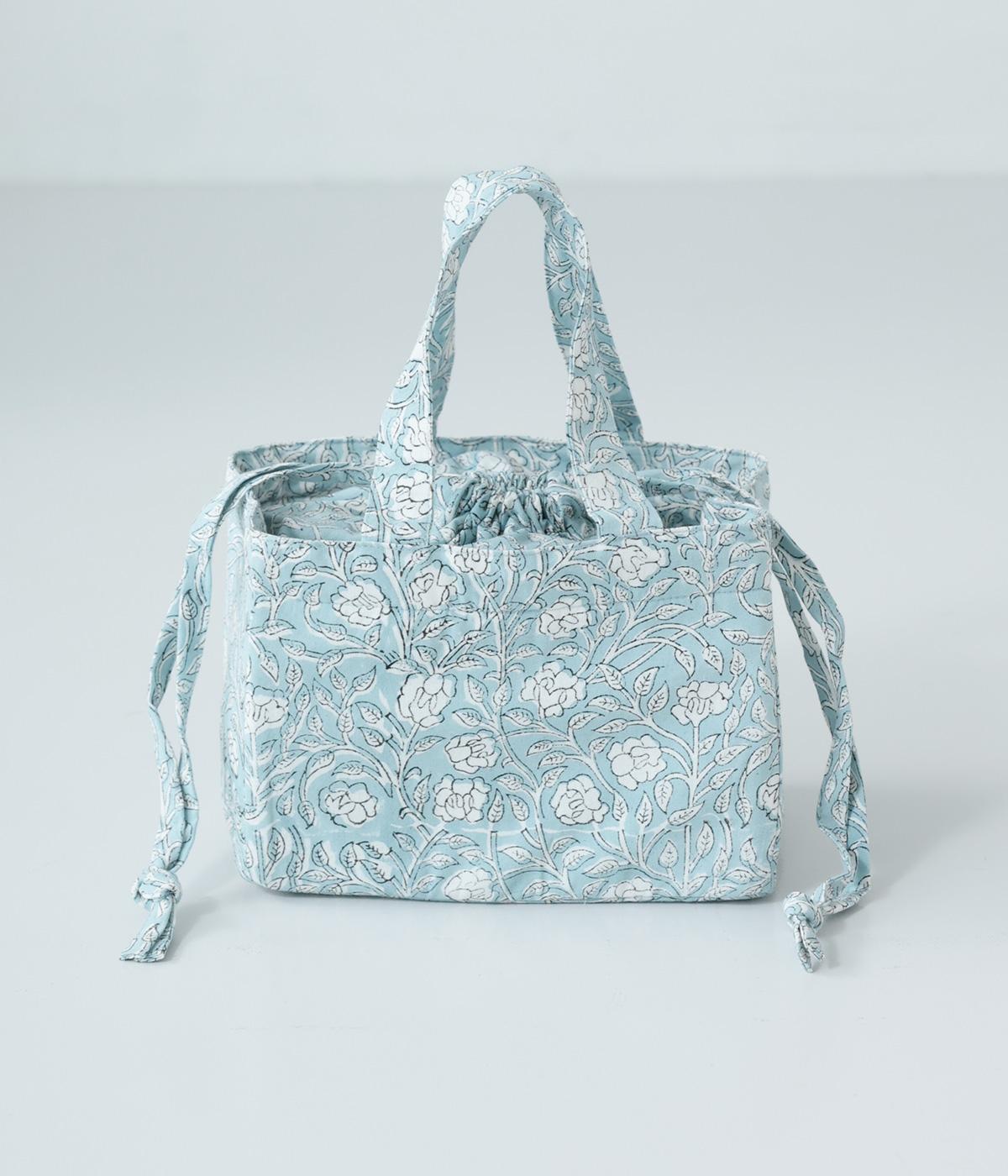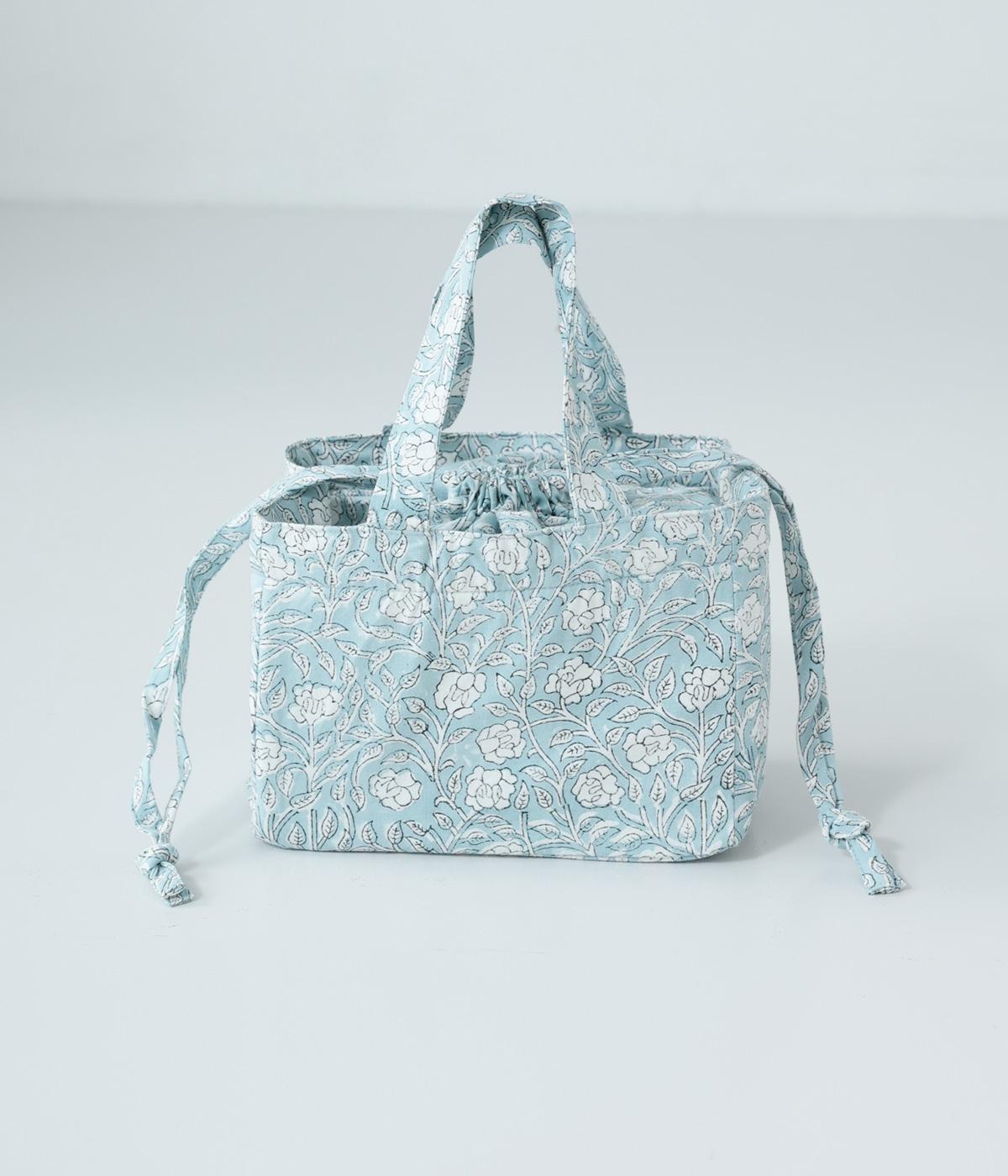 落ち着いた色調のブロックプリントをあしらった巾着付き保冷バッグです。開口部が広く、高さのある容器も収納しやすく、お弁当バッグとして使いやすいサイズ感。伝統的な木版プリントの温かみを感じる一品です。