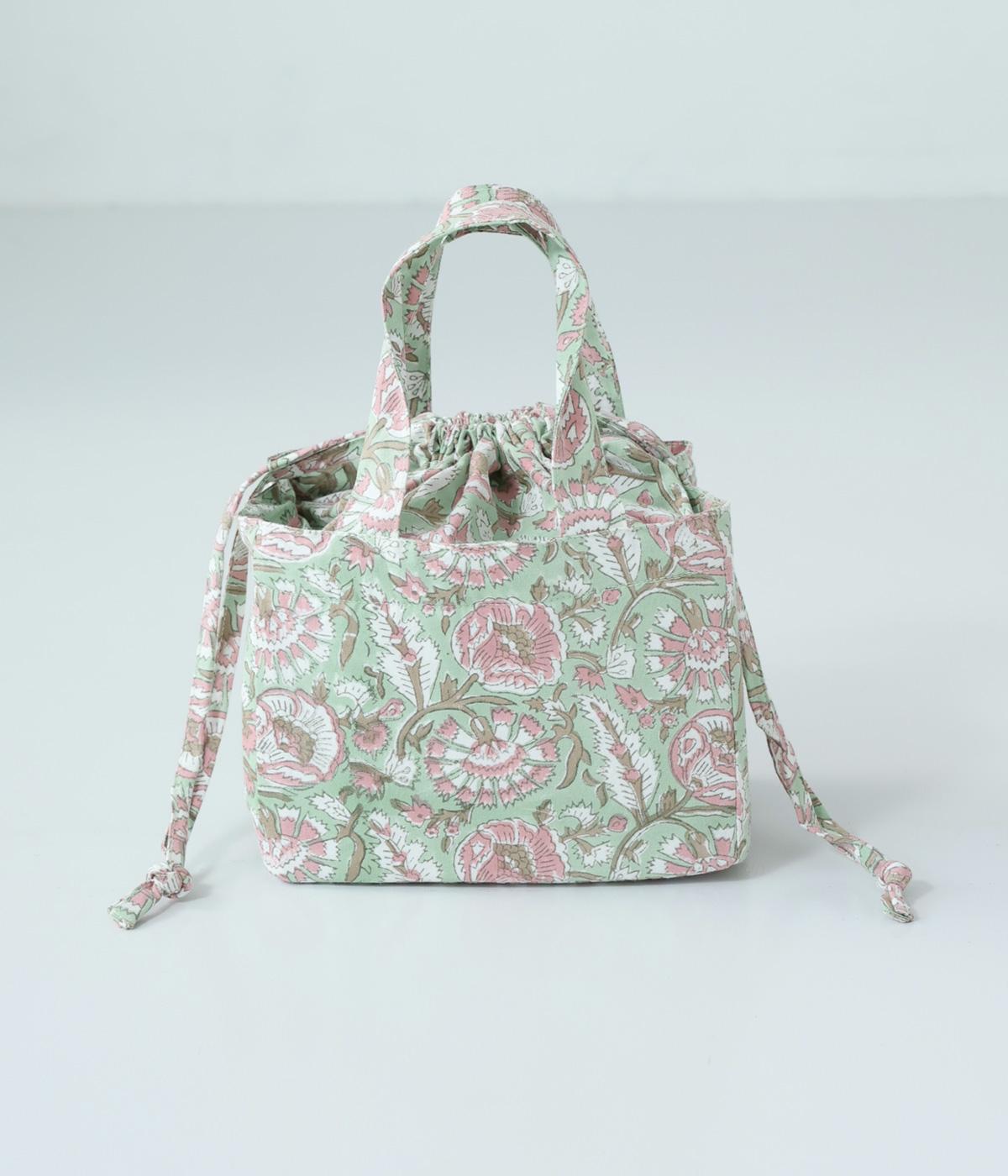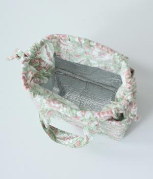 軽量で扱いやすい保冷仕様のバッグです。巾着部分はやわらかな生地感で開閉がスムーズ。手作業のプリントが映えるナチュラルな風合いが魅力です。