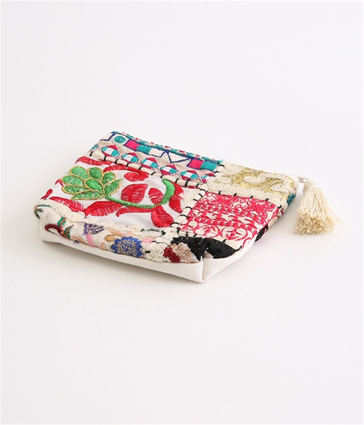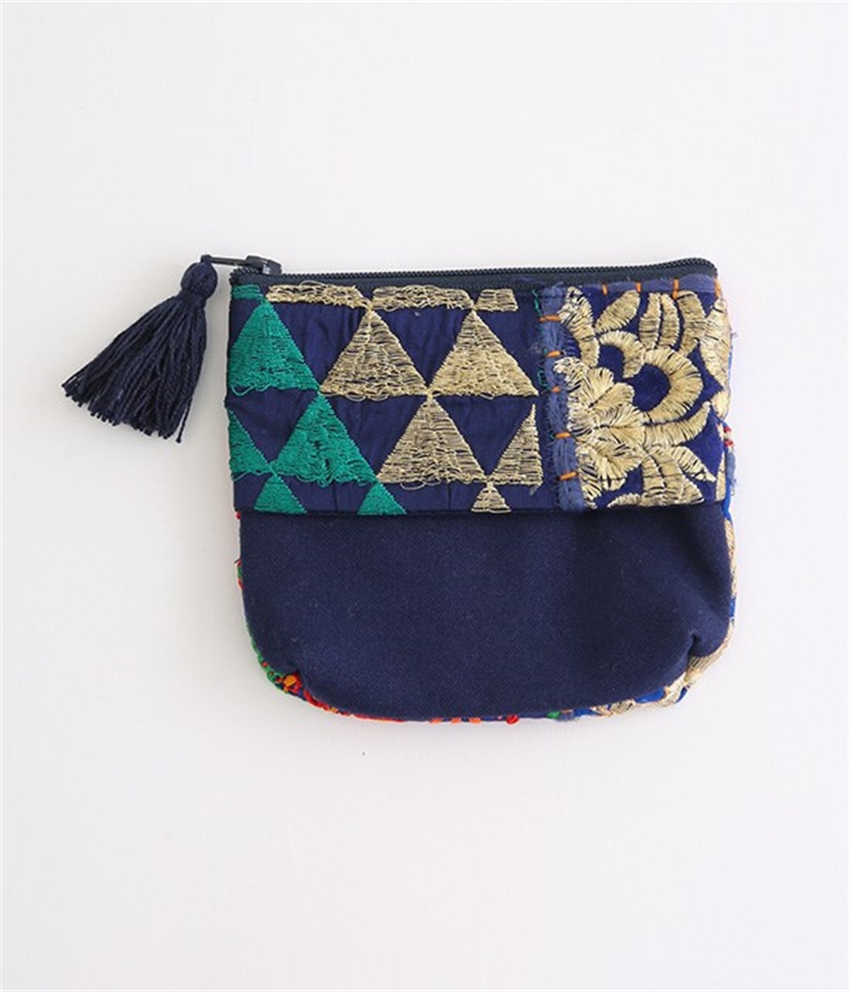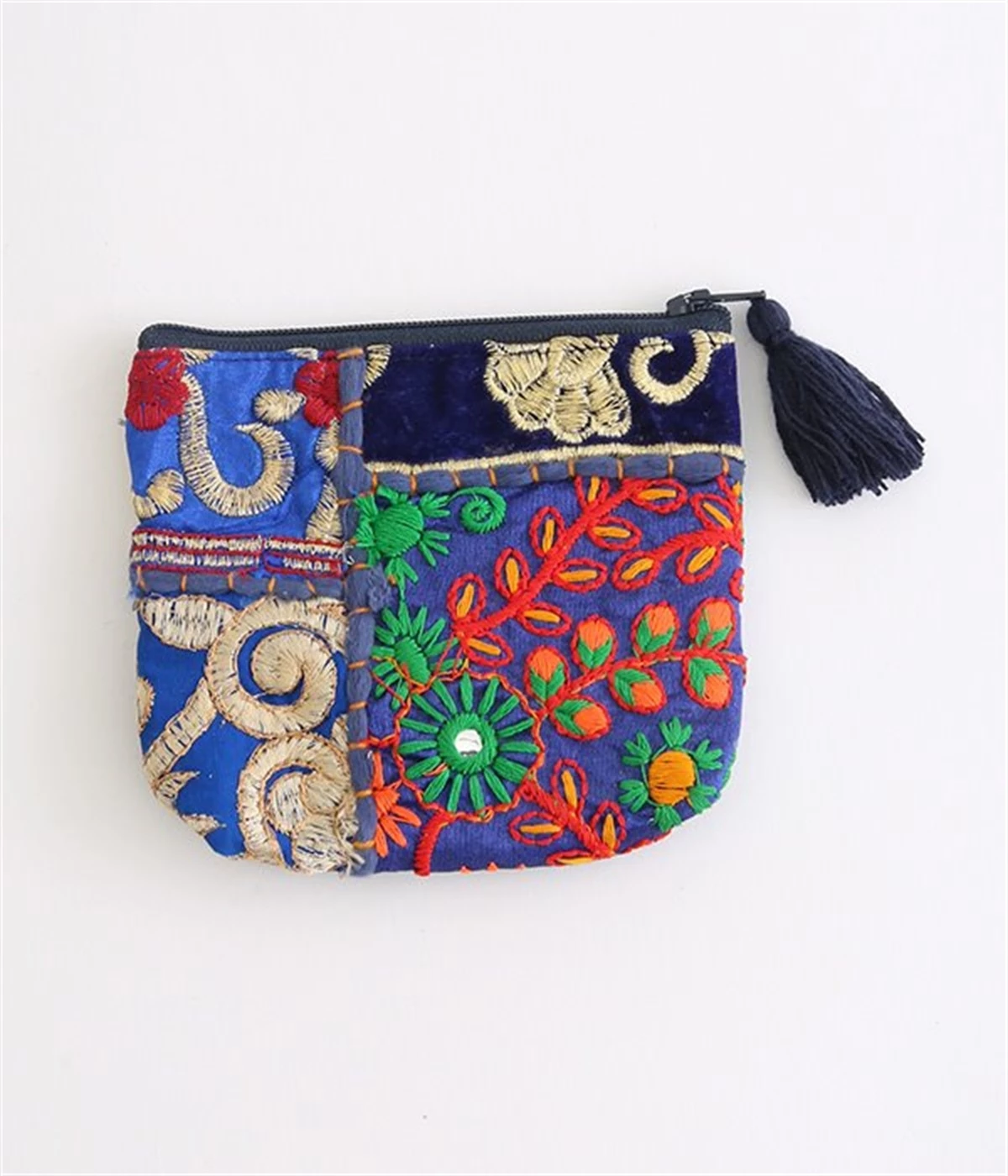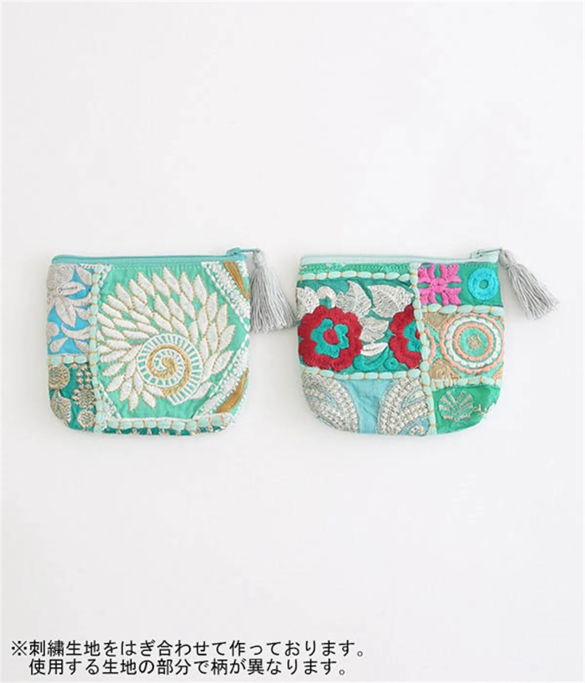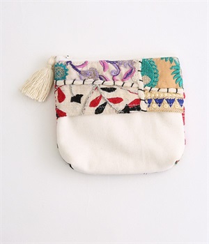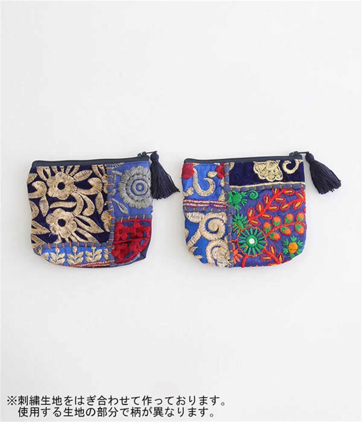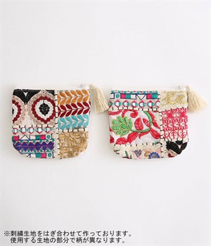 インドの民族衣装サリーをはじめとする伝統的な刺しゅう生地をはぎ合わせて作ったポーチ。ひとつひとつ異なる柄の組み合わせが楽しめます。ポケットティッシュがすぐに取り出せて、ポーチの中にはリップクリームや絆創膏などの必要なものが収納可能。ファスナーについたフリンジがかわいらしいアクセントを添えています。贈り物にもおすすめです。