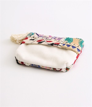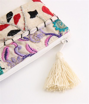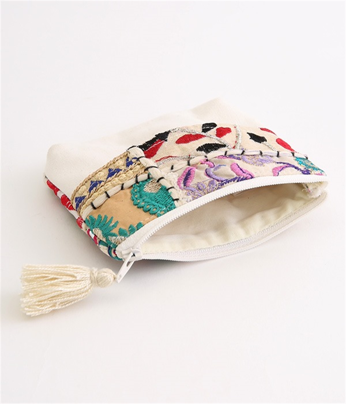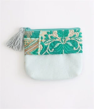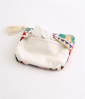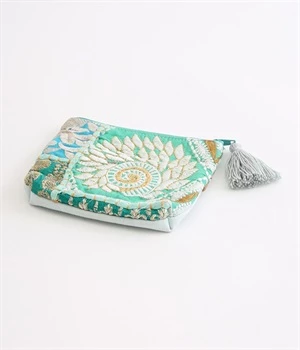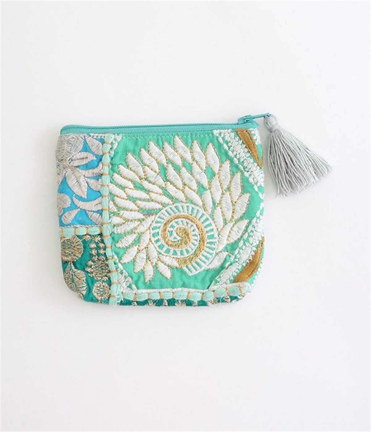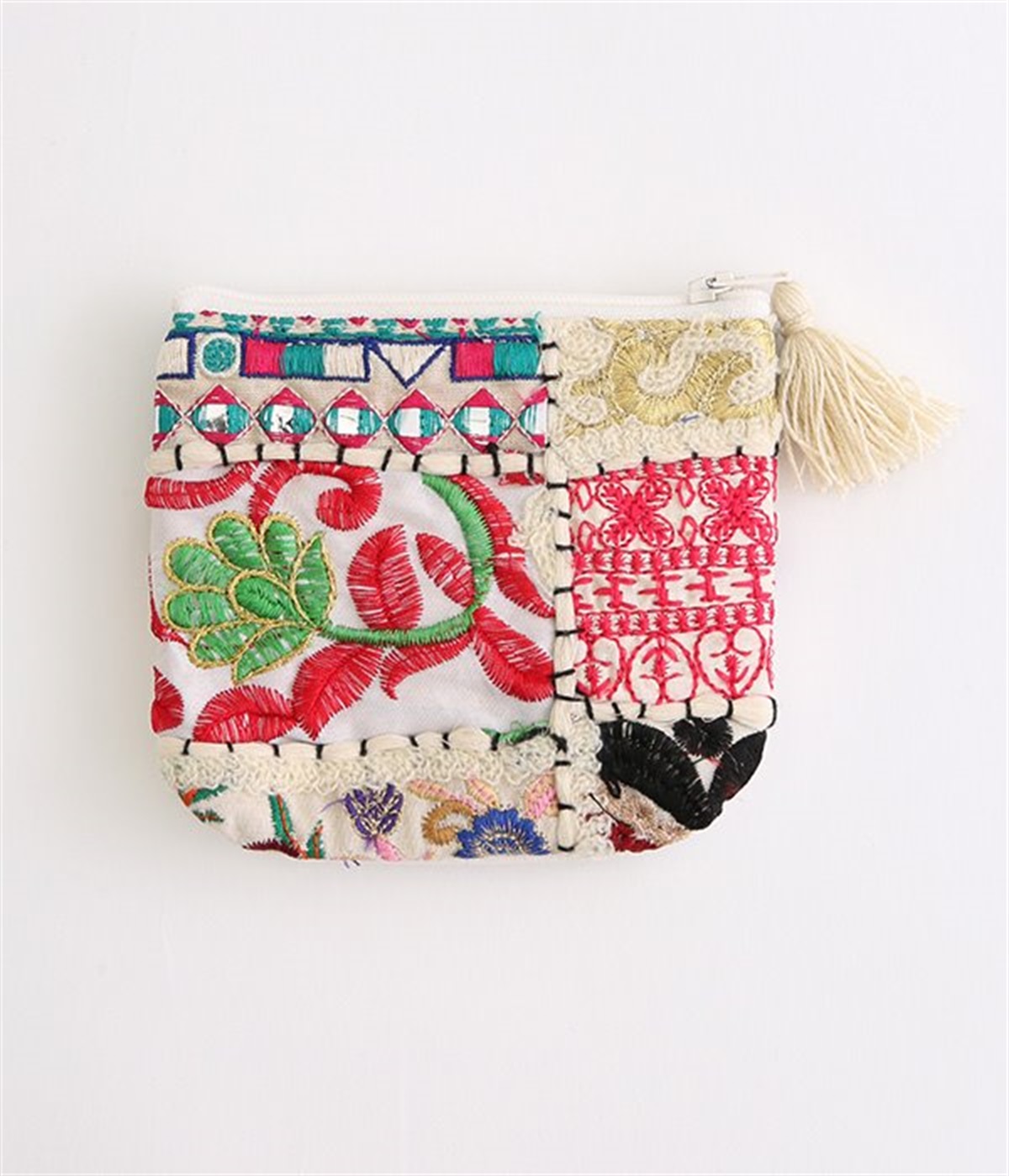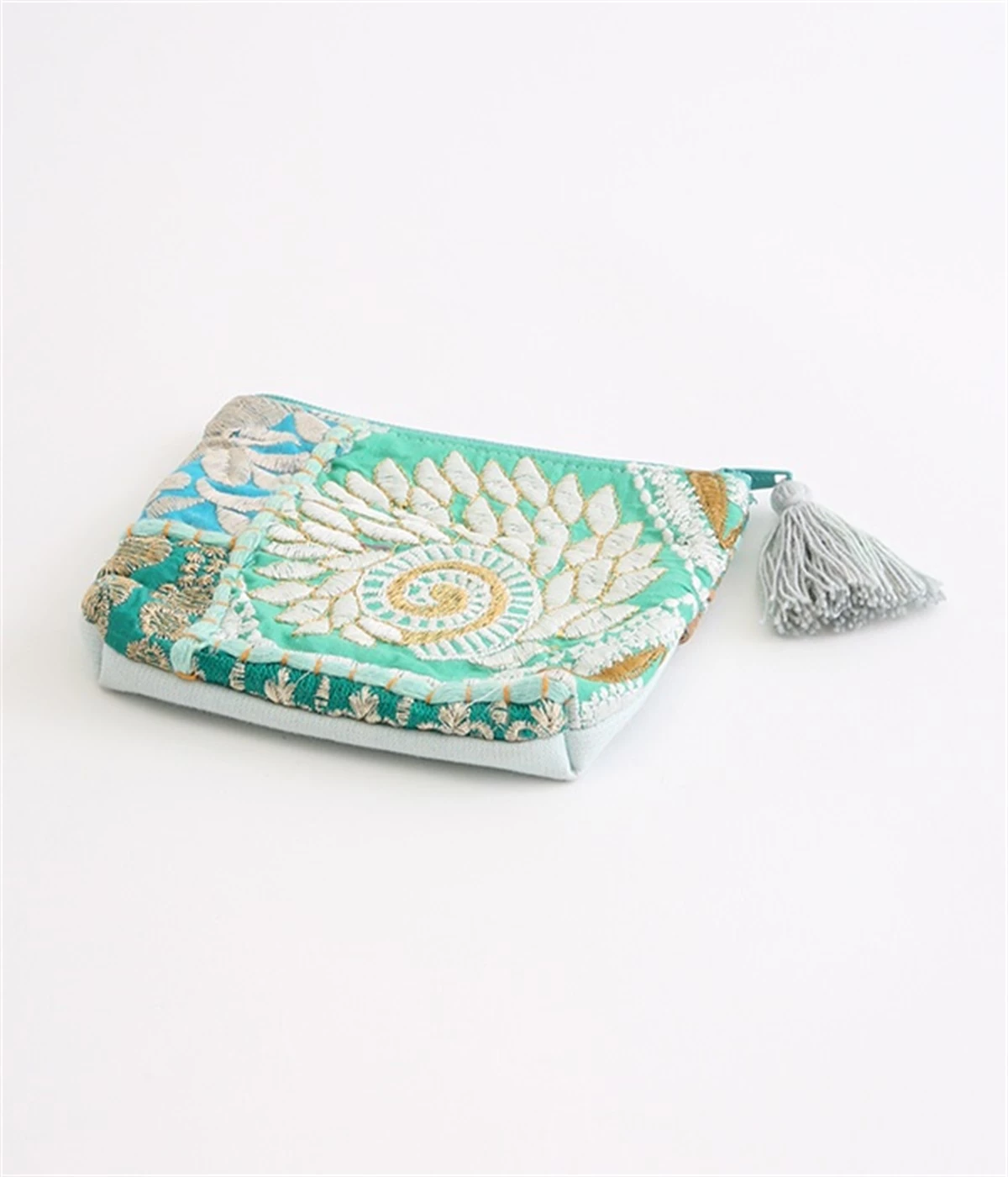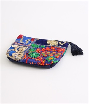 インドの民族衣装サリーをはじめとする伝統的な刺しゅう生地をはぎ合わせて作ったポーチ。ひとつひとつ異なる柄の組み合わせが楽しめます。ポケットティッシュがすぐに取り出せて、ポーチの中にはリップクリームや絆創膏などの必要なものが収納可能。ファスナーについたフリンジがかわいらしいアクセントを添えています。贈り物にもおすすめです。