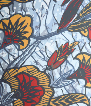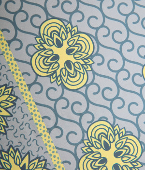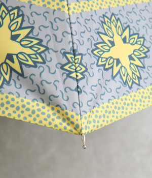 サテン調の光沢感ある生地にアフリカンプリントをのせました。生地の裏面にはポリウレタンコーティングをほどこして紫外線のカット率を高め、軽量なグラスファイバーを親骨に使用しています。