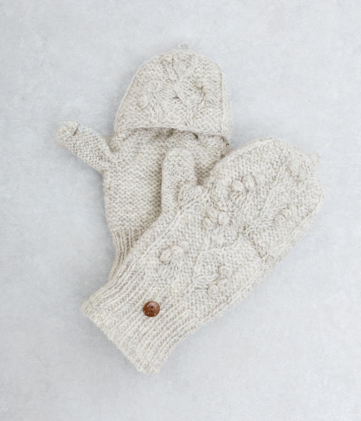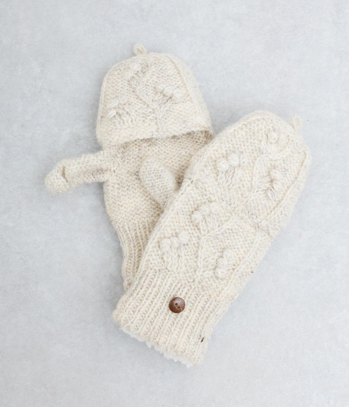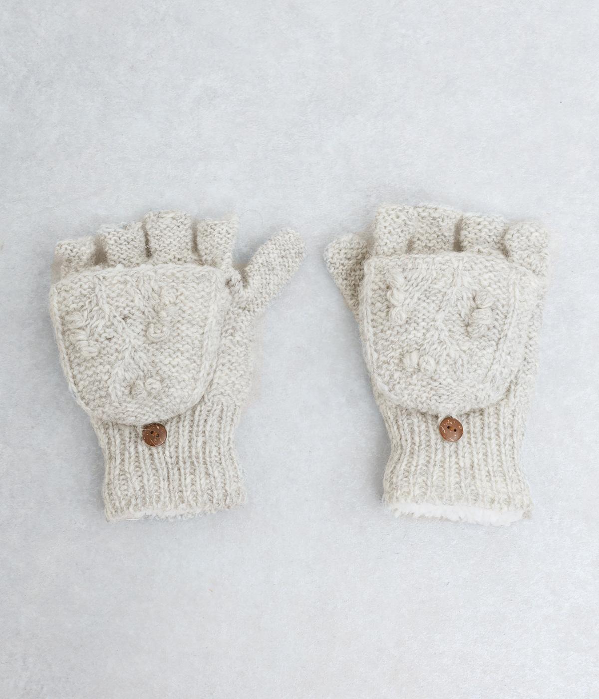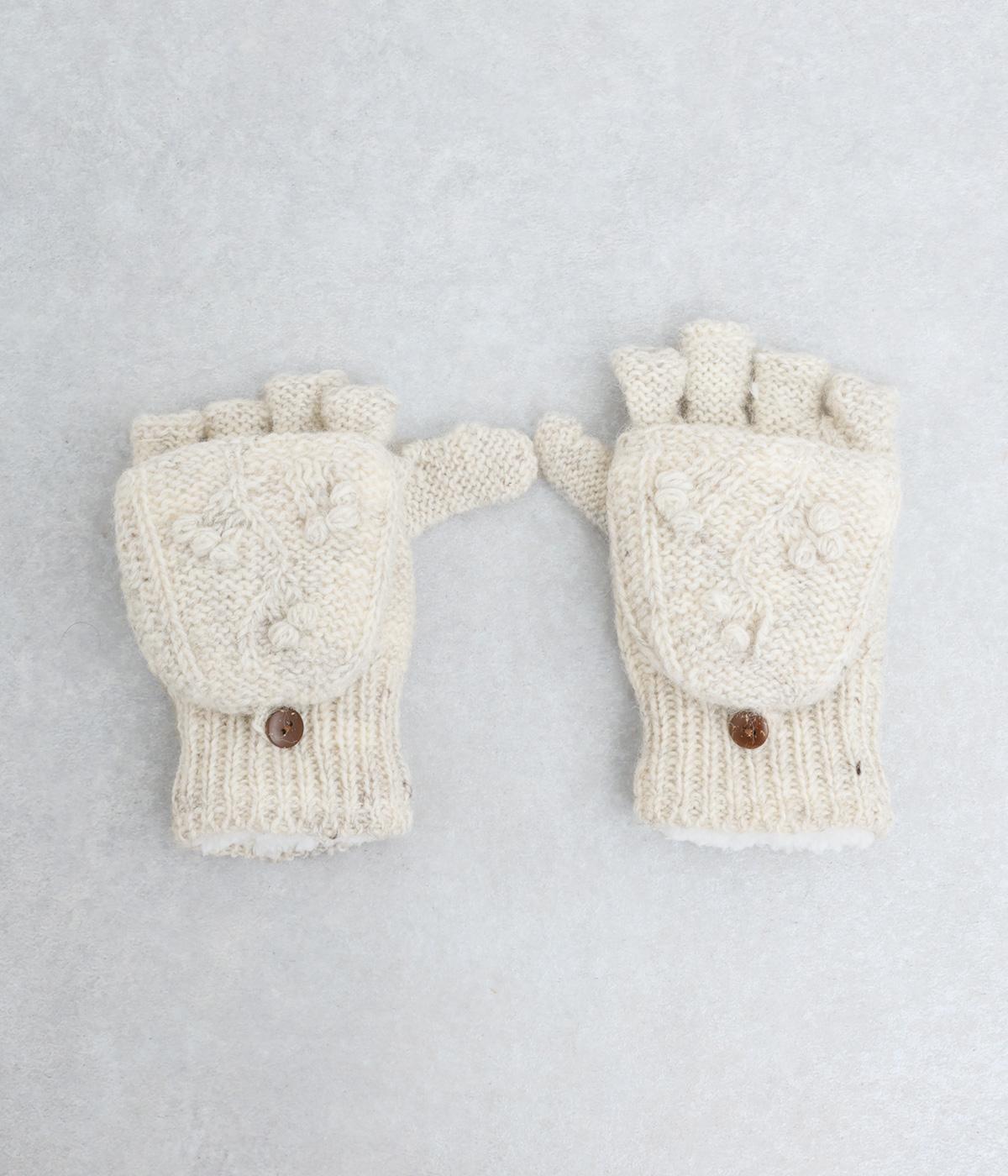 ネパールで一つ一つ丁寧に作られたやさしさ溢れるグローブです。人差し指から小指まではカバーの取り外しが可能。スマートフォン操作や小さな手作業がイージーです。親指部分には小さな穴が開いており、指先を出すこともできます。かわいらしく愛らしい手袋です。