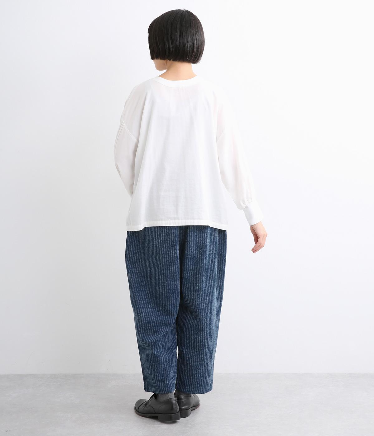 裾ダーツでころんとしたシルエットが可愛らしさのあるインディゴのカーブパンツ。カジュアルなデイリースタイルに取り入れやすく、さり気なく印象的に魅せてくれます。すっきりとした丈感も◎。ウエストはオールゴム&内紐のイージー仕立て。