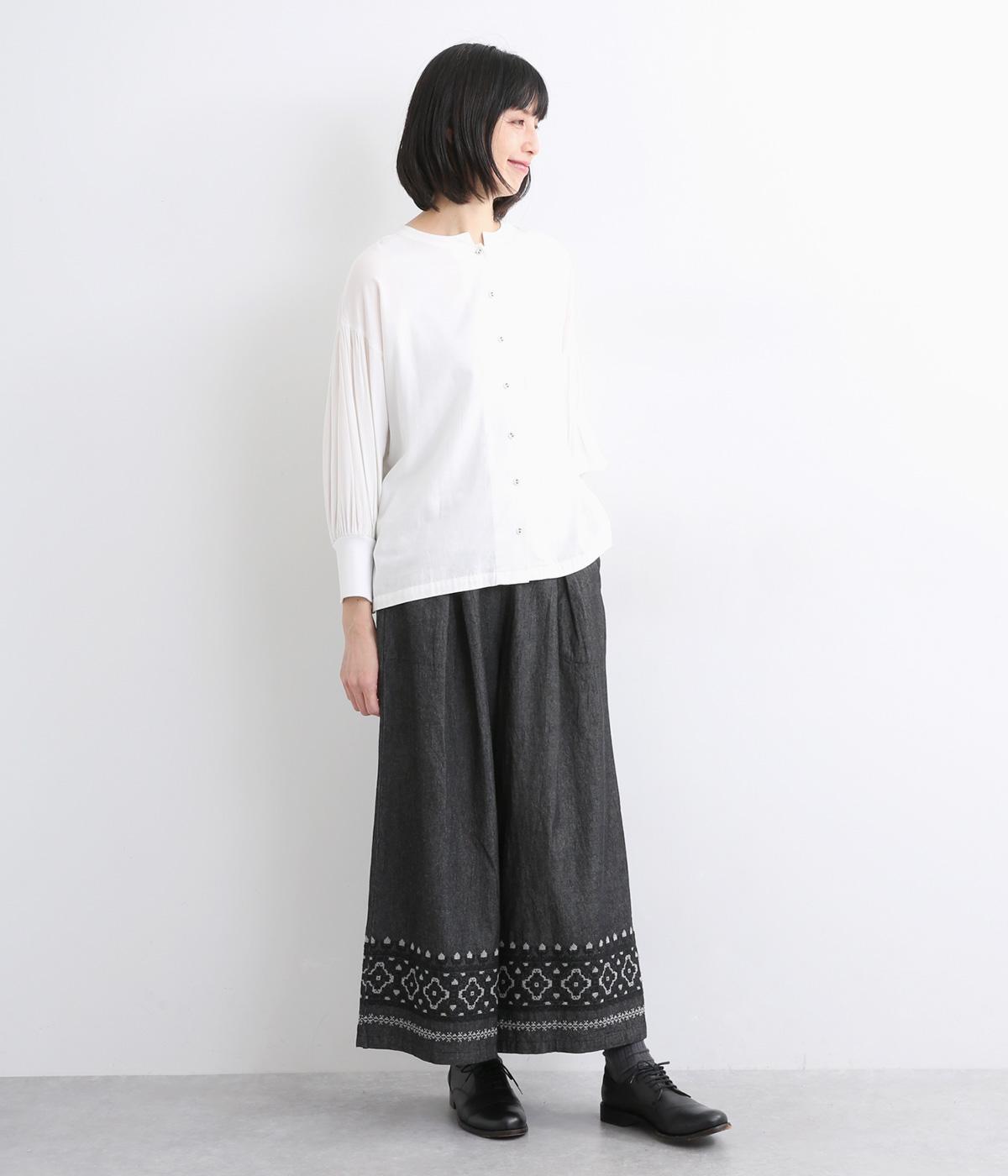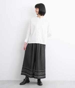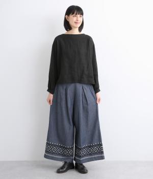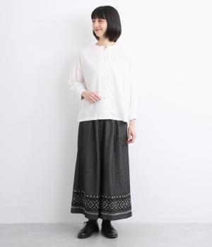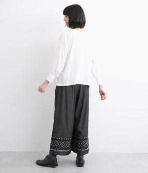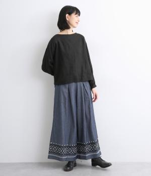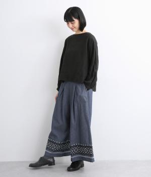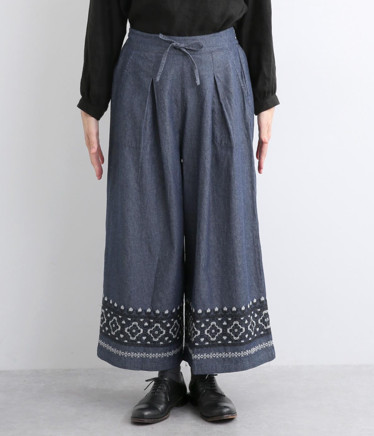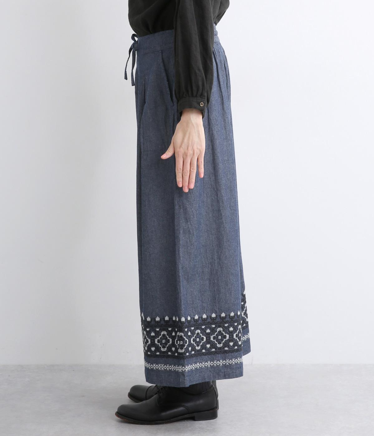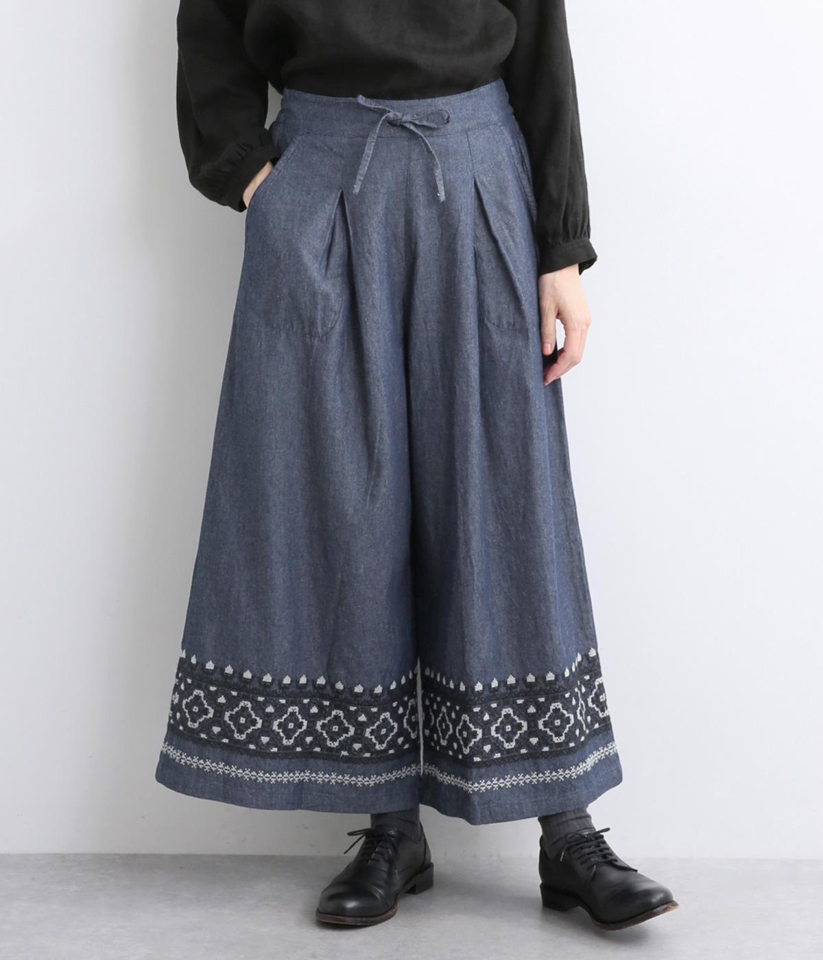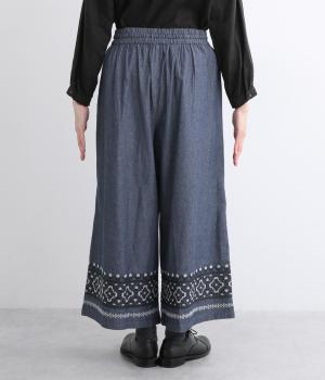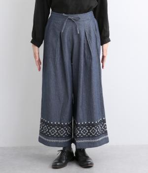 エスニック調の幾何学刺しゅうをたっぷりとほどこして、カジュアルなアイテムに異国のムードを添えました。デイリースタイルに取り入れやすくも、ぐっとお洒落感を上げてくれます。ウエストは後ろゴムに調整紐つきで、腰まわりをすっきり見せます。