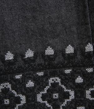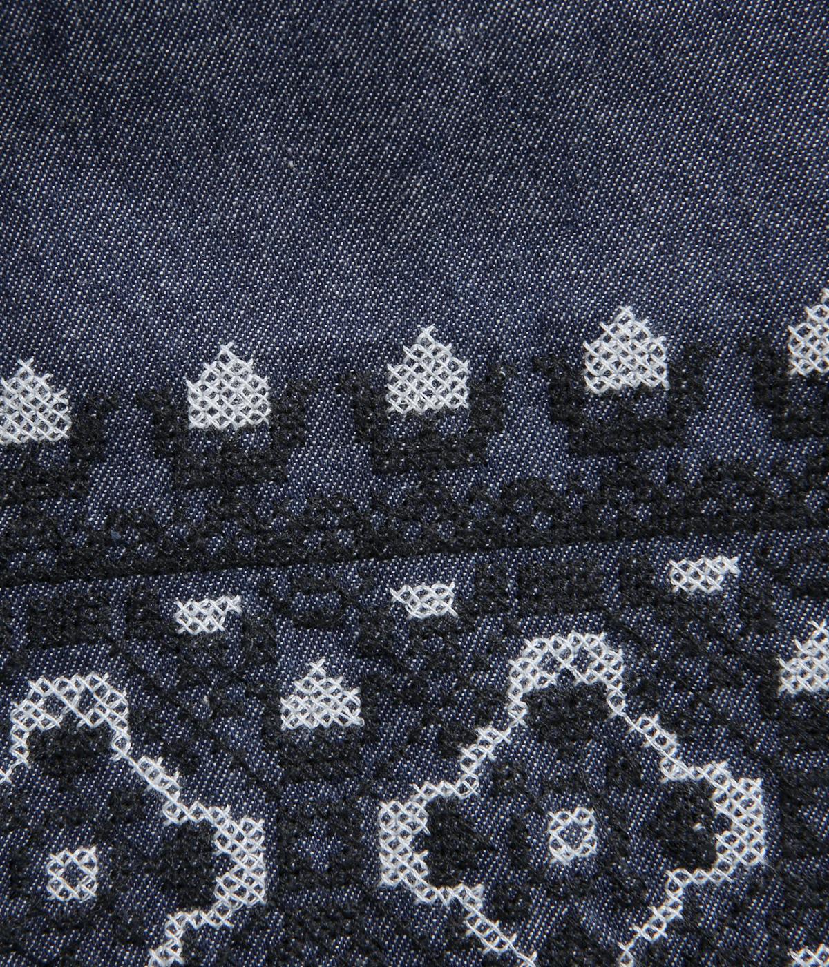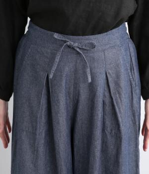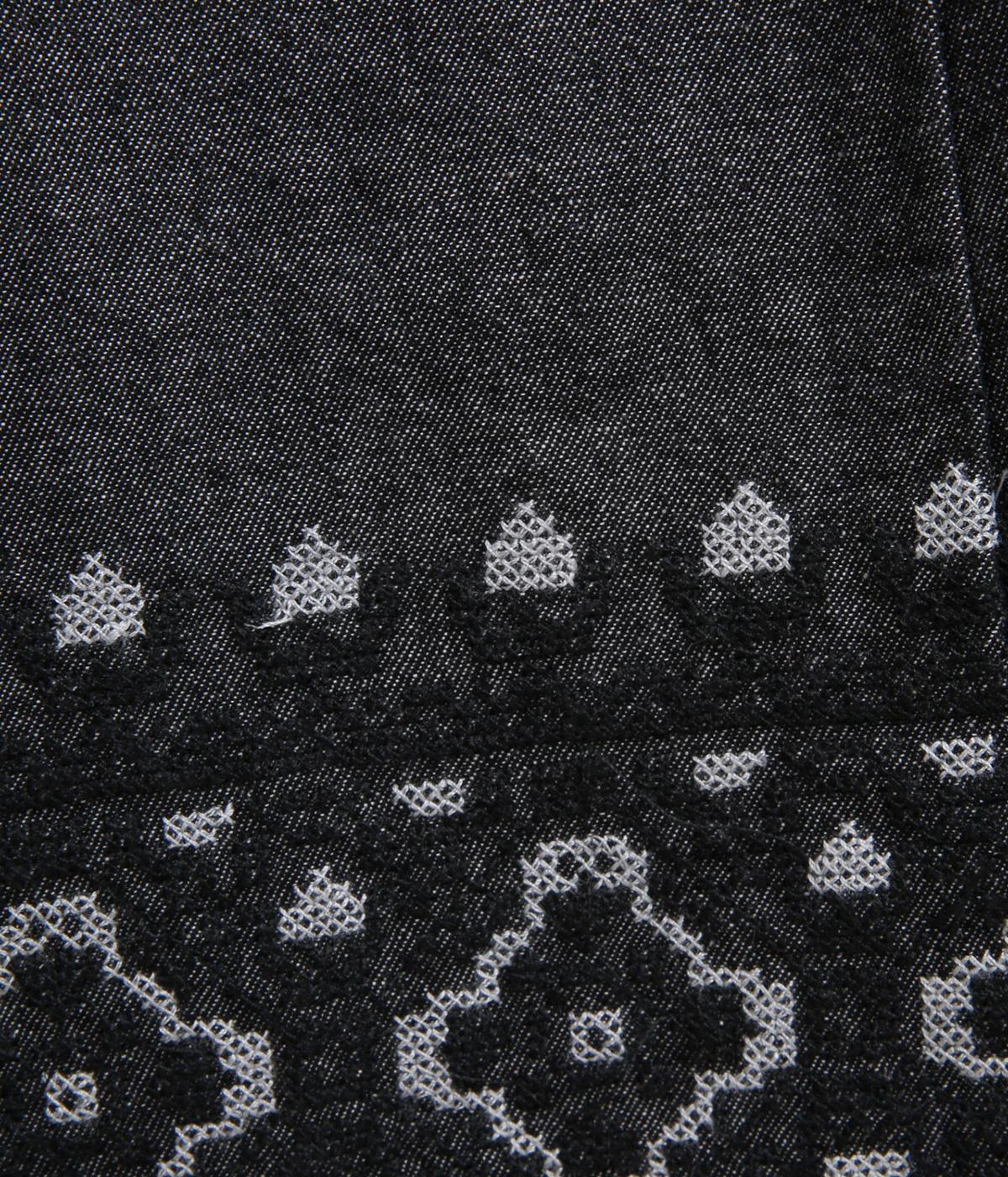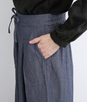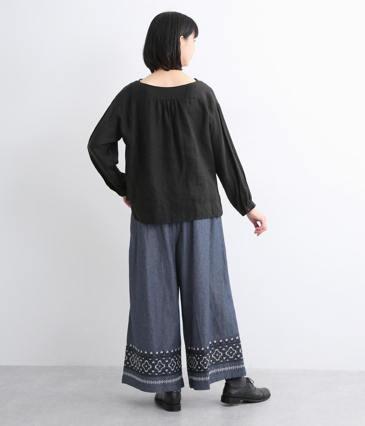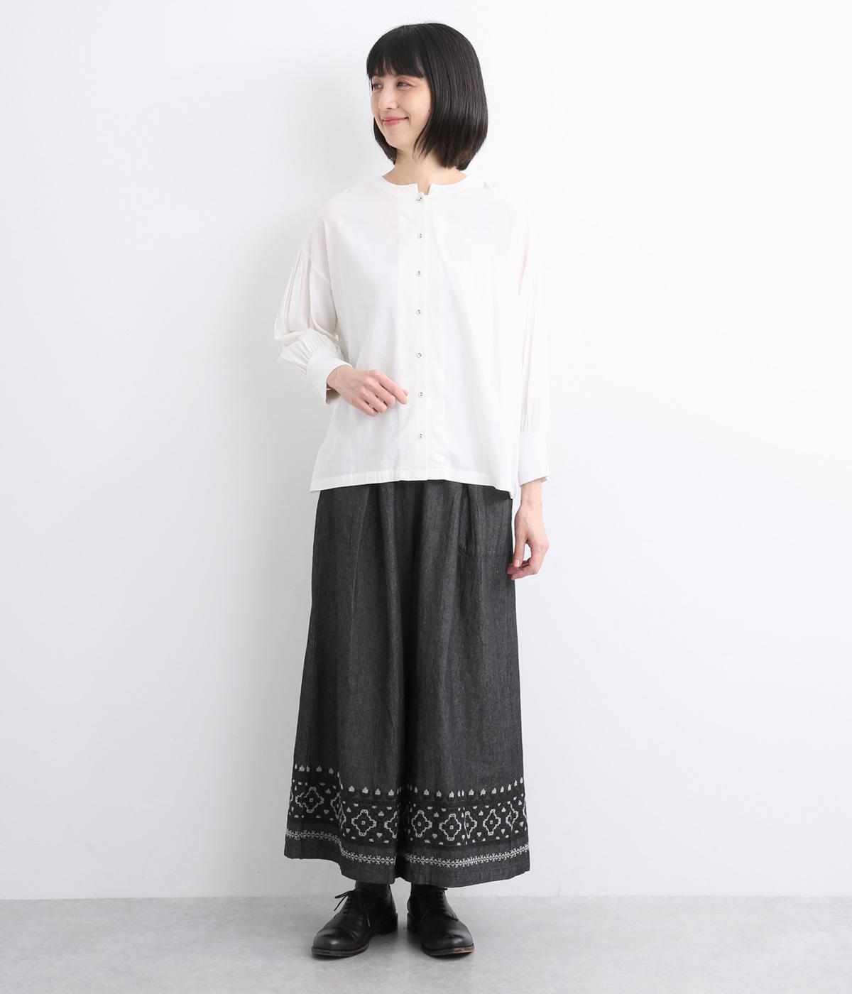 エスニック調の幾何学刺しゅうをたっぷりとほどこして、カジュアルなアイテムに異国のムードを添えました。デイリースタイルに取り入れやすくも、ぐっとお洒落感を上げてくれます。ウエストは後ろゴムに調整紐つきで、腰まわりをすっきり見せます。
