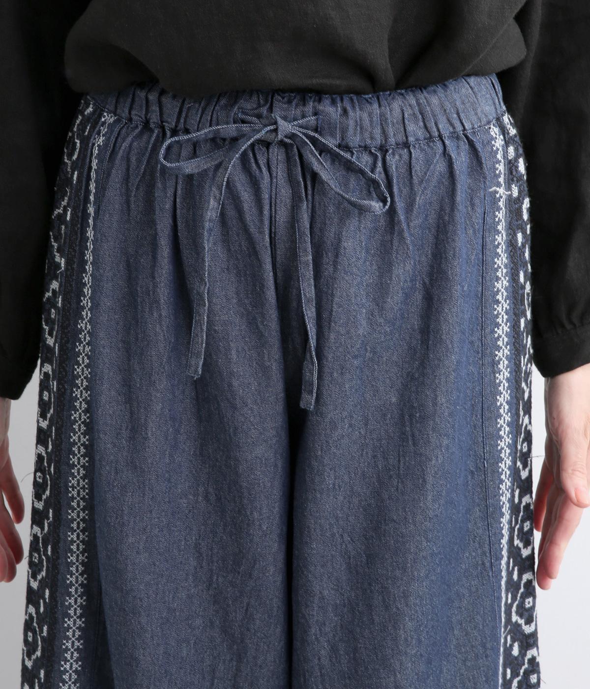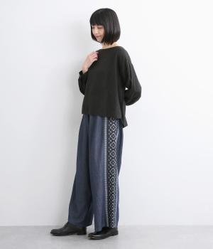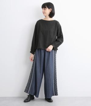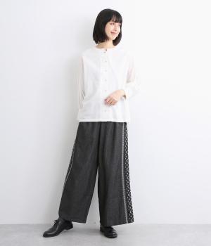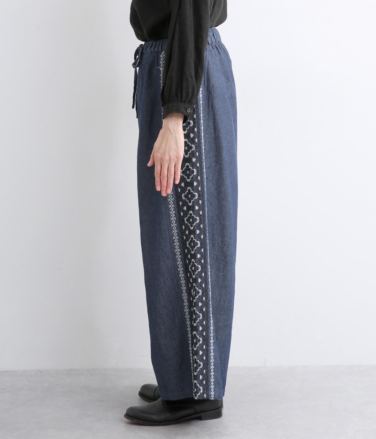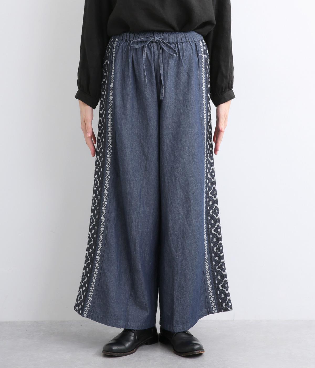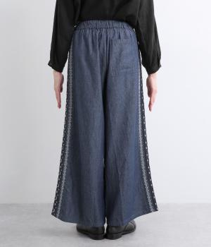 両サイドにエスニック調の幾何学刺しゅうを添えて、異国ムード漂うワイドパンツが完成。デイリースタイルにもなじみやすく、メンズライクな装いにもはまります。ウエストはオールゴム&調整紐つきです。