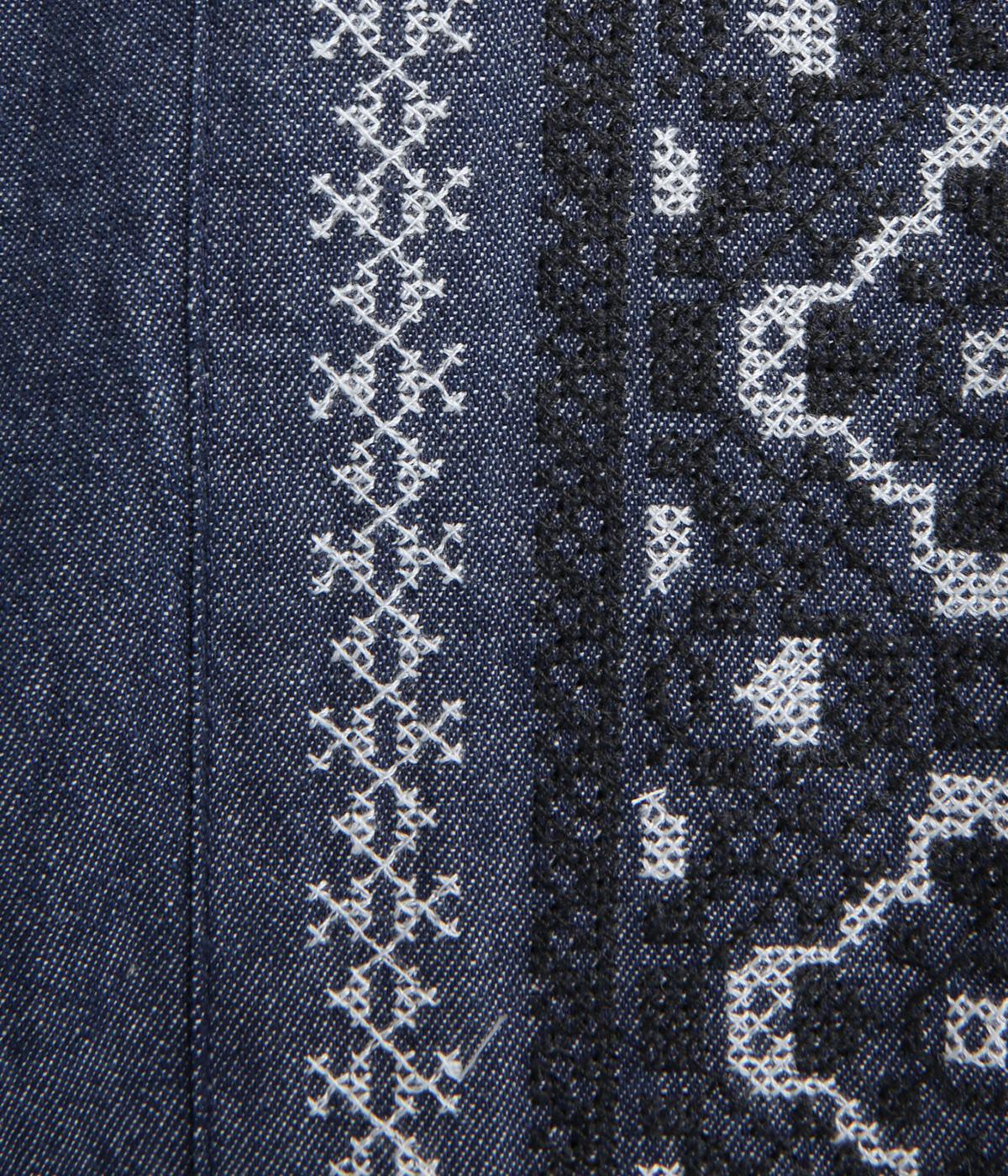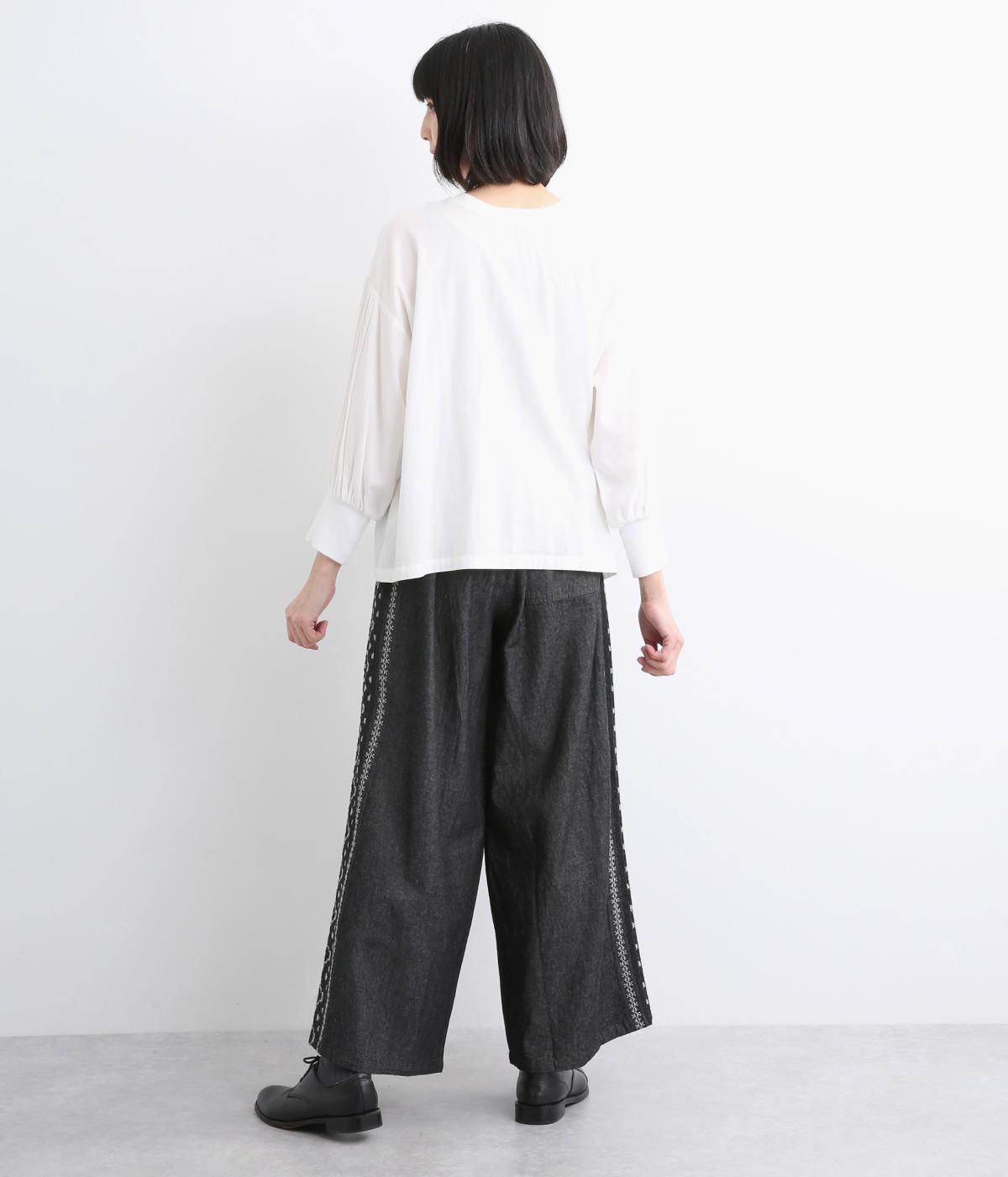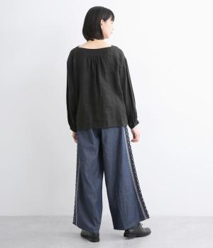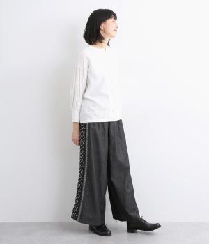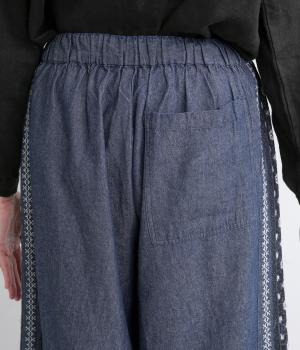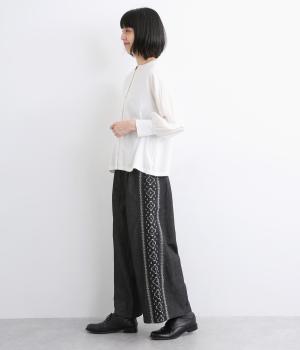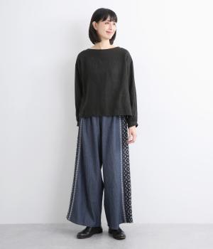 両サイドにエスニック調の幾何学刺しゅうを添えて、異国ムード漂うワイドパンツが完成。デイリースタイルにもなじみやすく、メンズライクな装いにもはまります。ウエストはオールゴム&調整紐つきです。