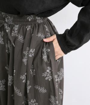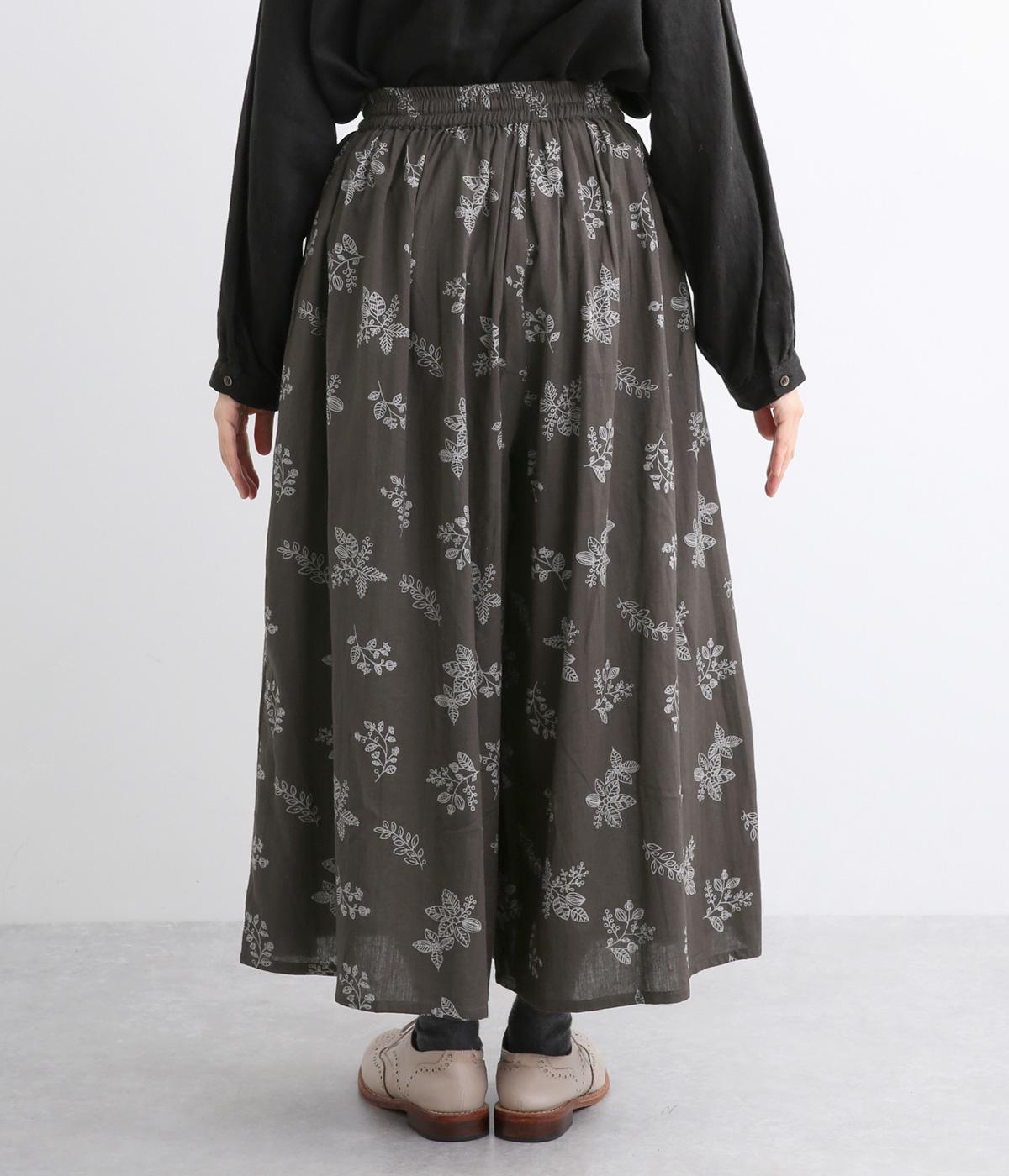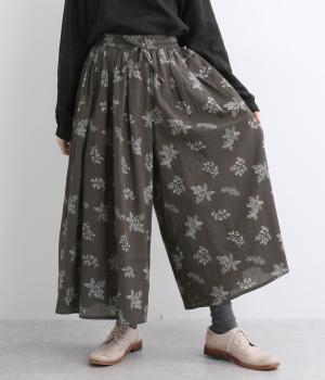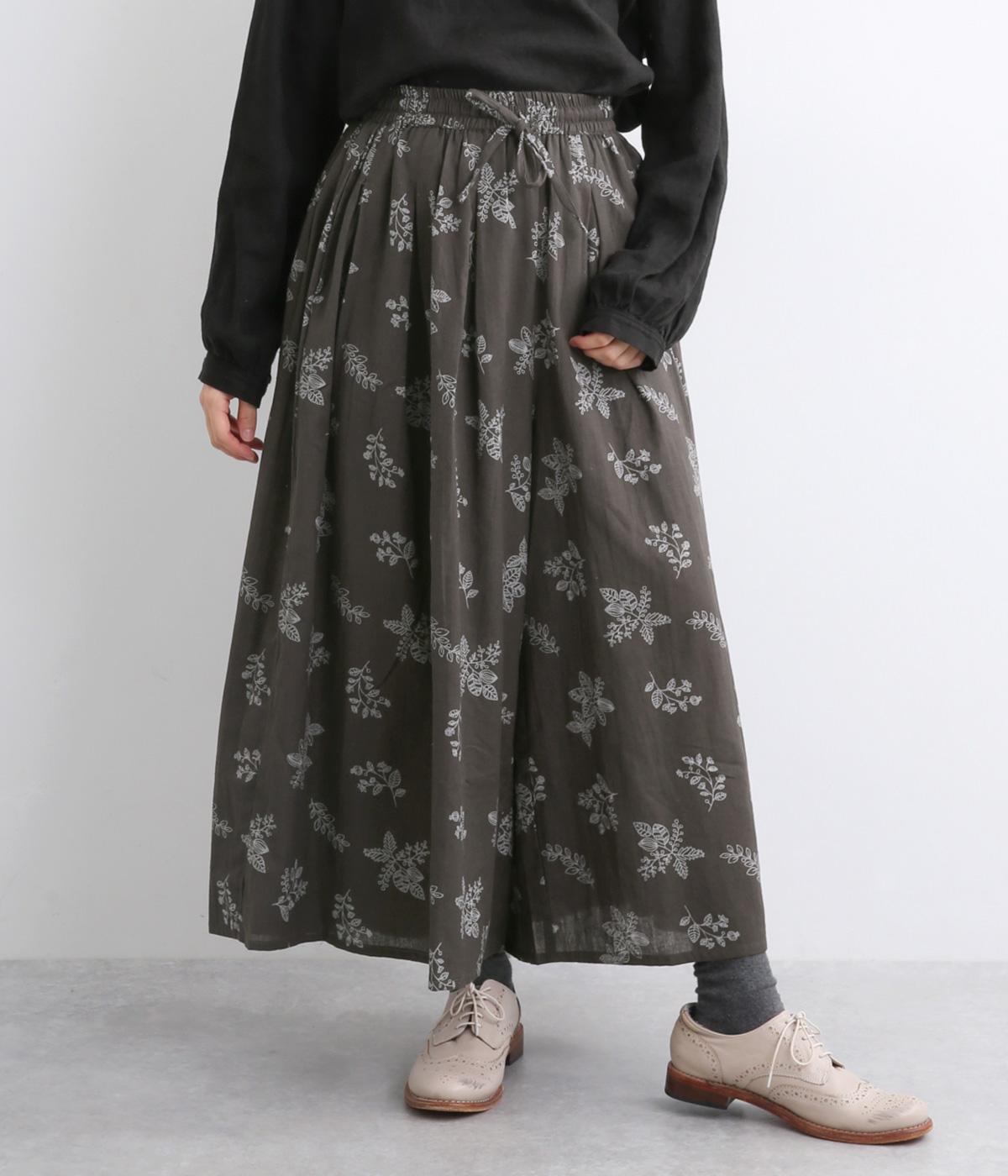 落ち着いたカラーがナチュラルな雰囲気を惹き立てるパンツ。スカート見えするゆったりとしたフレアシルエットが魅力で、長すぎないすっきりとした丈が◎。ウエストは調整紐がついたオールゴムでデイリーに活躍します。