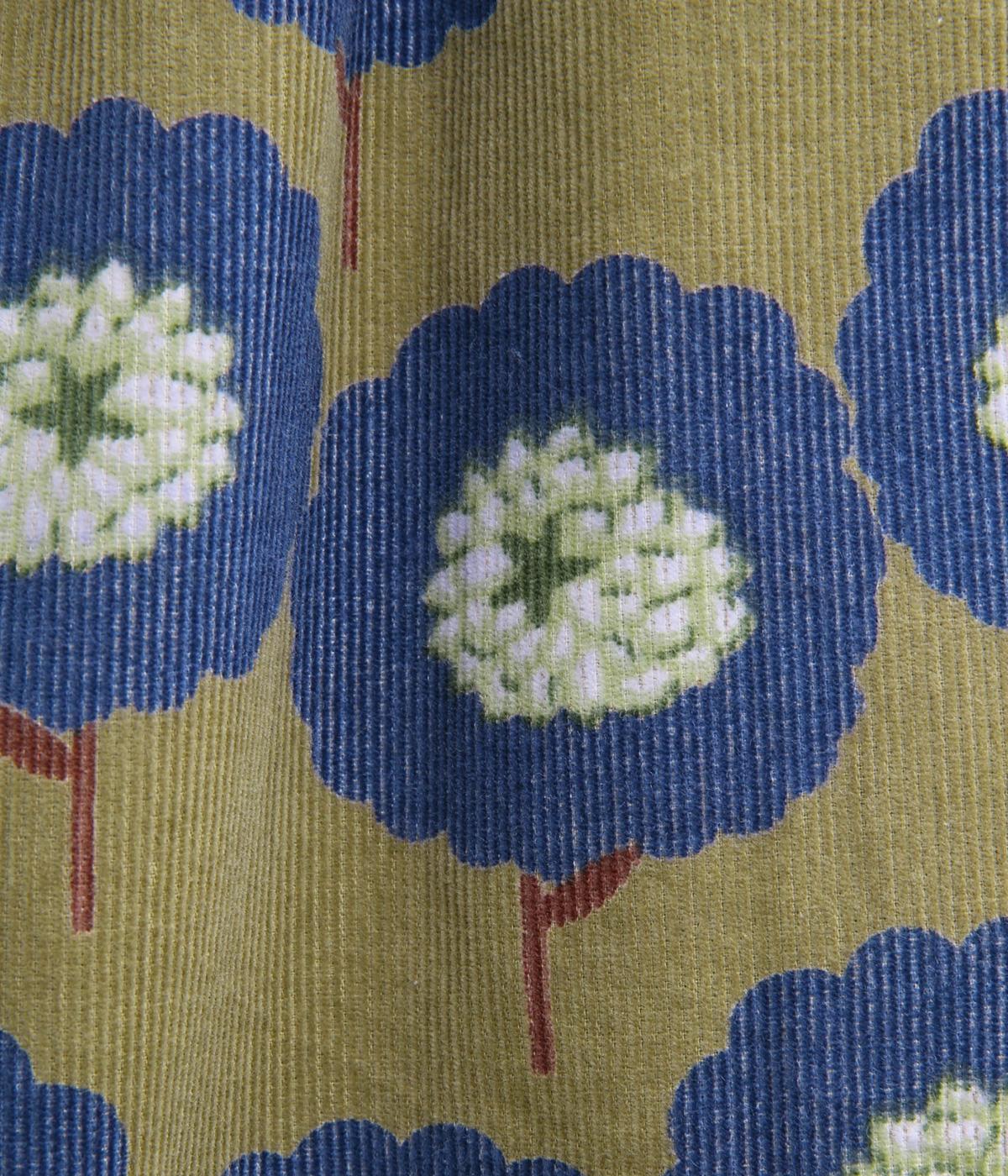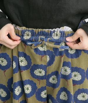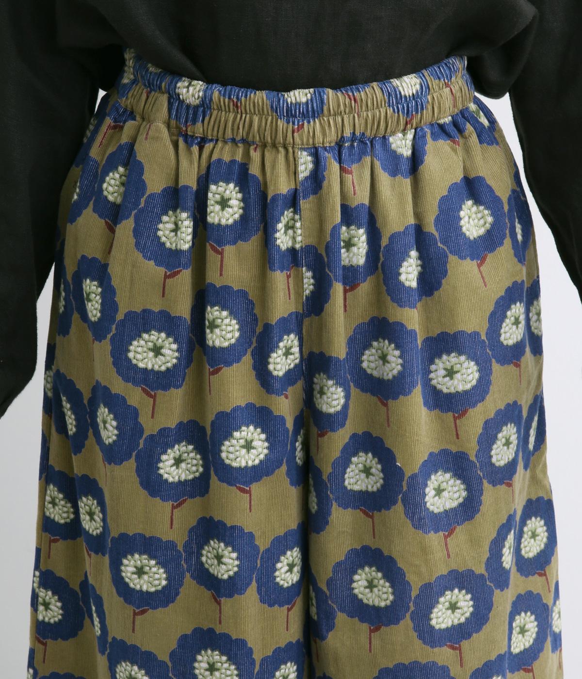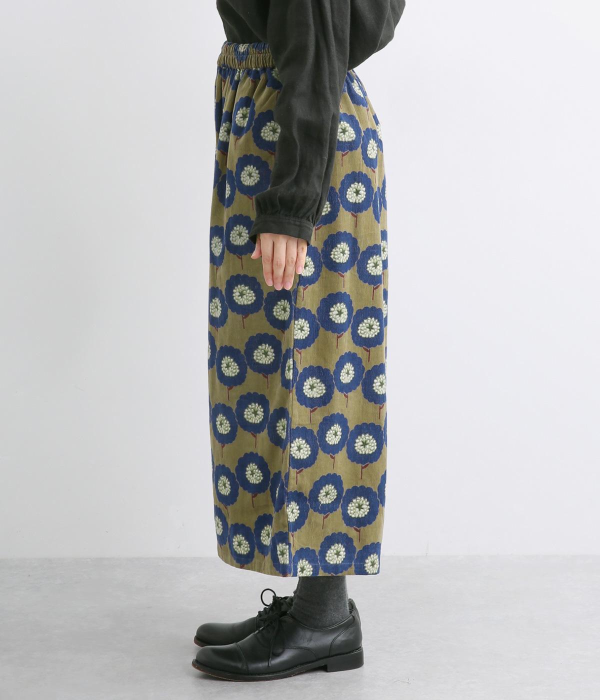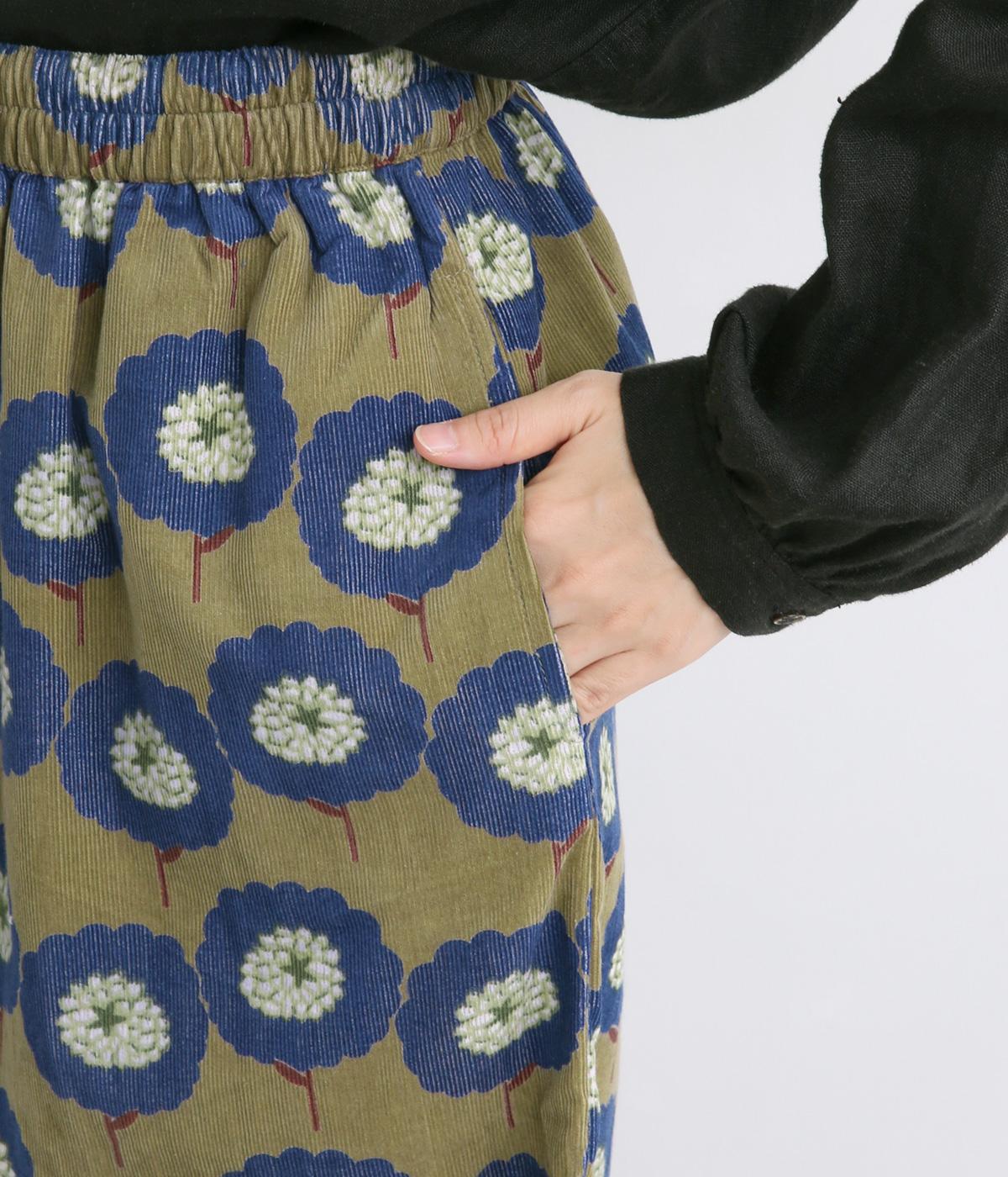 極細畝が特徴的なコットンコーデュロイ生地に、シンプルながらもインパクトのあるお花プリントをのせました。やわらかで肉厚すぎず、着用しやすい生地感です。