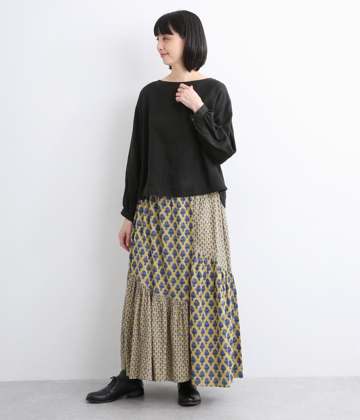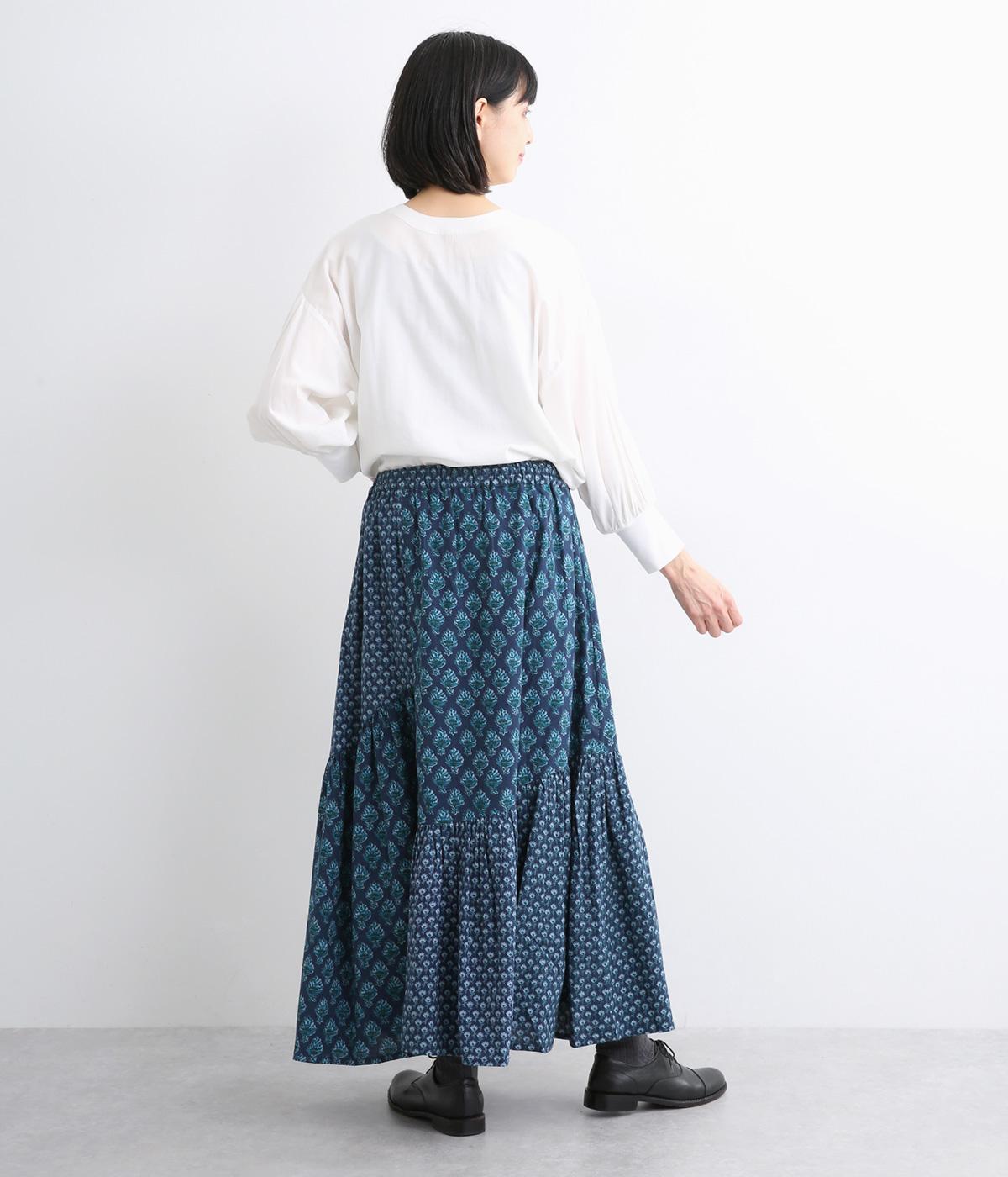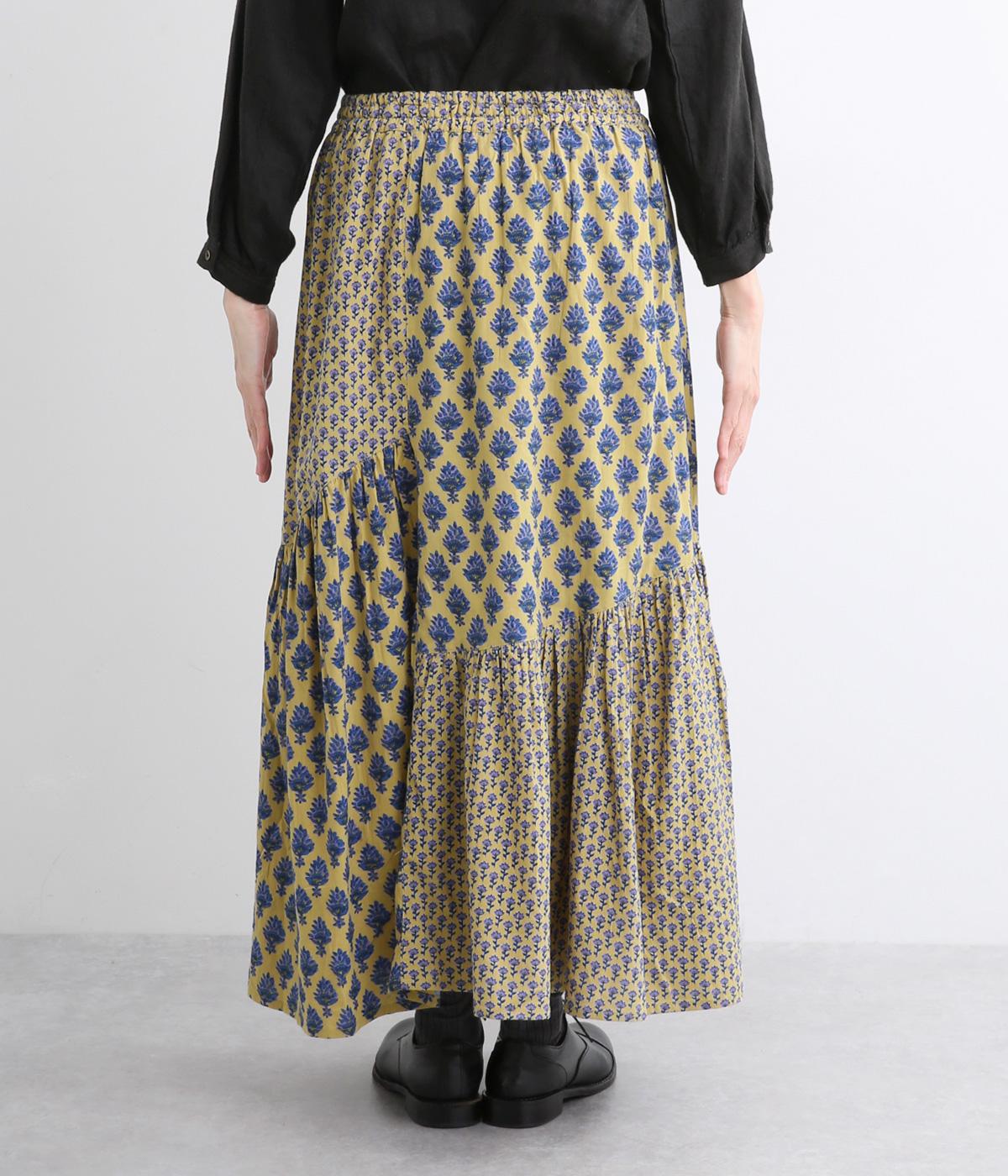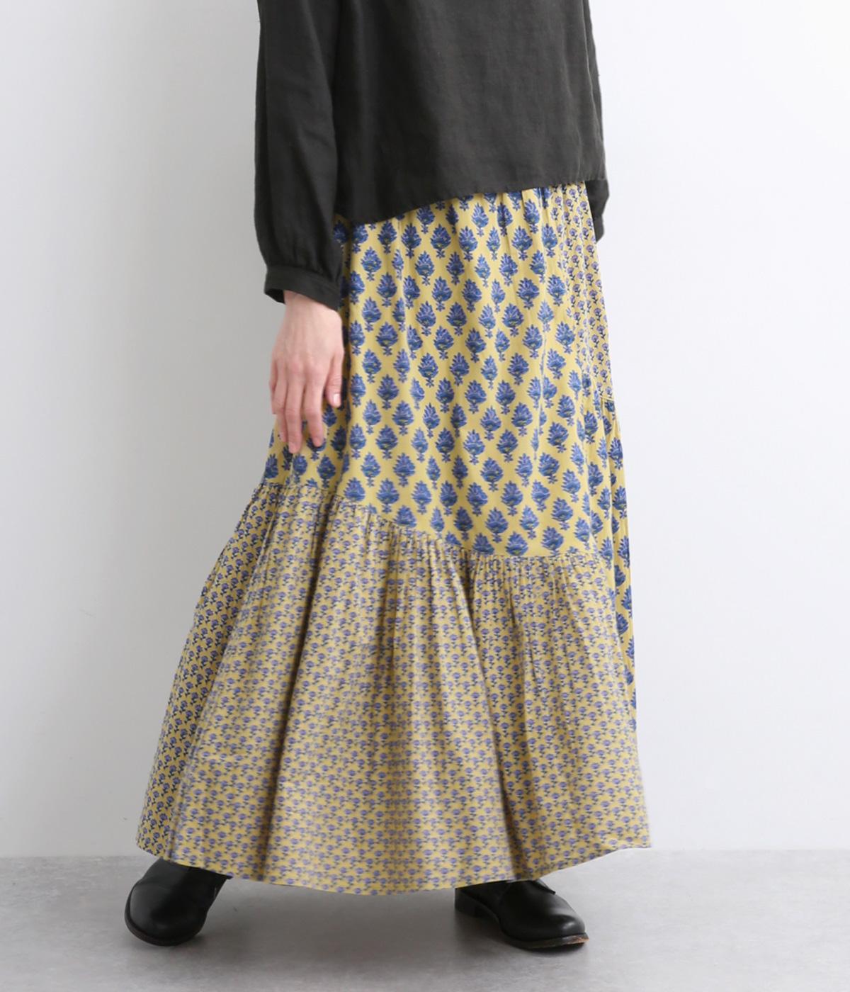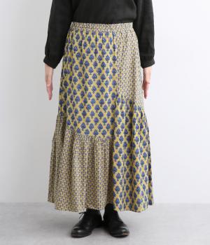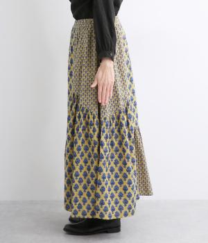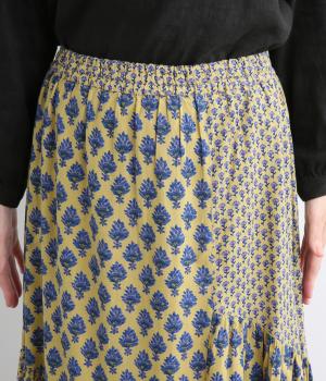 2種類のブロックプリント風ブーケ柄プリントが目を惹くスカート。上品さと可愛らしさのバランスが絶妙で、大人のデイリースタイルにとけこみながらも特別感のあるコーディネートに。ウエストはオールゴム&内紐つきでフィット感も◎。