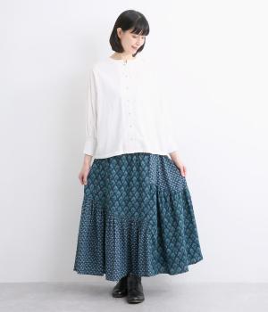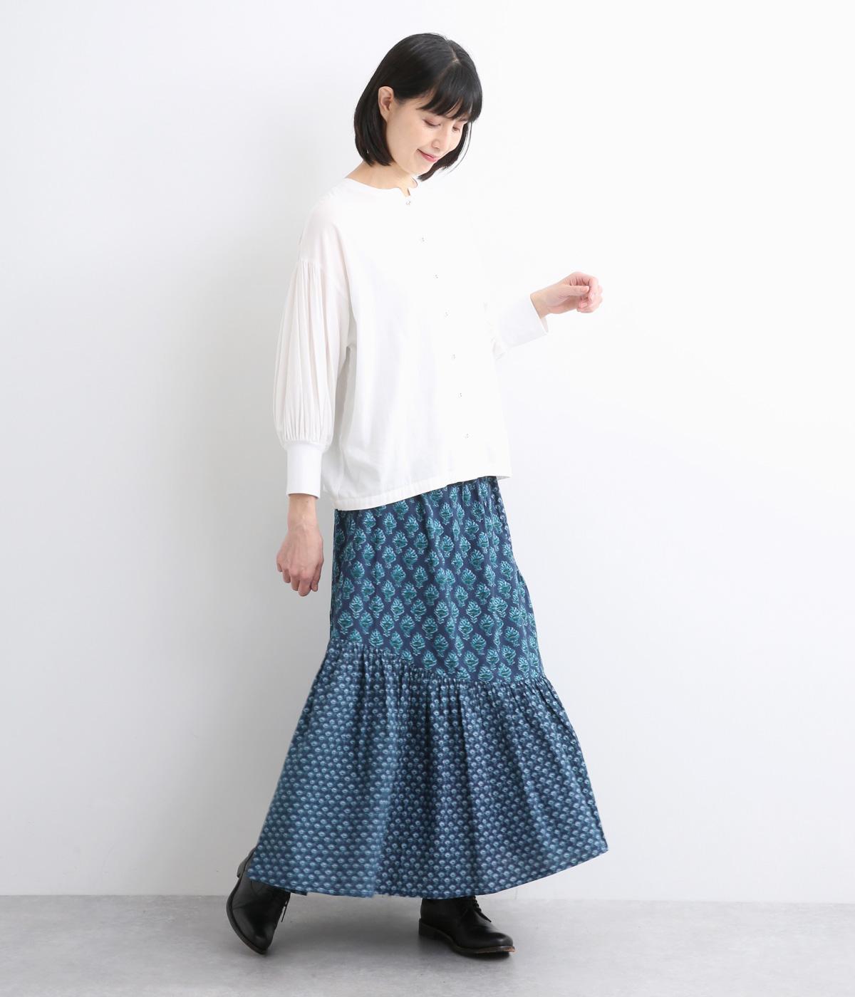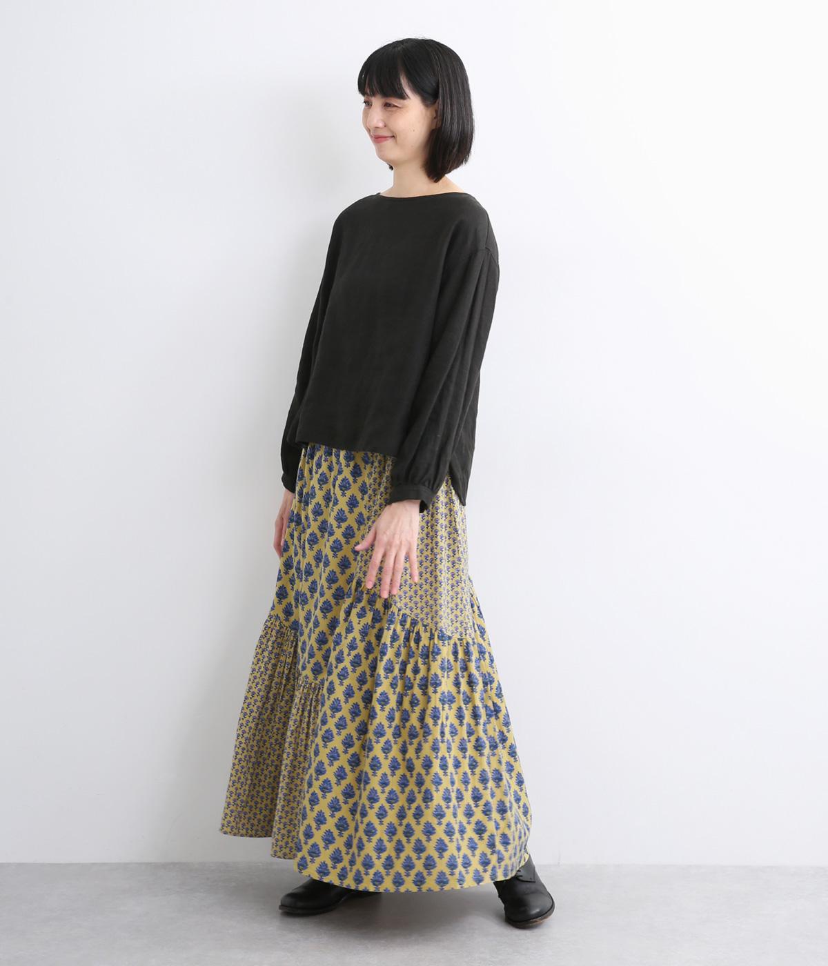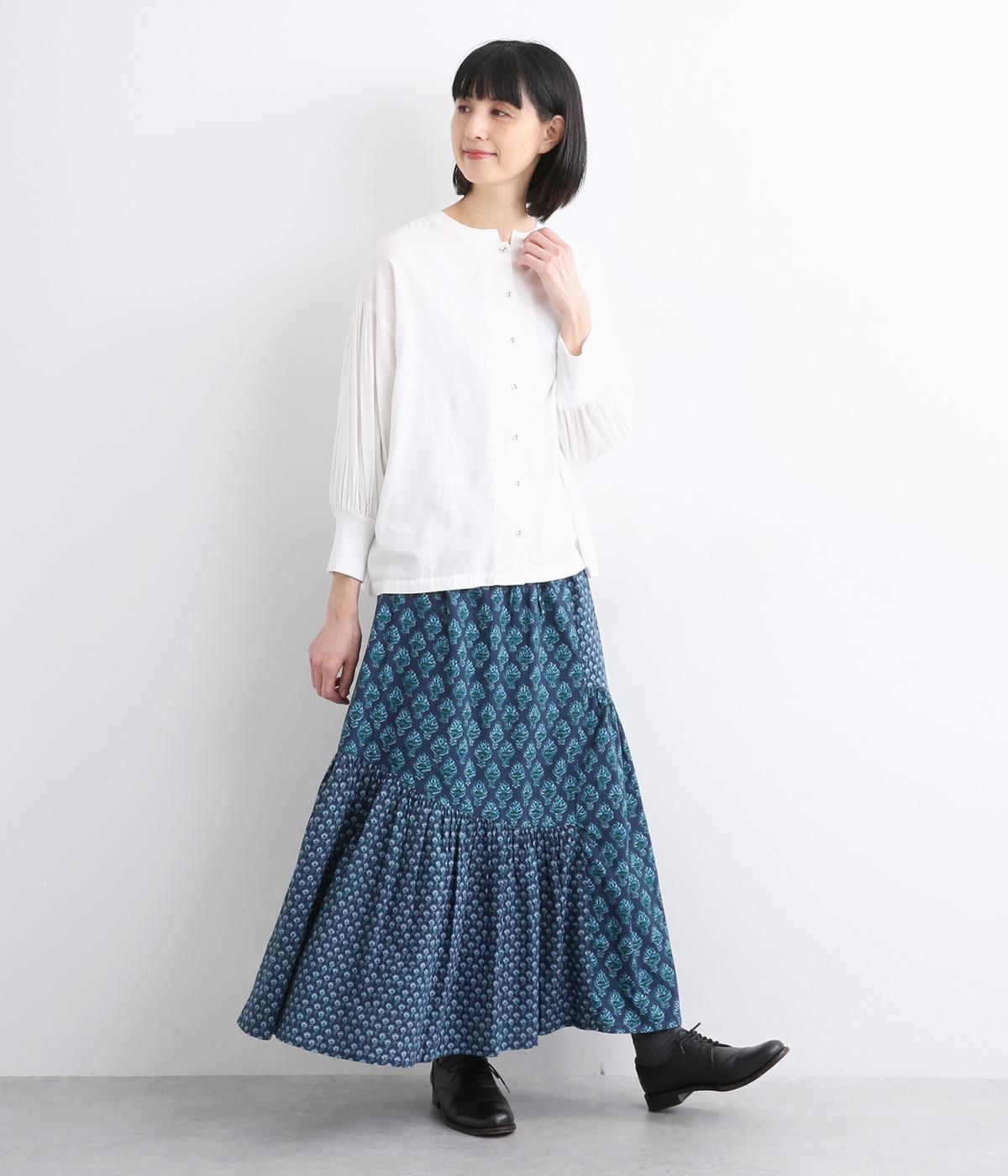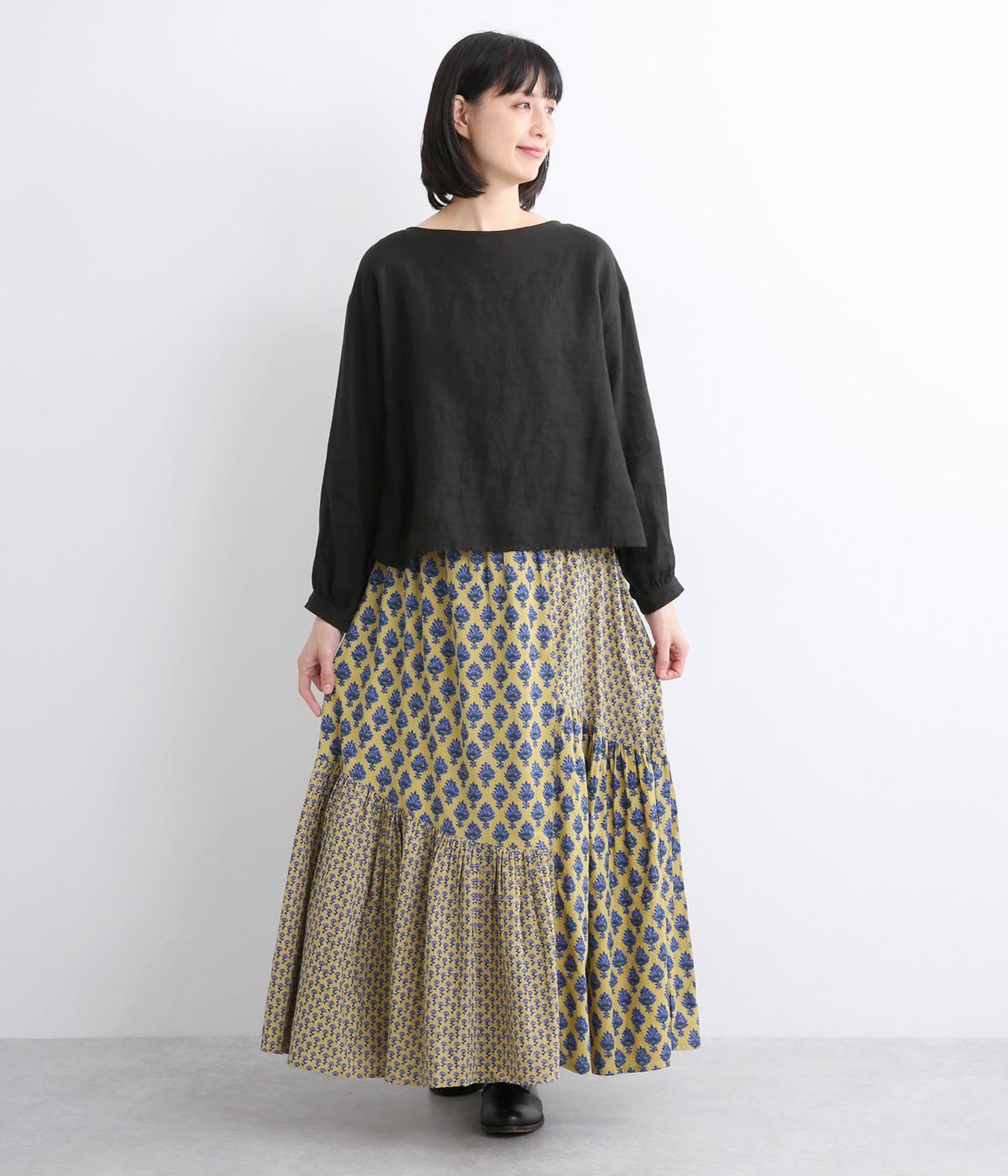 2種類のブロックプリント風ブーケ柄プリントが目を惹くスカート。上品さと可愛らしさのバランスが絶妙で、大人のデイリースタイルにとけこみながらも特別感のあるコーディネートに。ウエストはオールゴム&内紐つきでフィット感も◎。