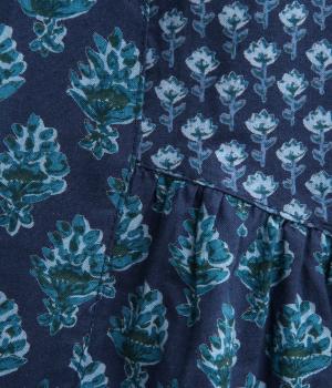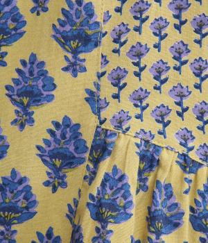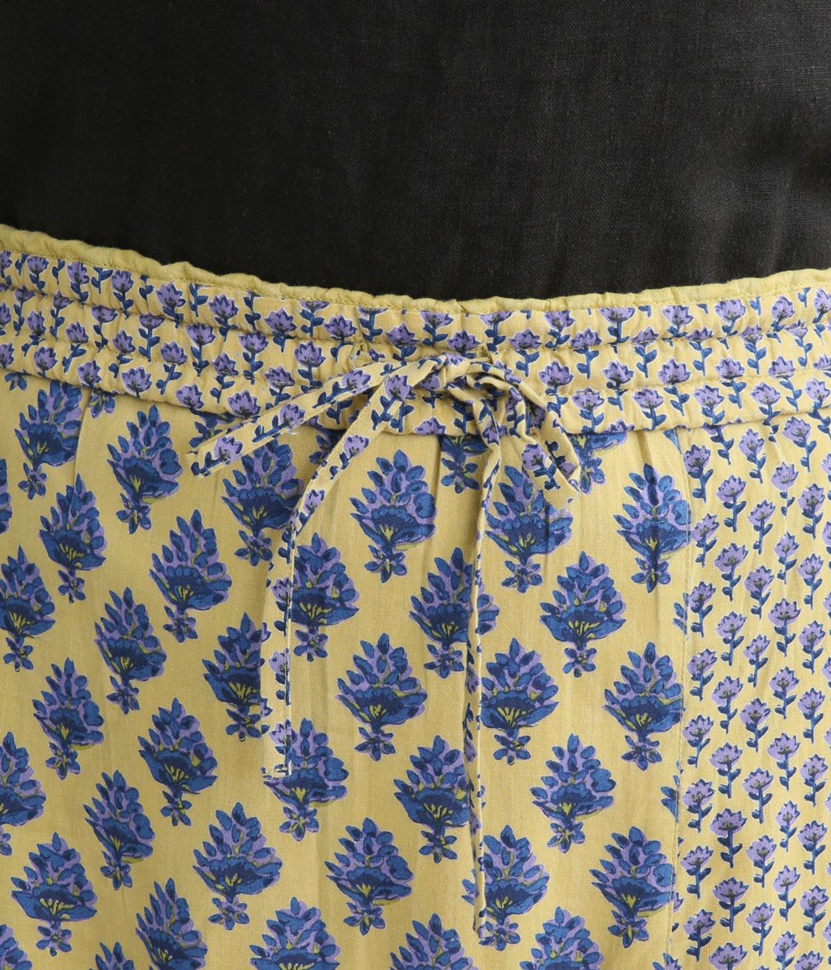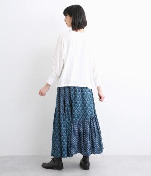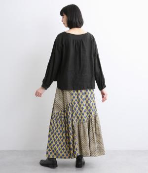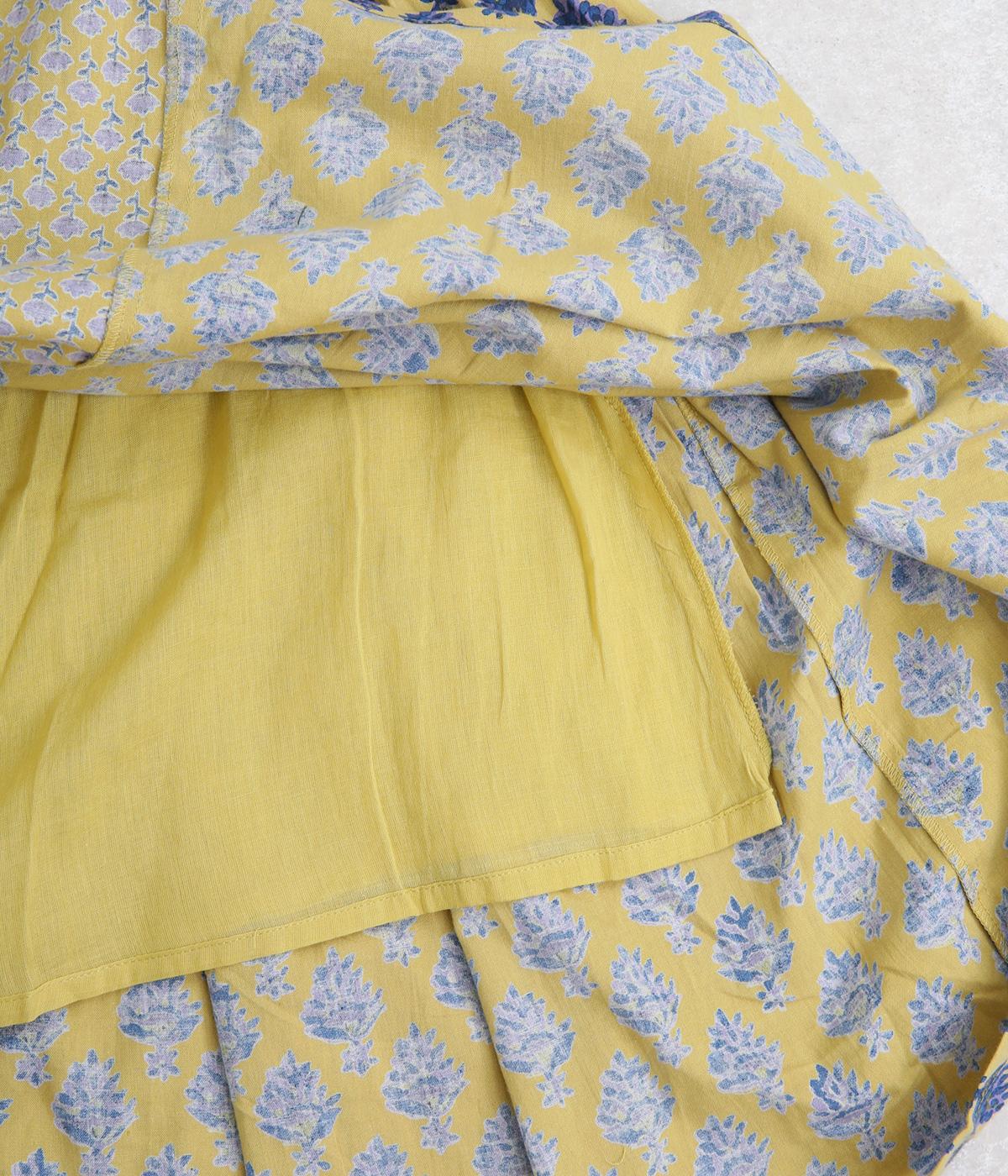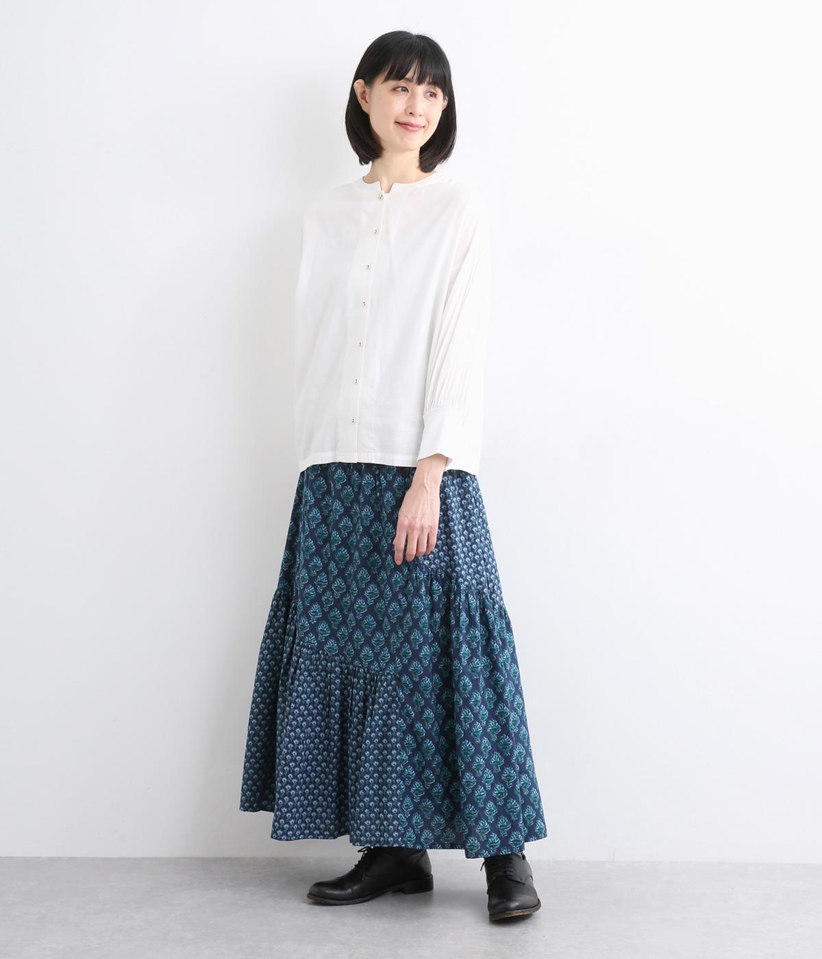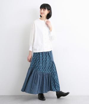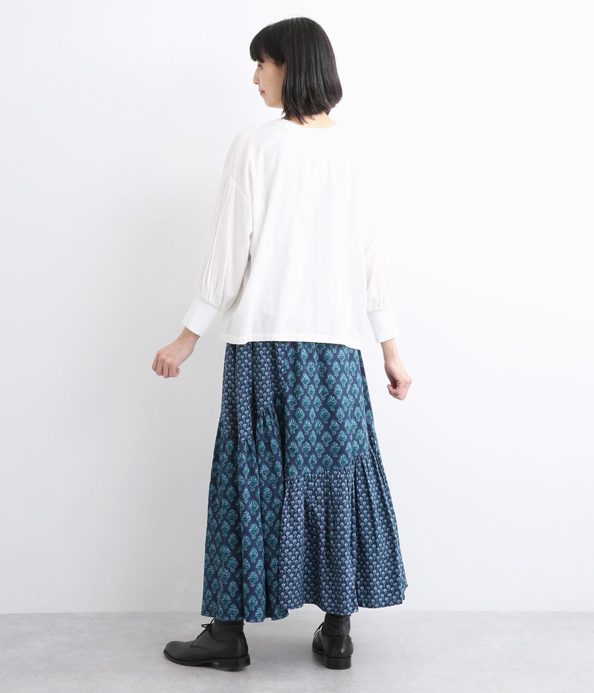 2種類のブロックプリント風ブーケ柄プリントが目を惹くスカート。上品さと可愛らしさのバランスが絶妙で、大人のデイリースタイルにとけこみながらも特別感のあるコーディネートに。ウエストはオールゴム&内紐つきでフィット感も◎。
