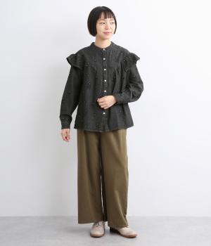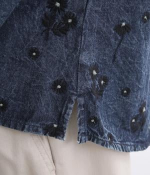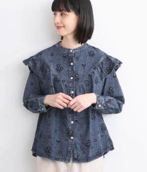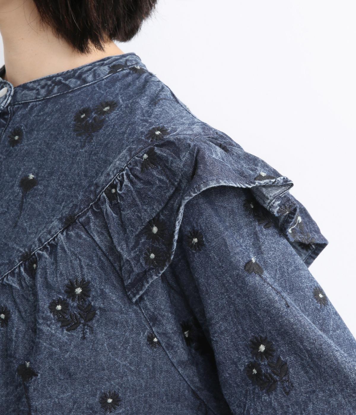 デニムブラウスにマーガレット刺しゅうを散りばめた大人かわいい一枚。巧みな切り替えにふんわりとしたフリルを入れて立体感をプラスしました。デニムだけどほどよく甘いディテールがポイント。前後で差をつけたヘムラインが特徴で、トップスアウトも◎。