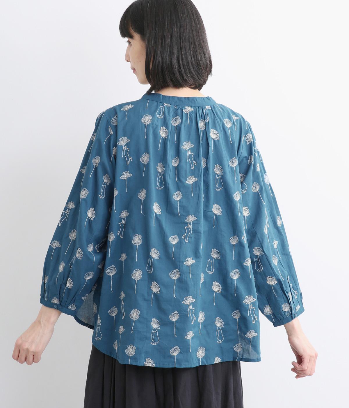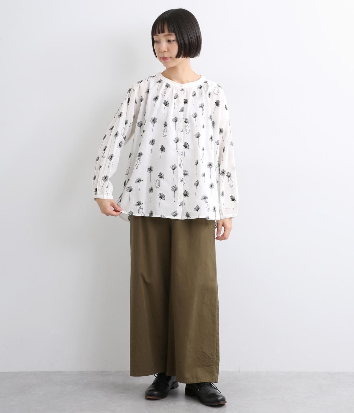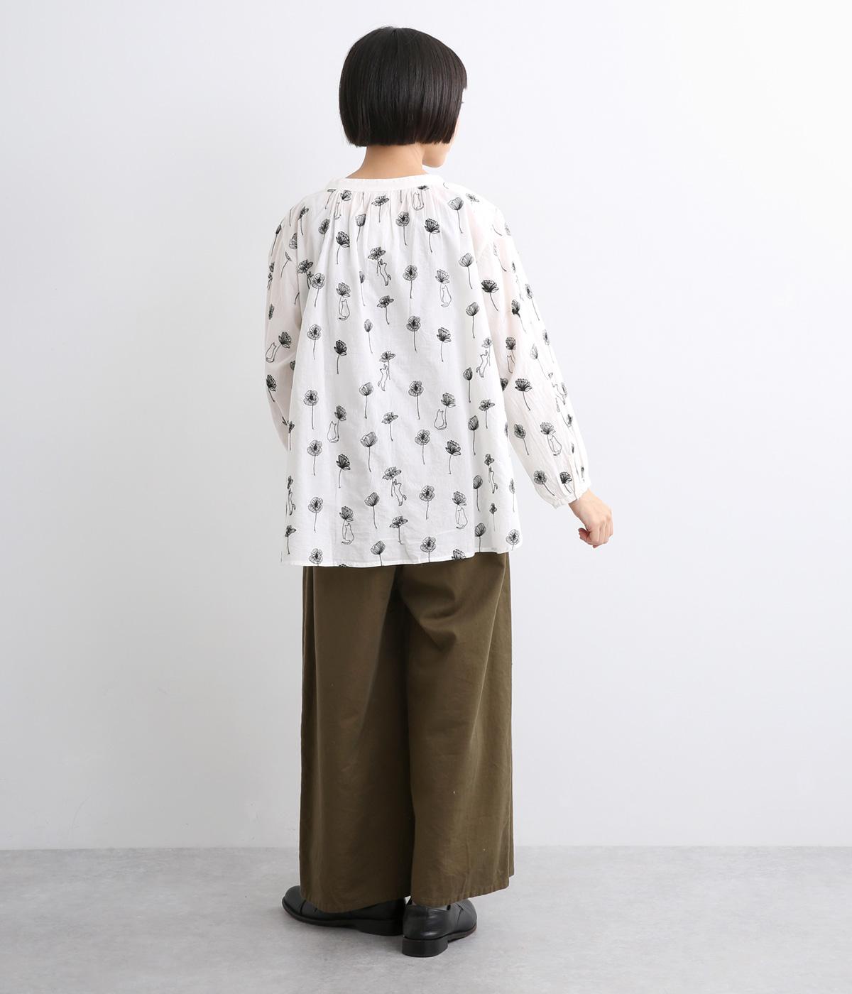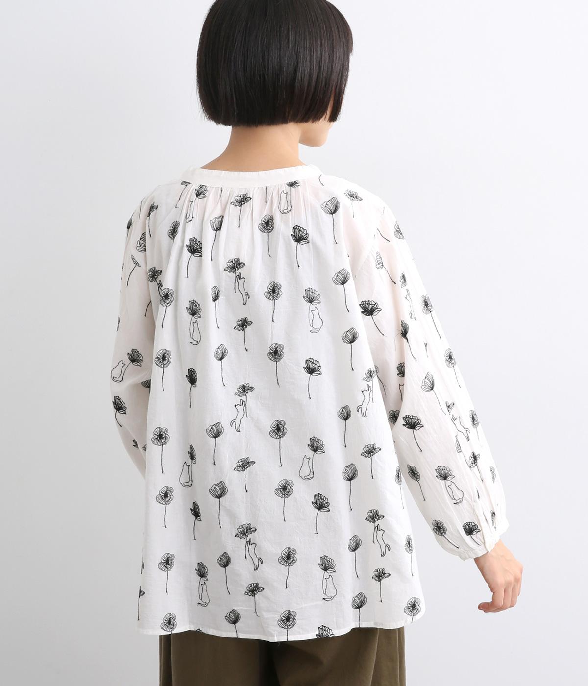 お花と猫の刺しゅうをほどこした大人かわいいブラウス。ゆとりのある着用しやすいシルエットでデイリー使いしやすく、後ろ着丈をやや長めにしています。ボトム合わせしやすくトップスインのきれいめな着こなしも◎。
