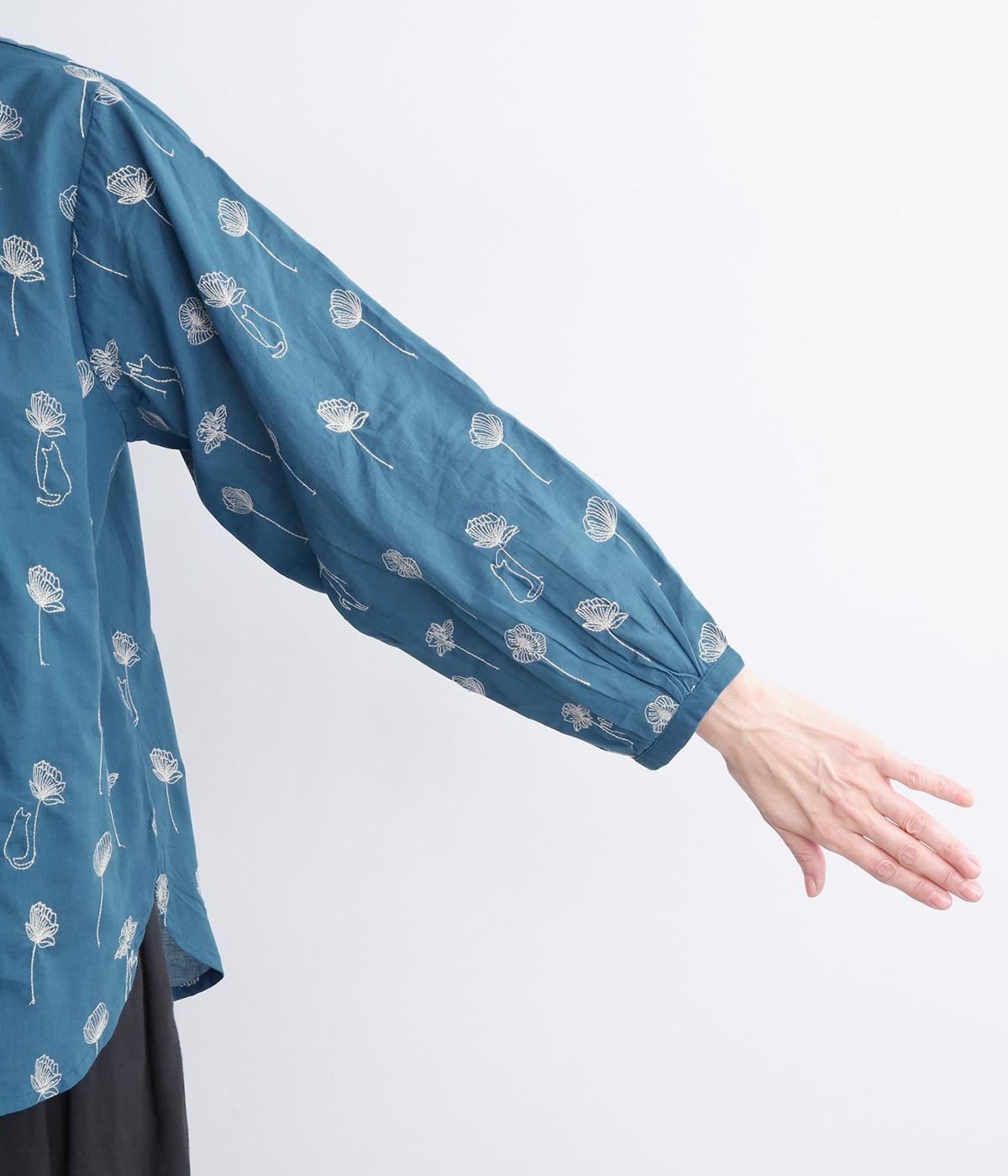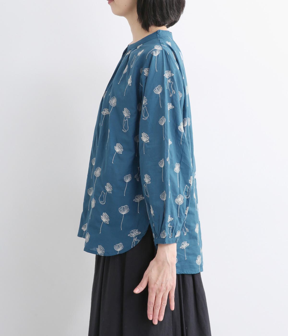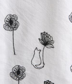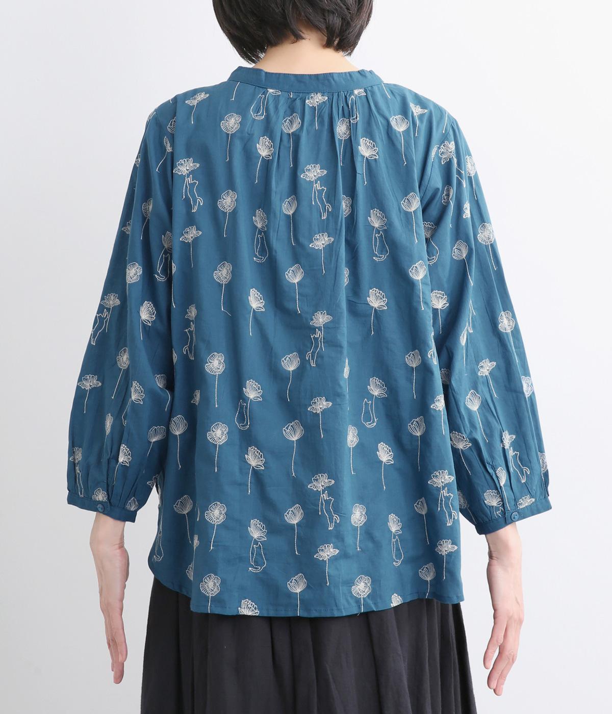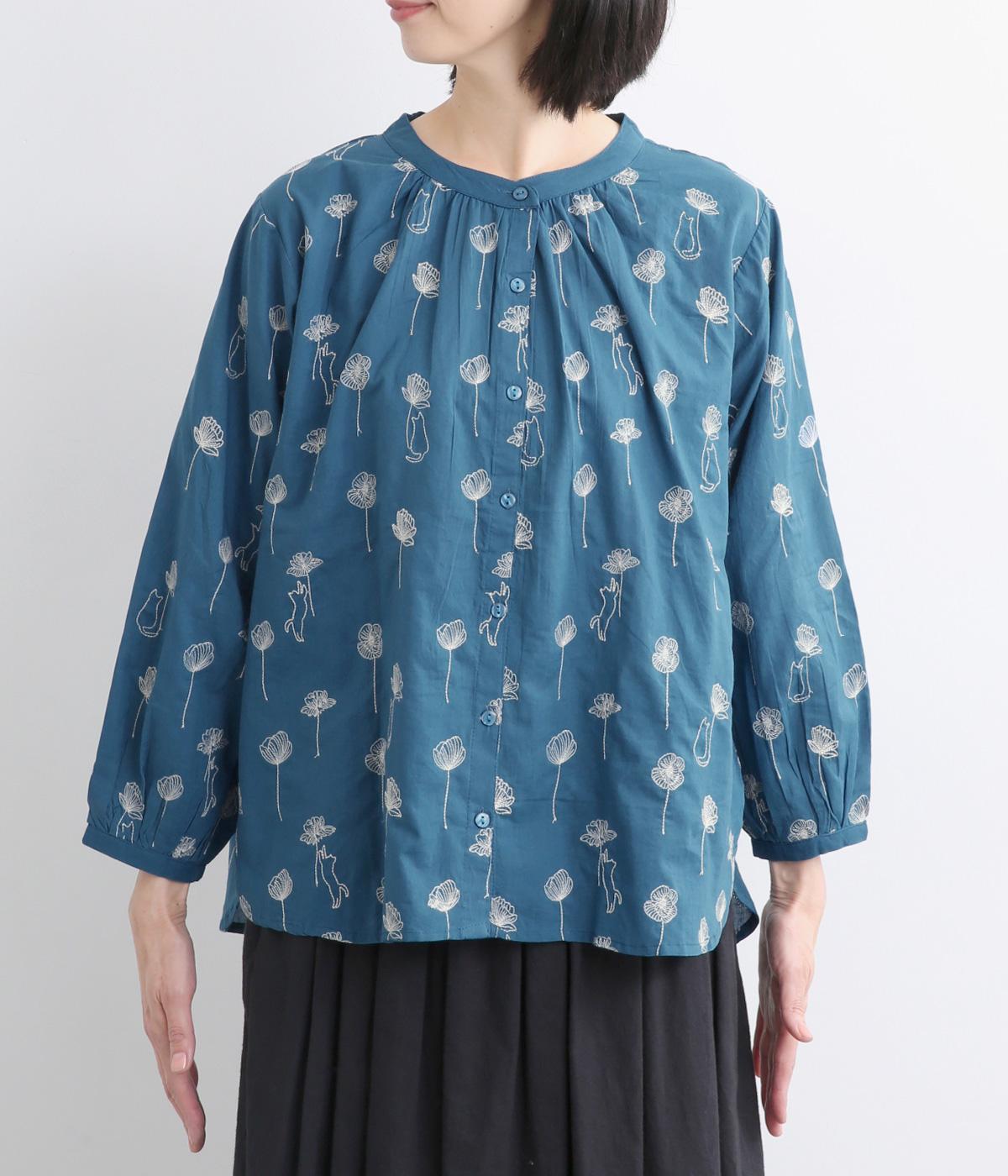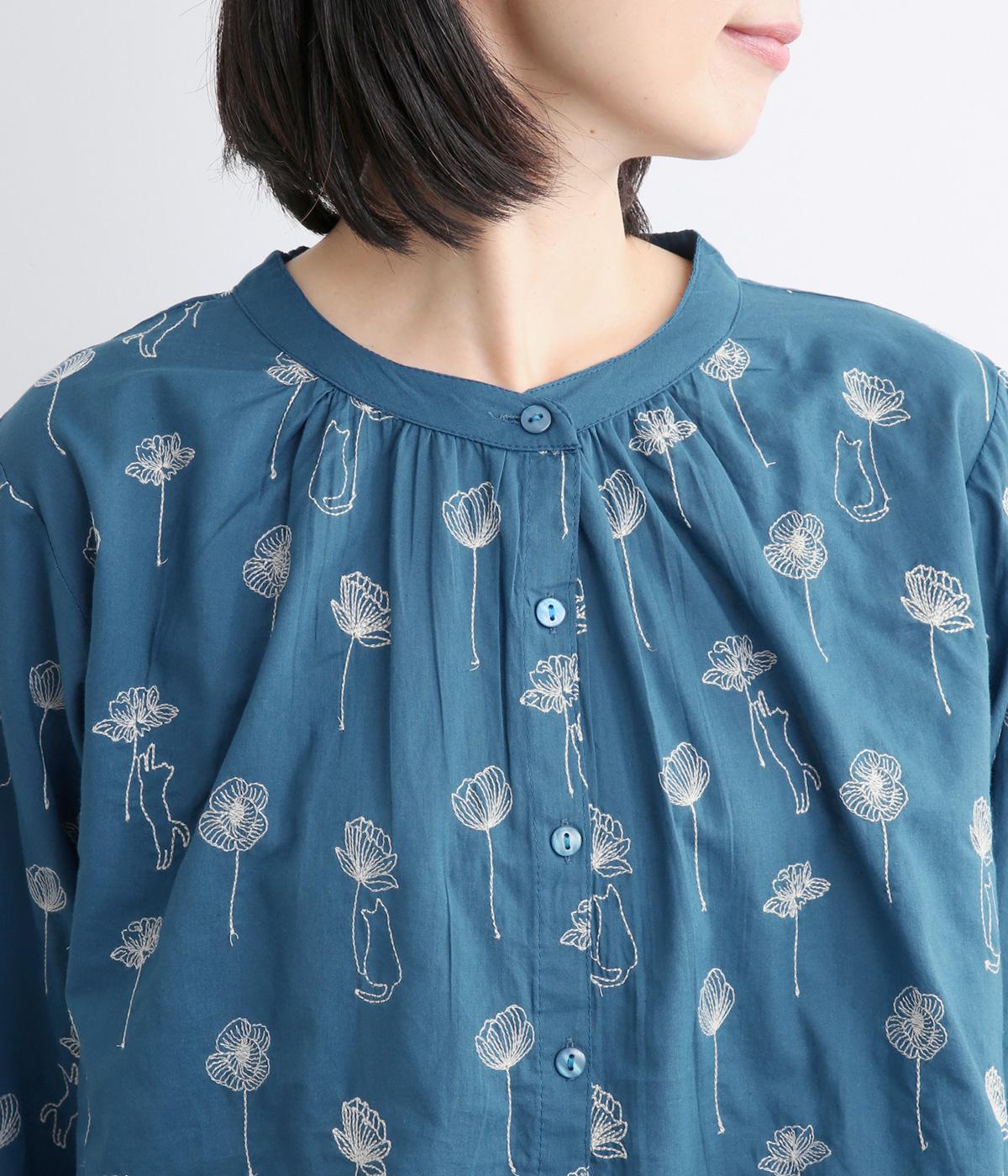 お花と猫の刺しゅうをほどこした大人かわいいブラウス。ゆとりのある着用しやすいシルエットでデイリー使いしやすく、後ろ着丈をやや長めにしています。ボトム合わせしやすくトップスインのきれいめな着こなしも◎。