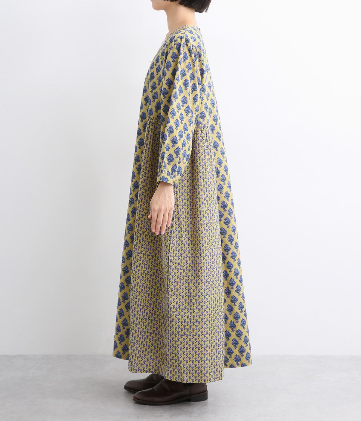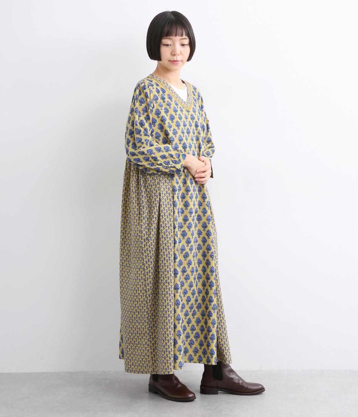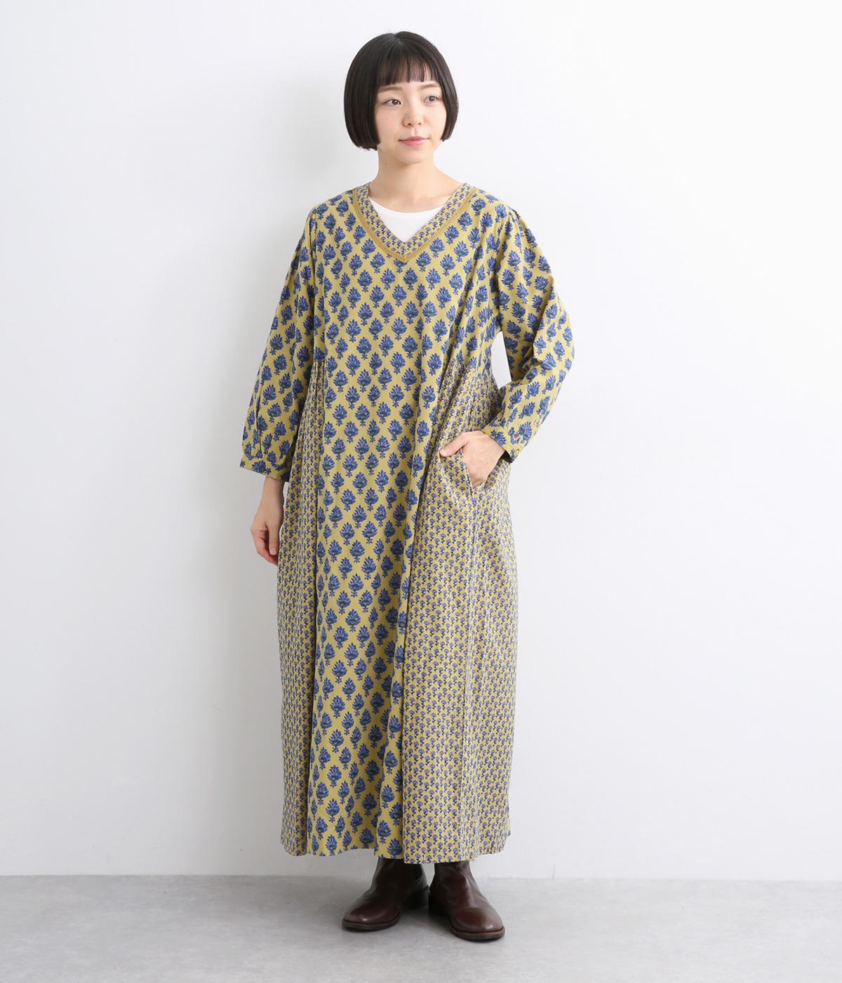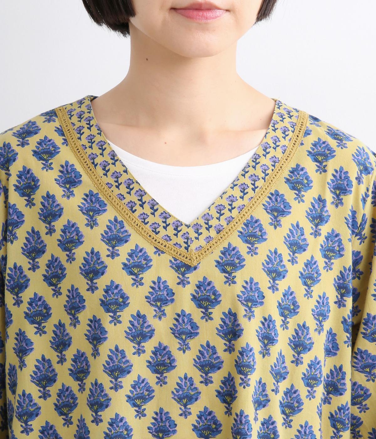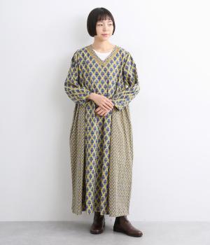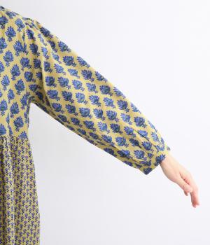 2種類のブロック風ブーケプリント生地とコットンレースを組み合わせた、上品でかわいらしい一着。ゆとりのあるシルエットで着心地が良く、シンプルながらも特別感があります。大人顔なロング丈にVネックの抜け感が好バランス。