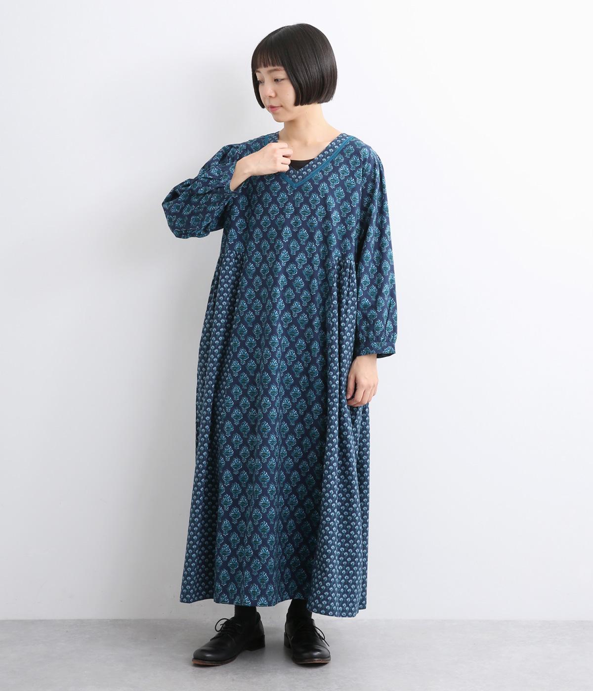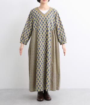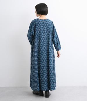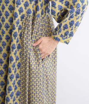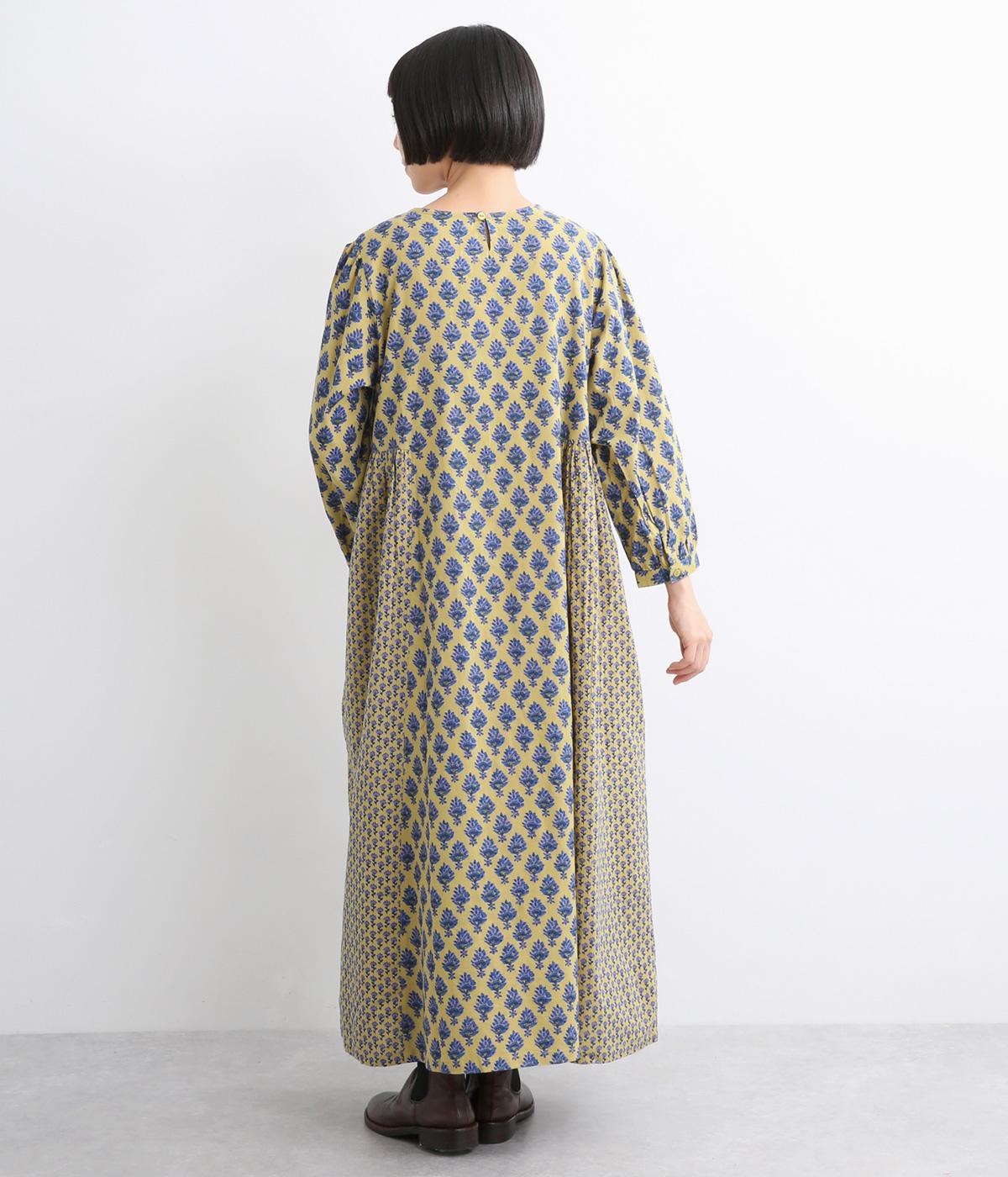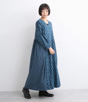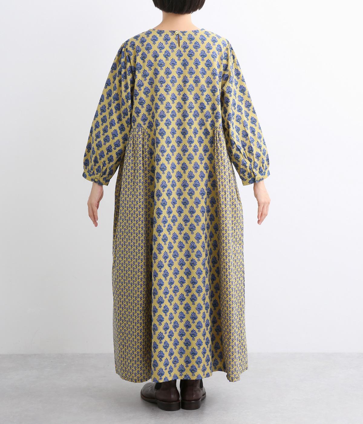 2種類のブロック風ブーケプリント生地とコットンレースを組み合わせた、上品でかわいらしい一着。ゆとりのあるシルエットで着心地が良く、シンプルながらも特別感があります。大人顔なロング丈にVネックの抜け感が好バランス。