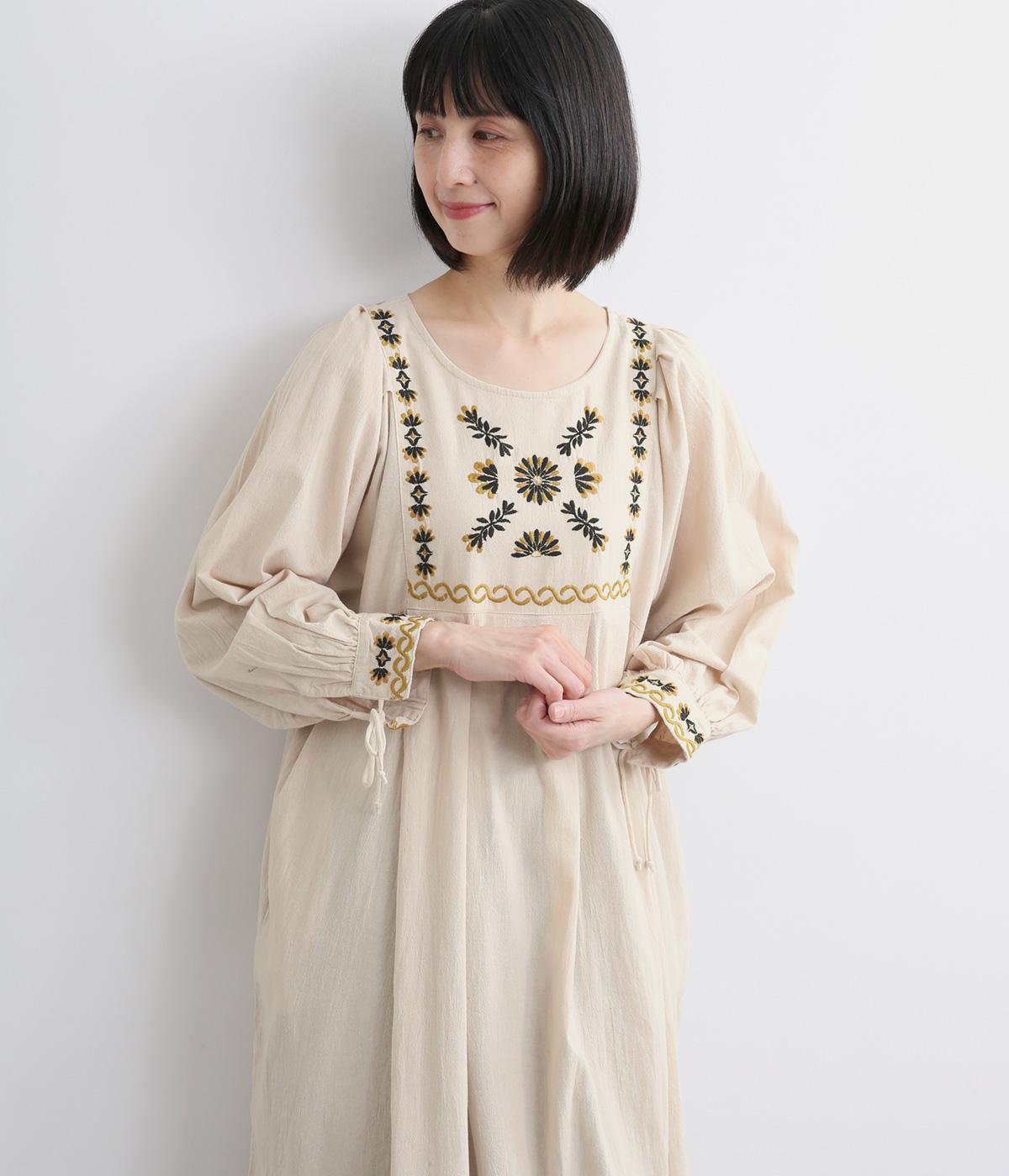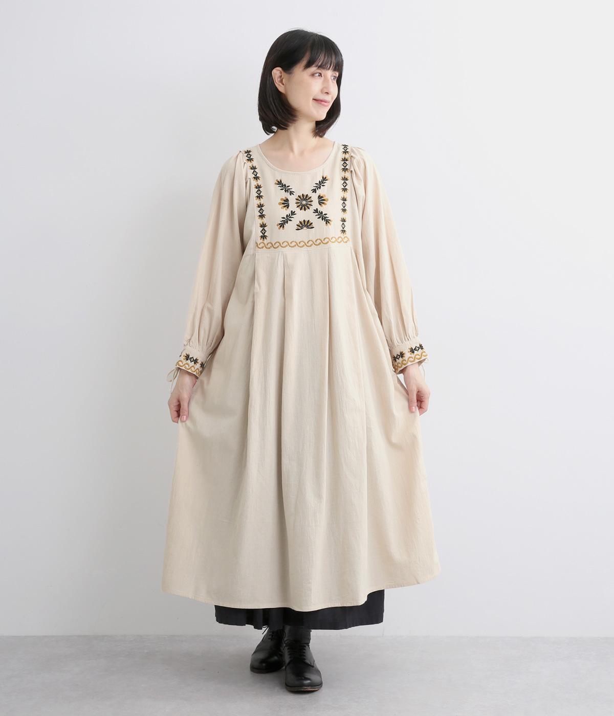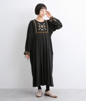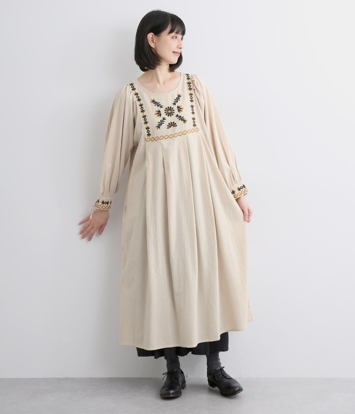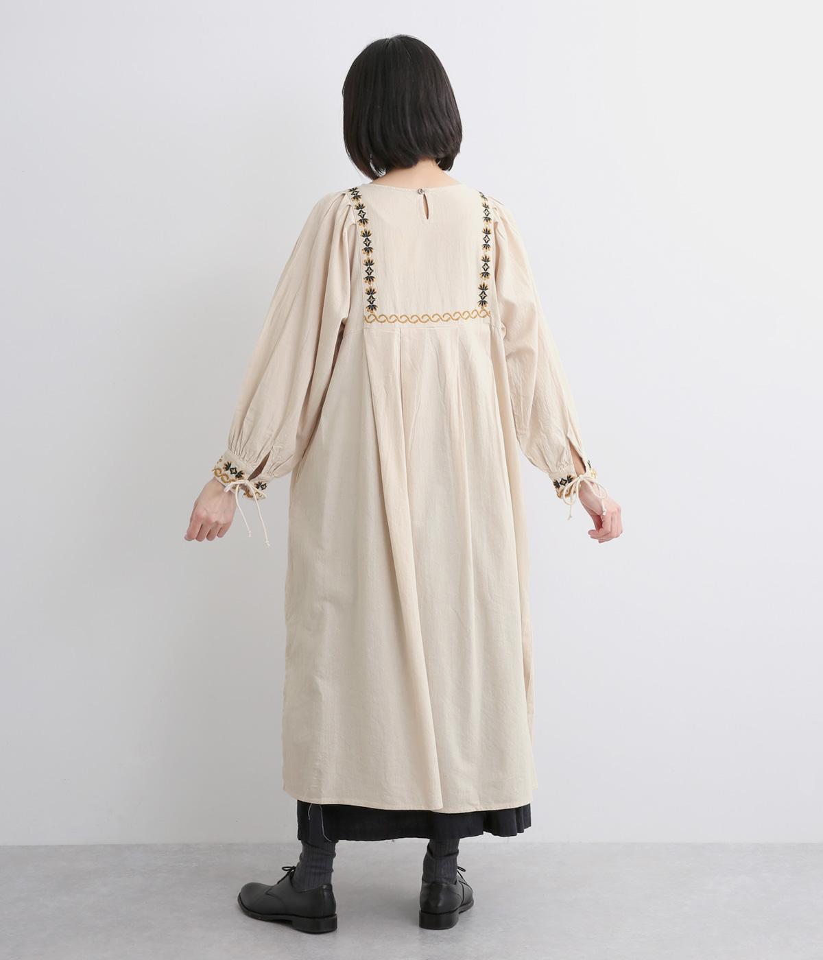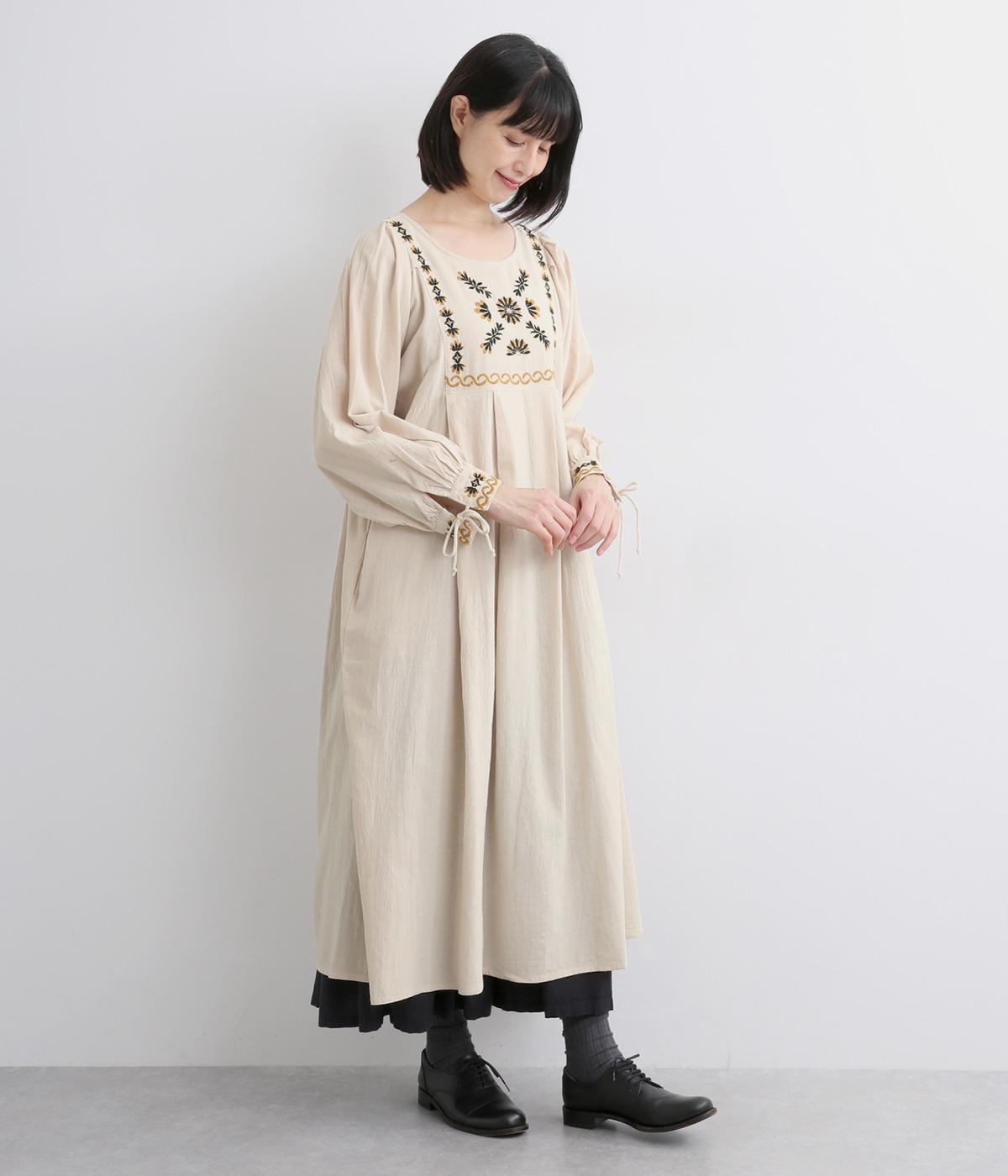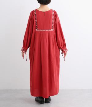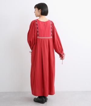 タックを入れたふんわりシルエットに東欧風の刺しゅうを添えた、ぬくもりを感じるワンピース。紐で結ぶ袖口のディテールも特別感があり、日常を盛り上げてくれます。ラフな一枚着でもスタイリングが完成する、頼れるアイテムです。