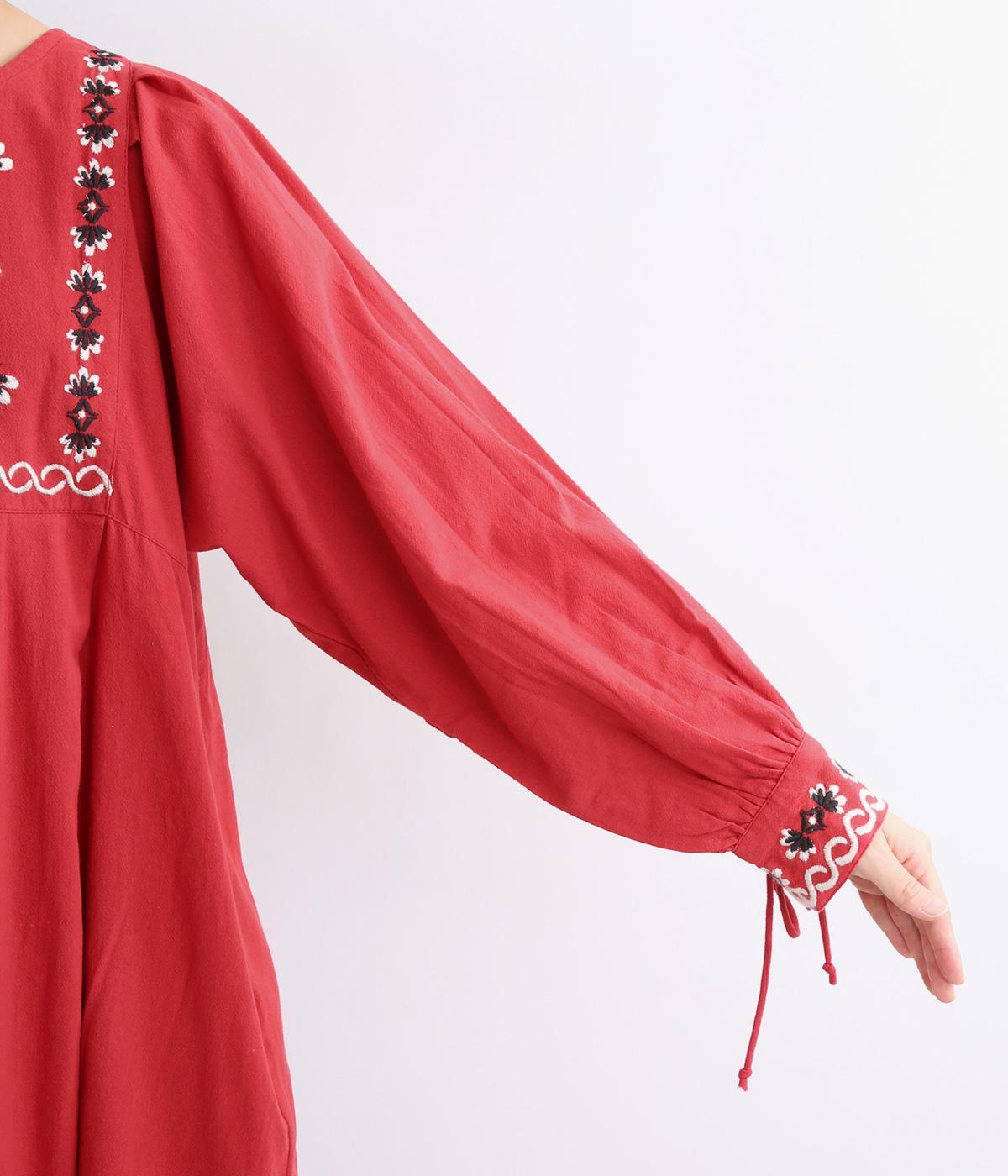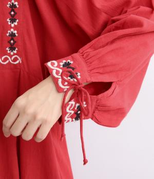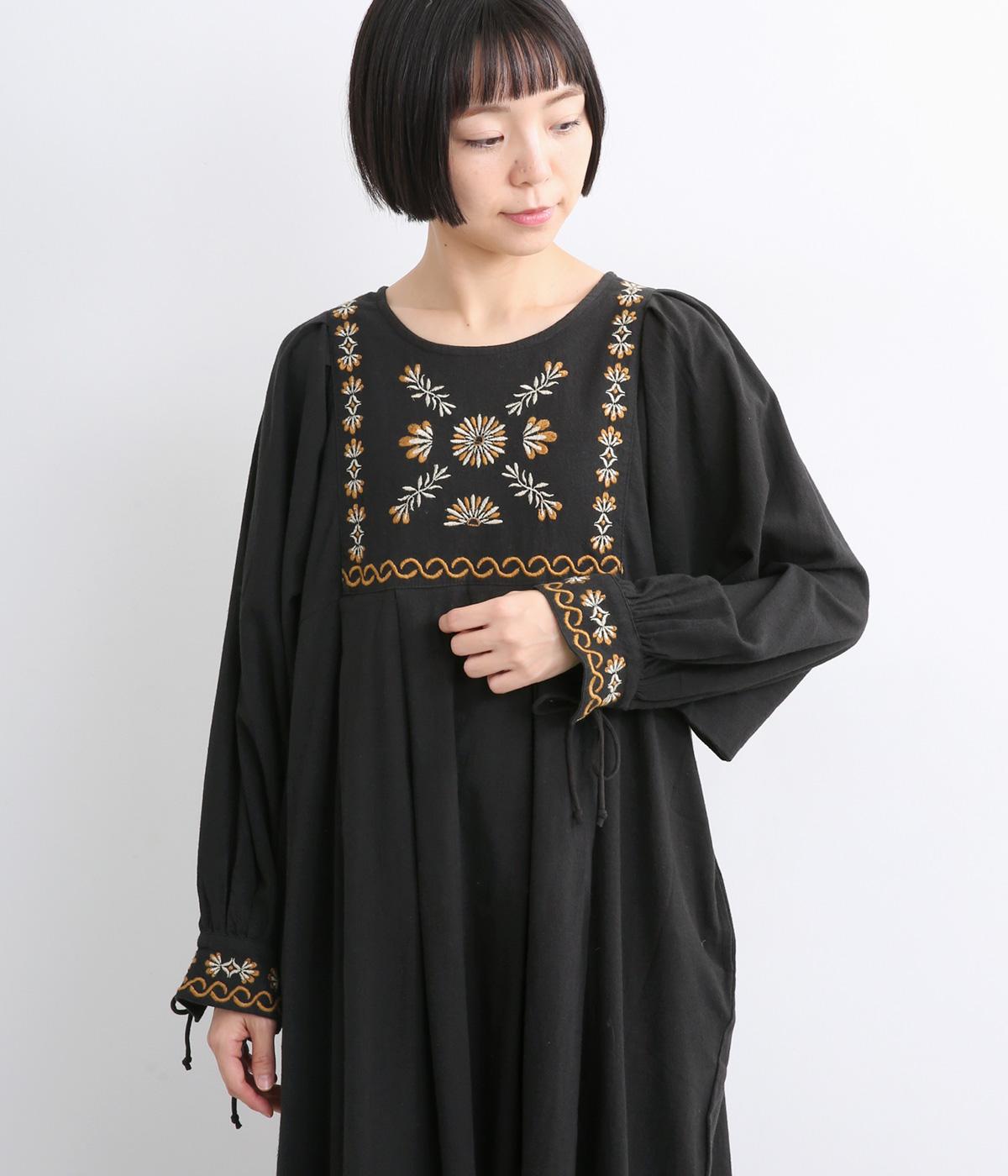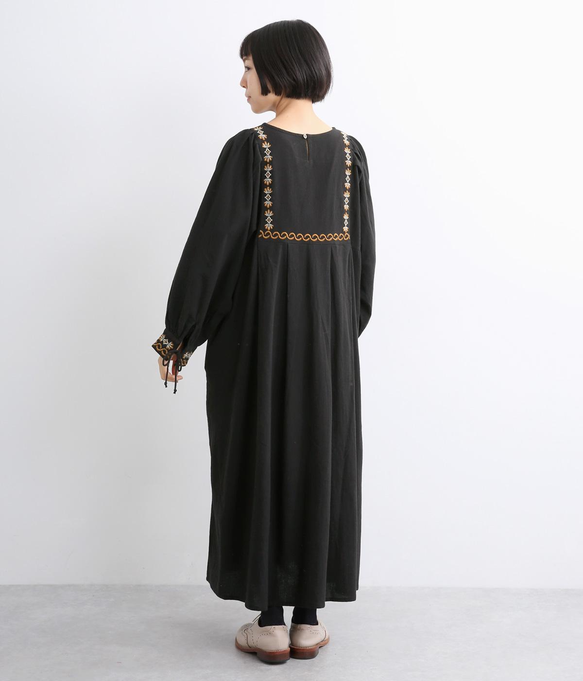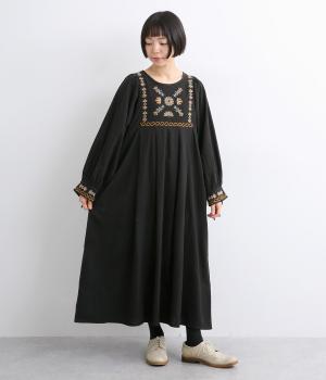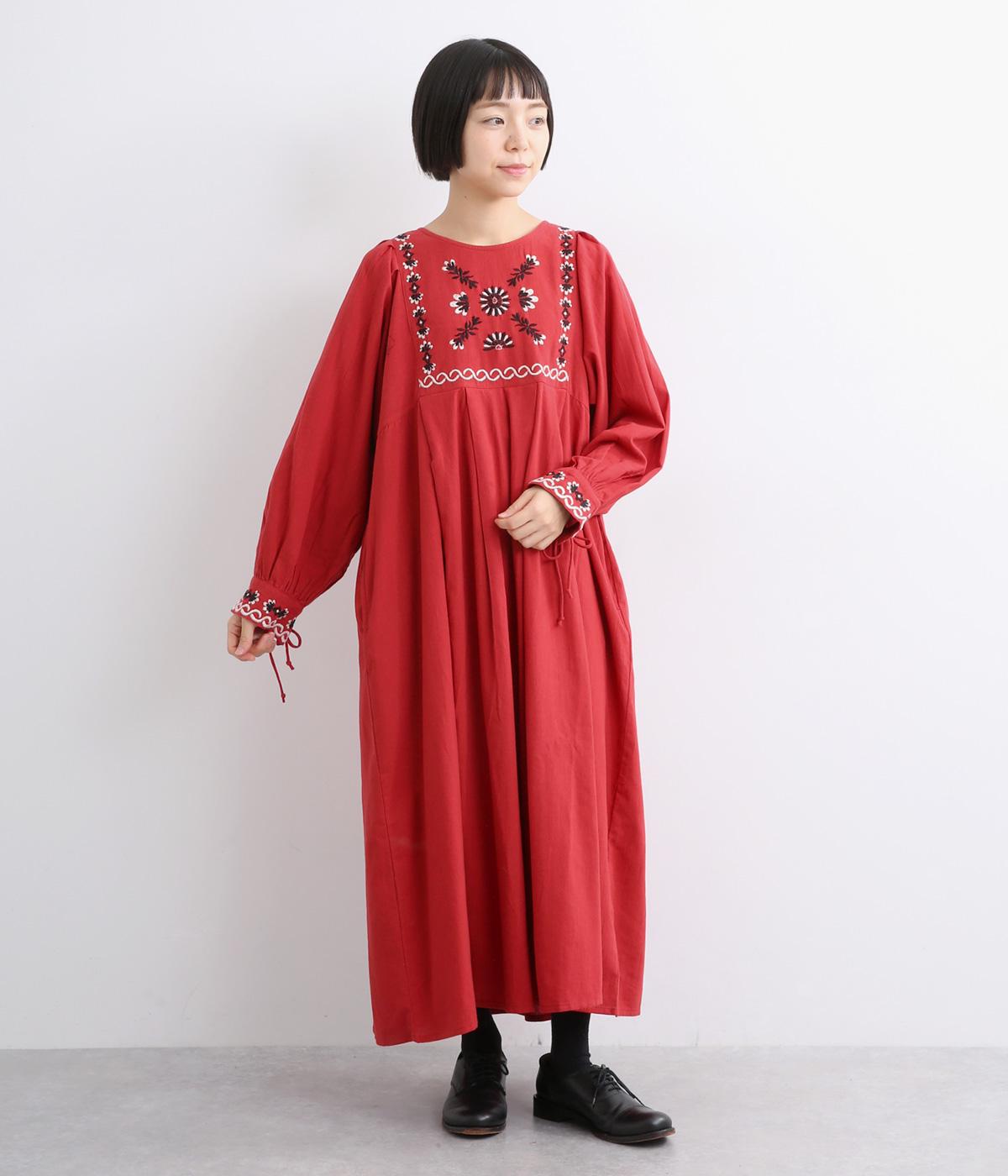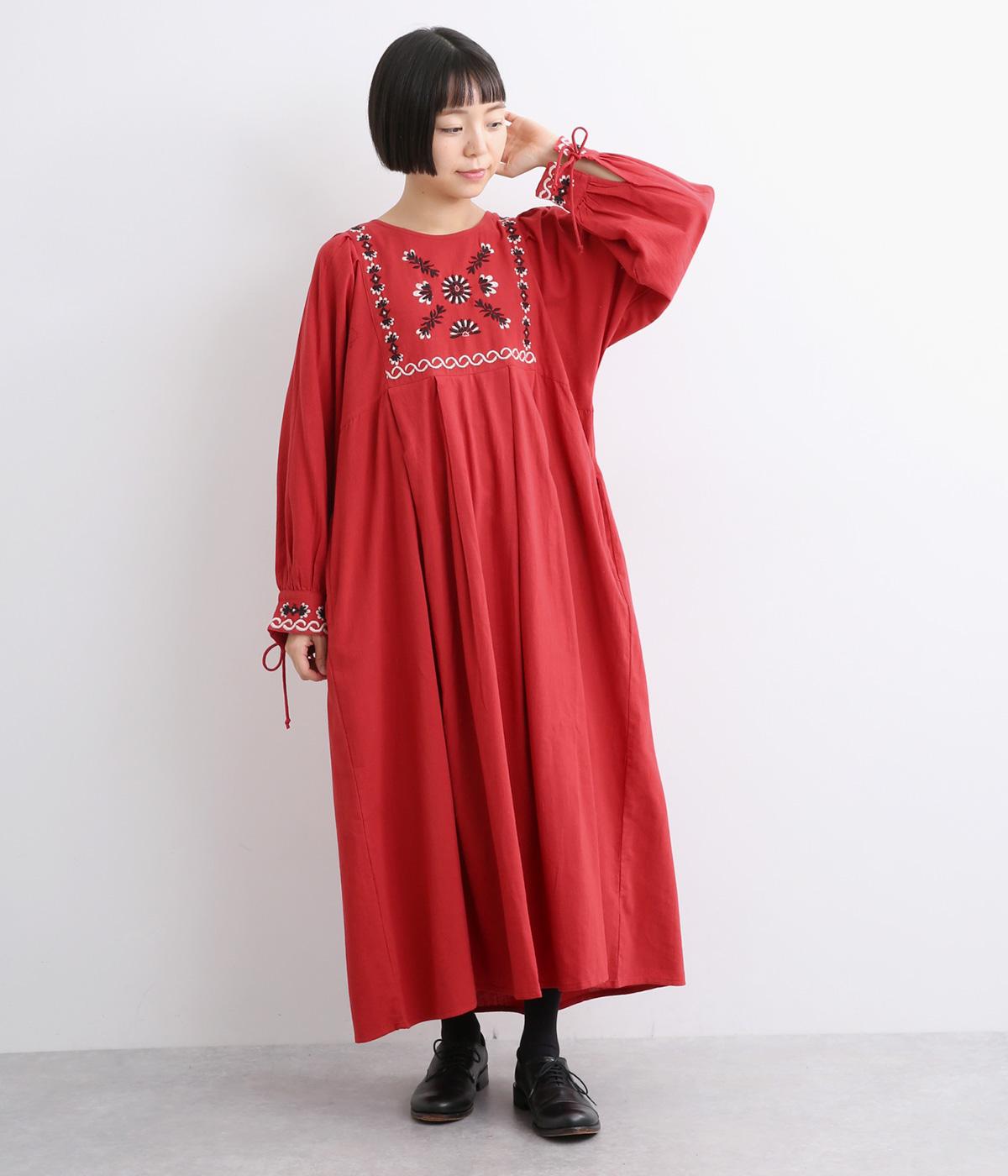 タックを入れたふんわりシルエットに東欧風の刺しゅうを添えた、ぬくもりを感じるワンピース。紐で結ぶ袖口のディテールも特別感があり、日常を盛り上げてくれます。ラフな一枚着でもスタイリングが完成する、頼れるアイテムです。