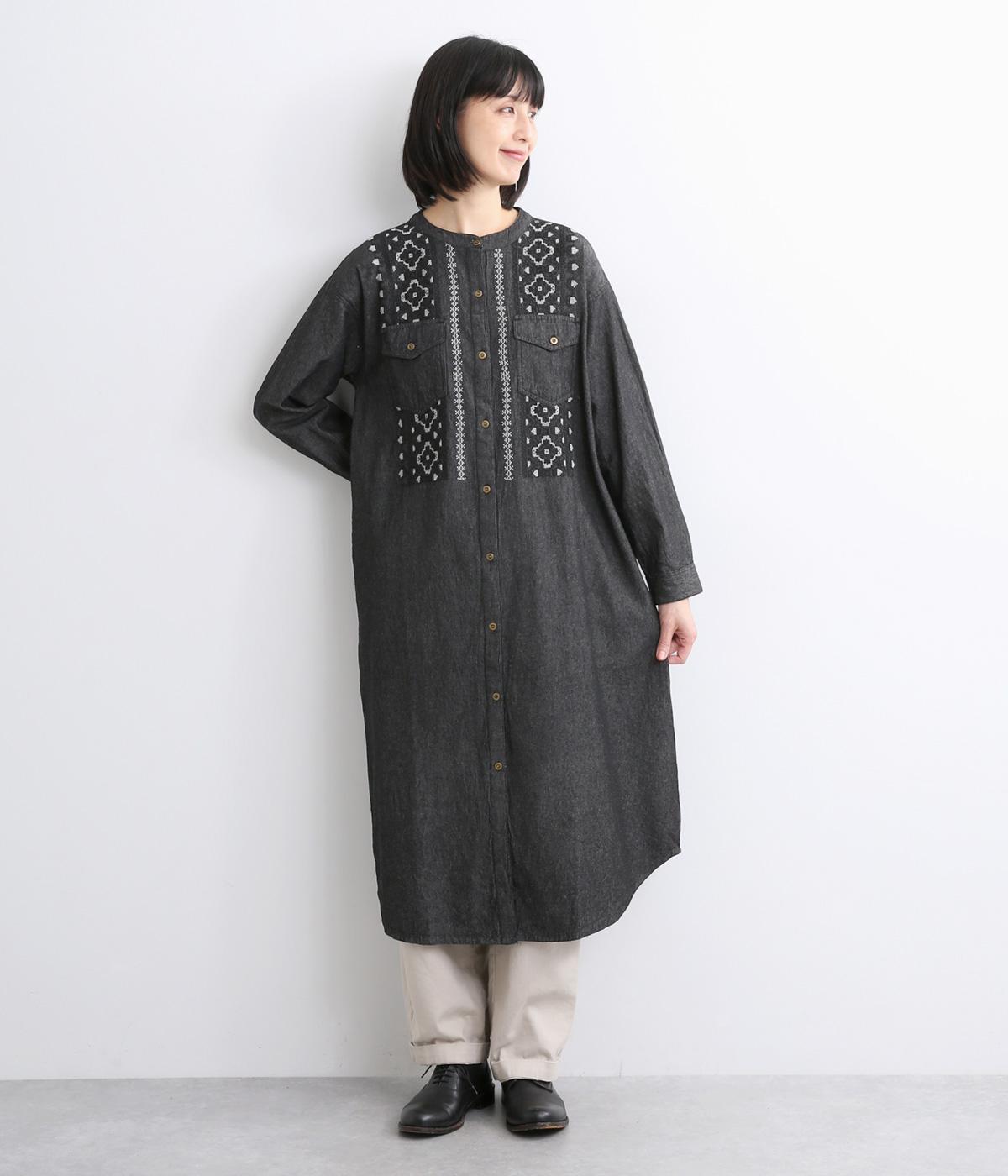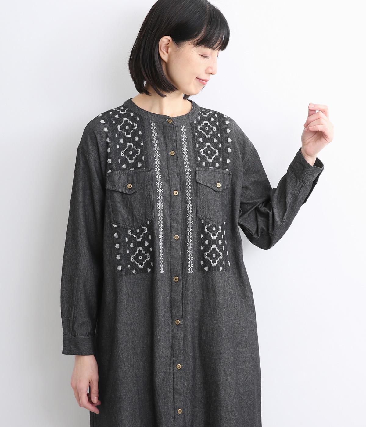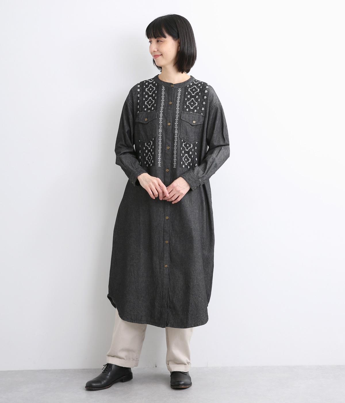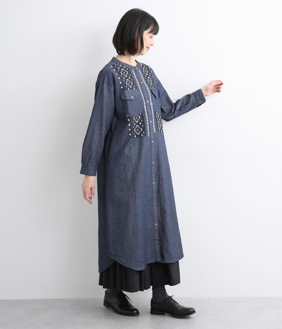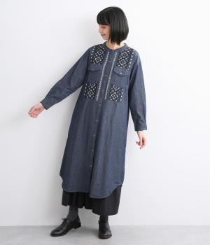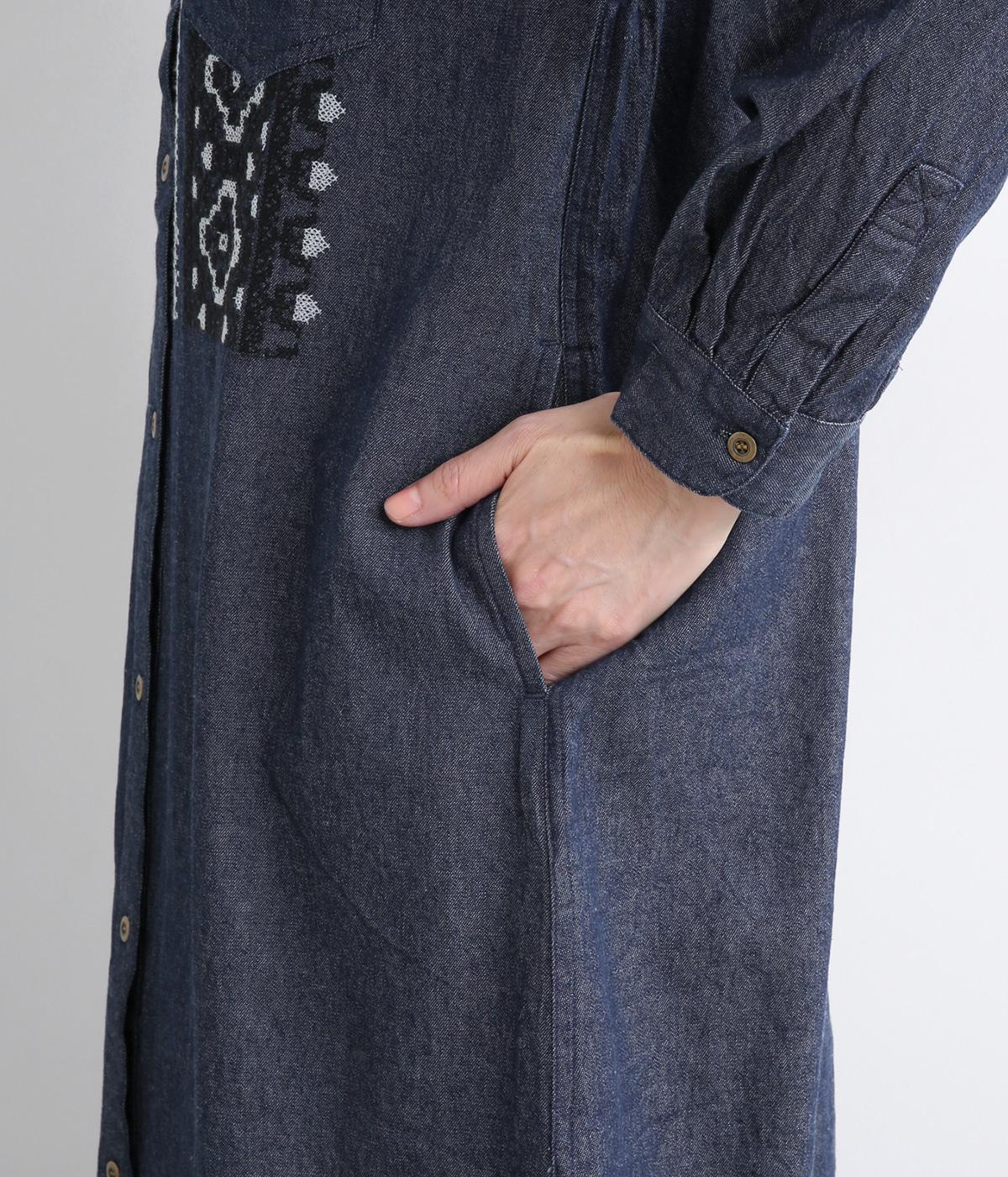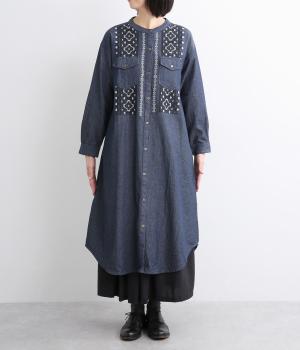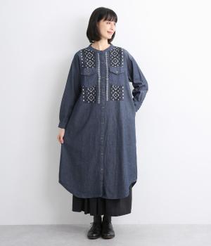 上身頃にエスニック調の幾何学刺しゅうをたっぷりとほどこした、異国ムード漂うワンピース。胸ポケットのアクセントがきいています。前あき仕様なので、羽織りにしたり、アウターを合わせたりと長く着まわせるデザインです。