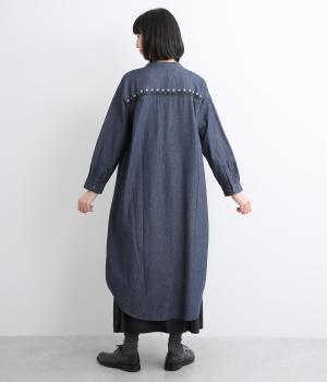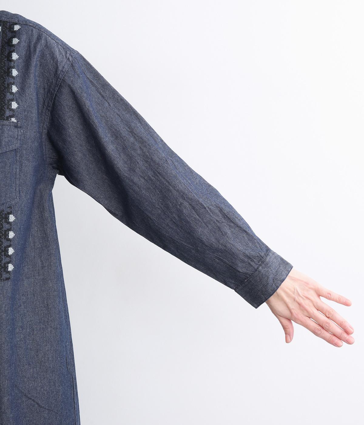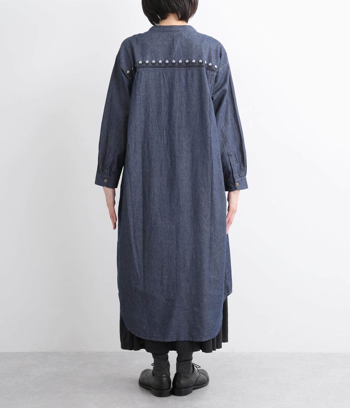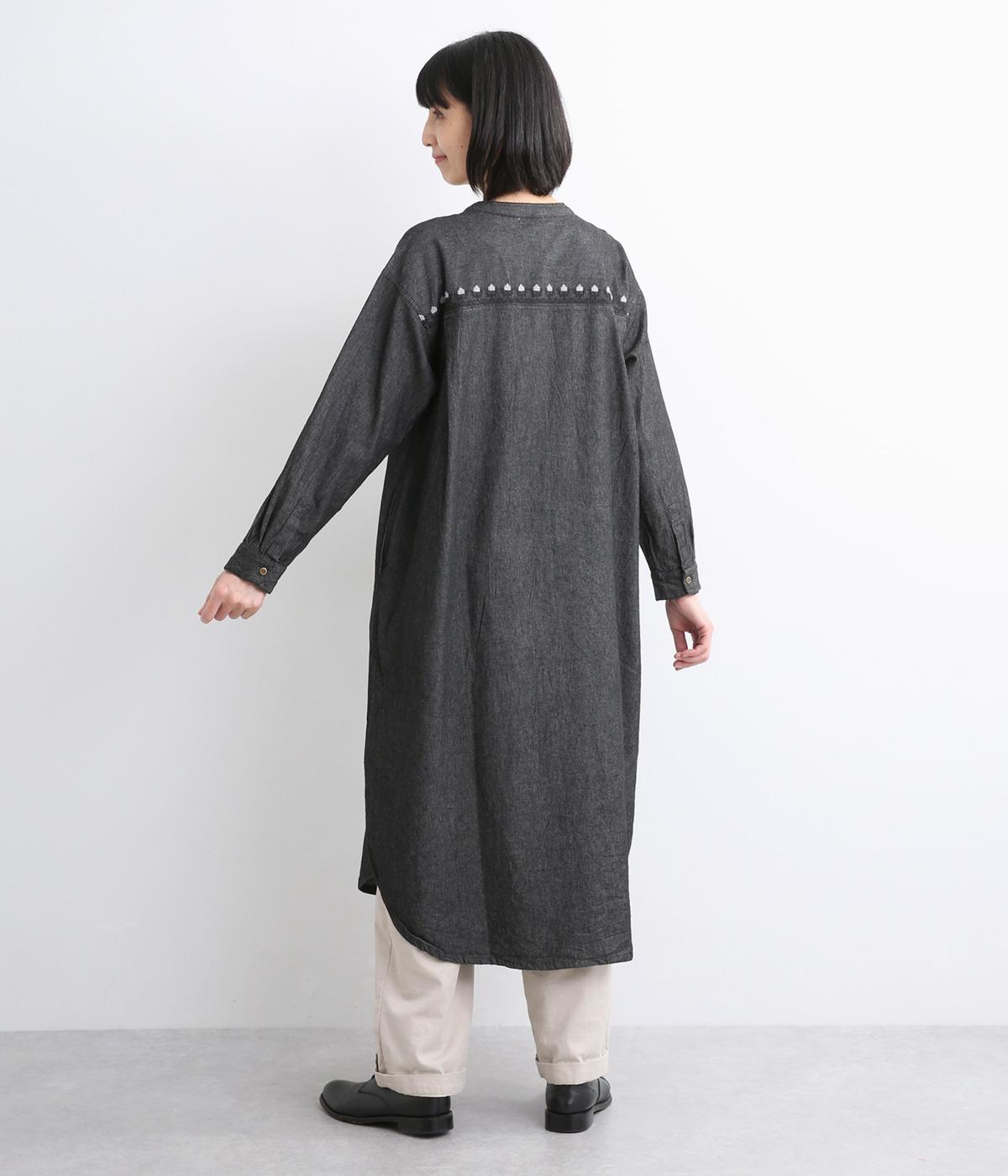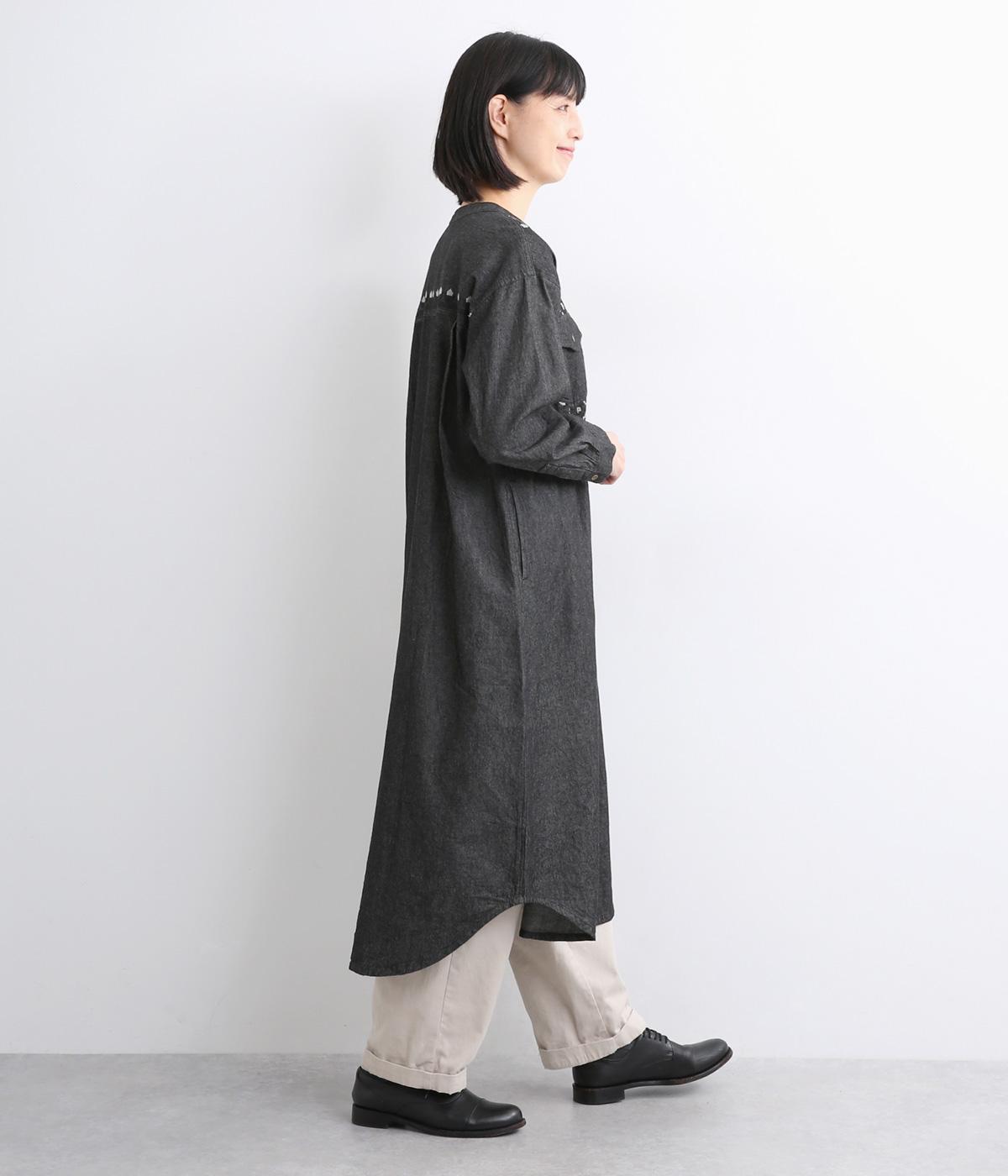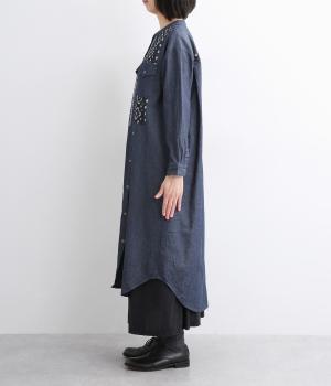 上身頃にエスニック調の幾何学刺しゅうをたっぷりとほどこした、異国ムード漂うワンピース。胸ポケットのアクセントがきいています。前あき仕様なので、羽織りにしたり、アウターを合わせたりと長く着まわせるデザインです。