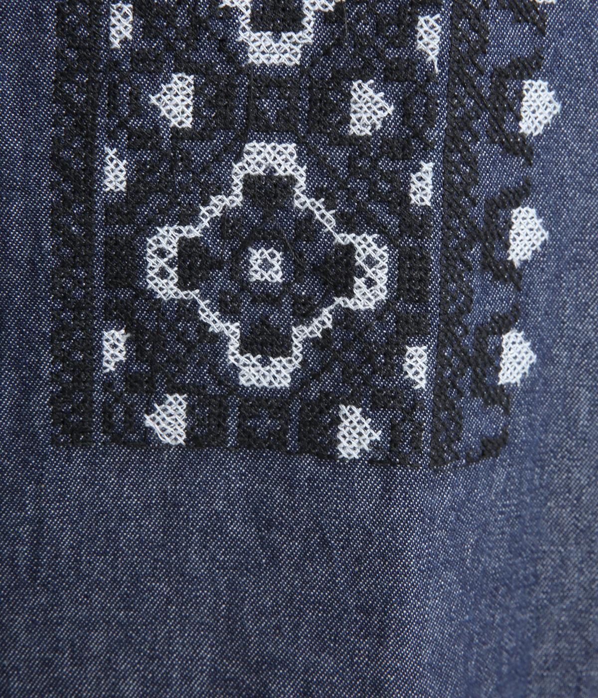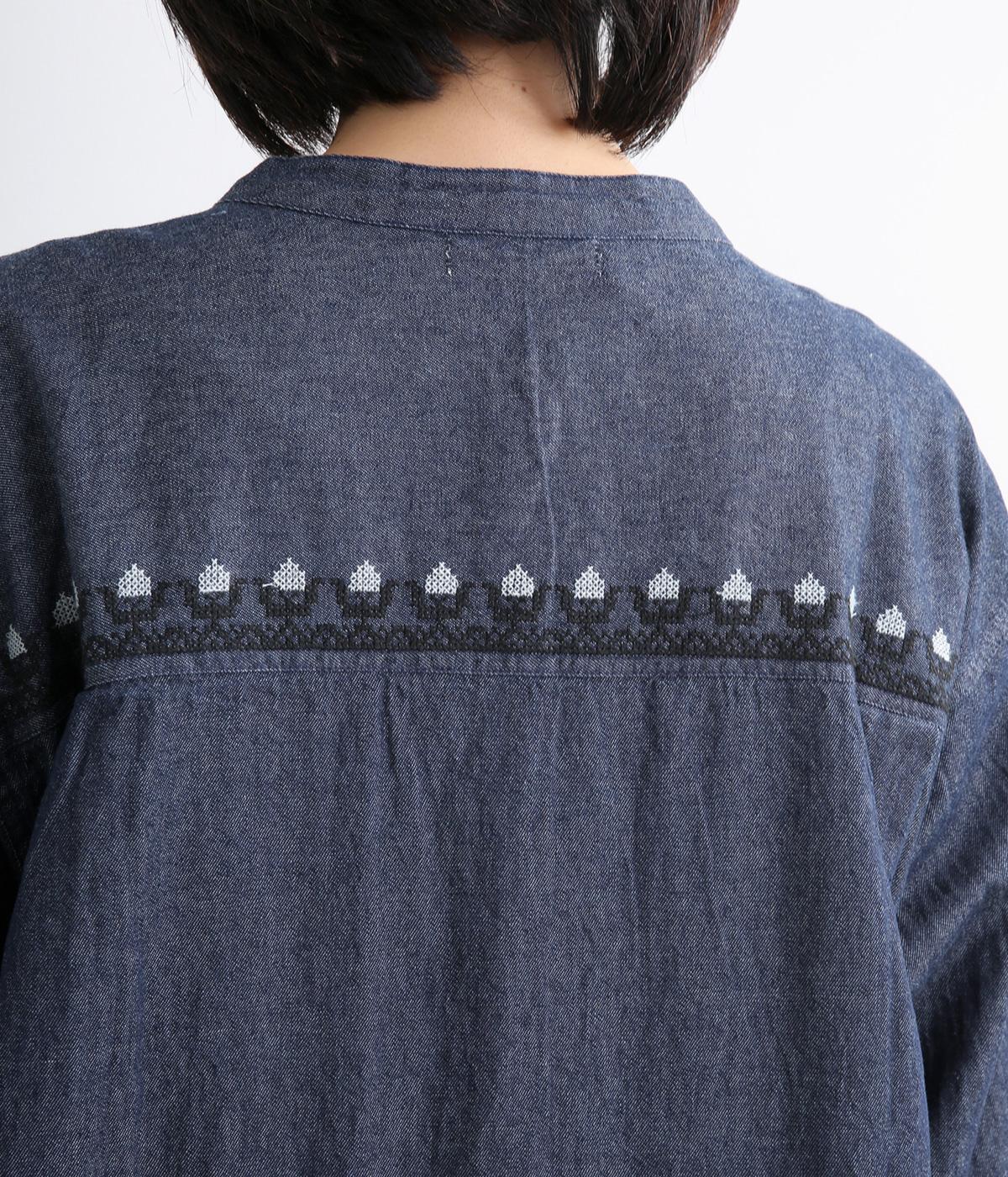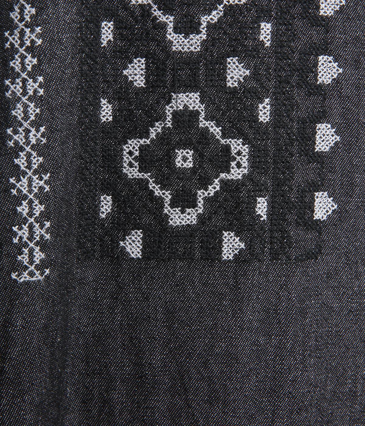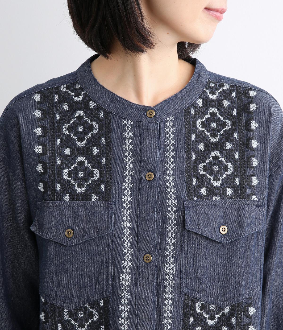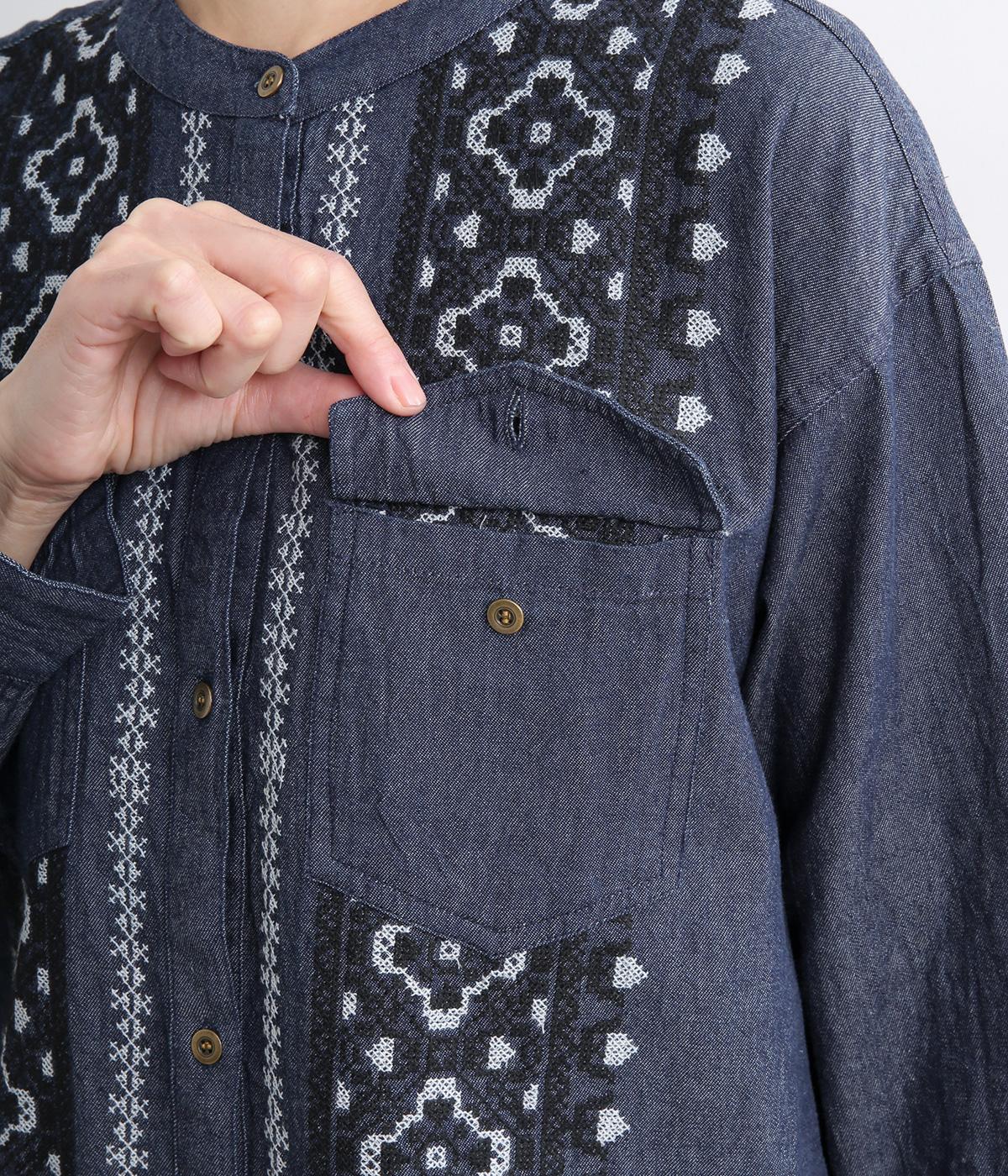 上身頃にエスニック調の幾何学刺しゅうをたっぷりとほどこした、異国ムード漂うワンピース。胸ポケットのアクセントがきいています。前あき仕様なので、羽織りにしたり、アウターを合わせたりと長く着まわせるデザインです。
