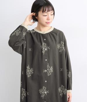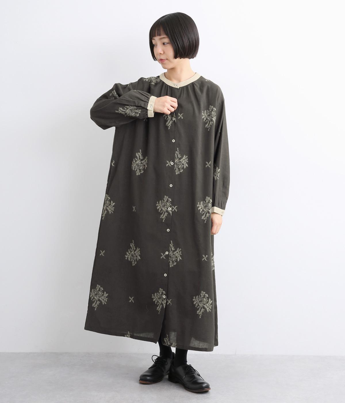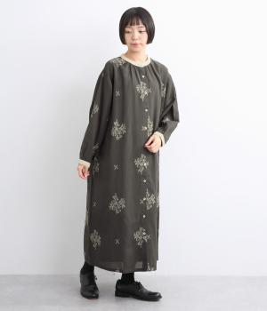 繊細な線画のような刺しゅうがクラシカルなワンピース。バイカラーでモダンさも感じさせ、上品で一枚着でも存在感があります。ボタンをあければ羽織りにもなり、季節によってさまざまな着こなしがたのしめる一着です。