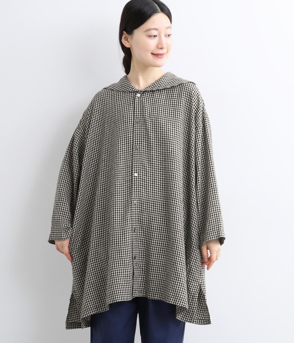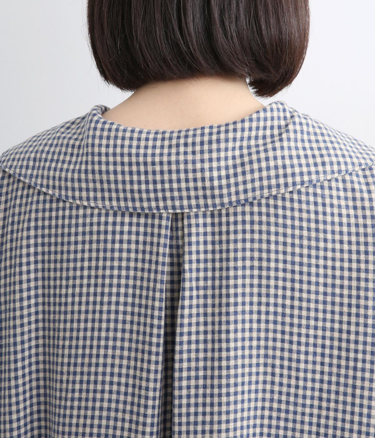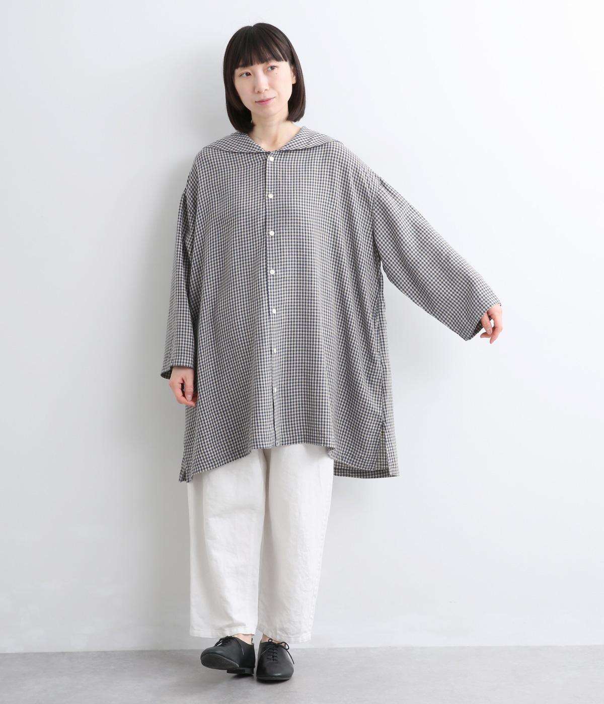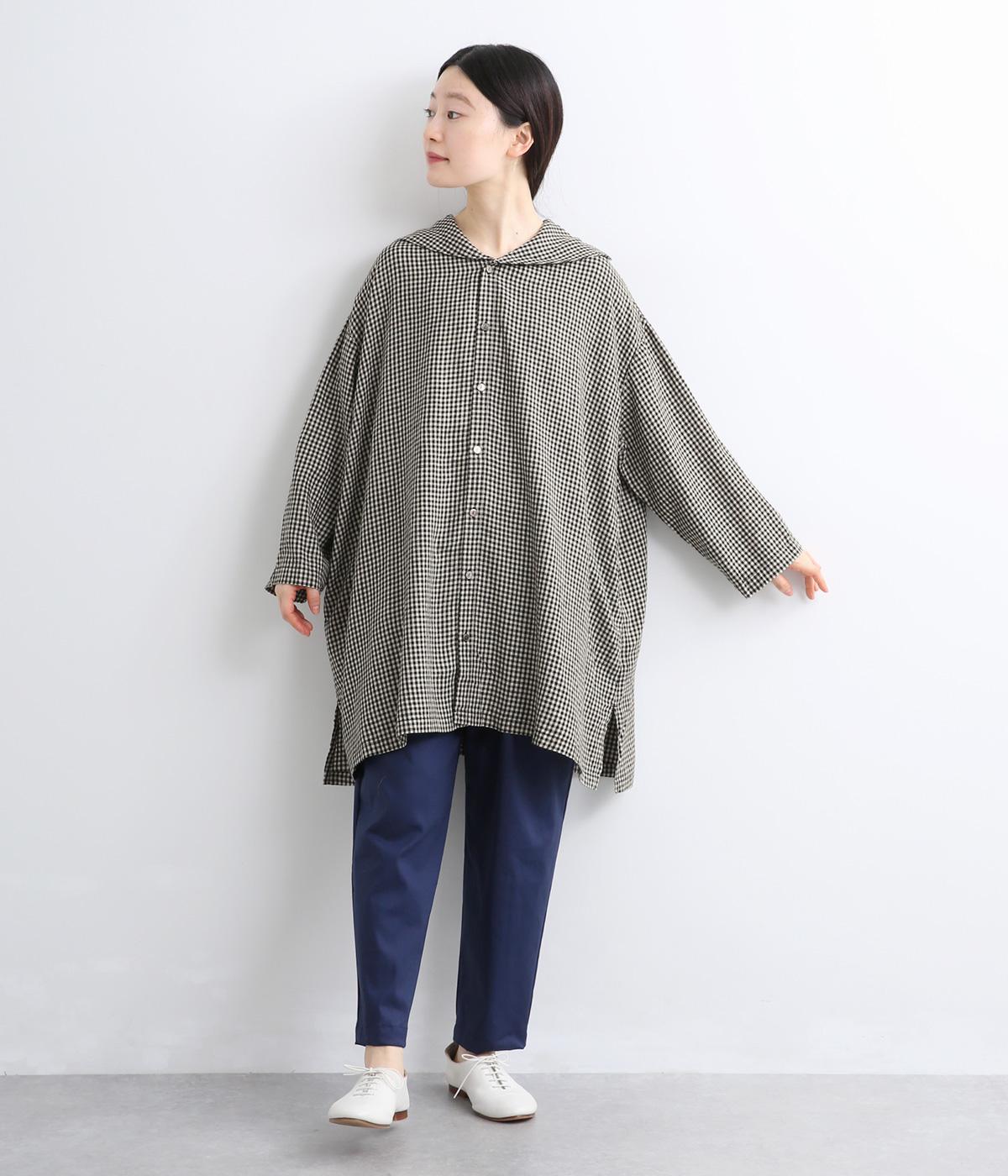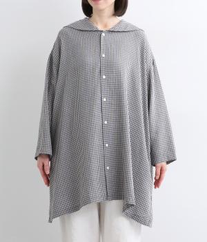 チェック柄にセーラーカラーが大人ガーリーな要素をプラス。ドロップショルダーのゆったりとしたシルエットがリラックス感を生み、サイドスリット入りでボトム合わせも◎。前あきで羽織るなど、デイリースタイルに気負いなく取り入れられます。