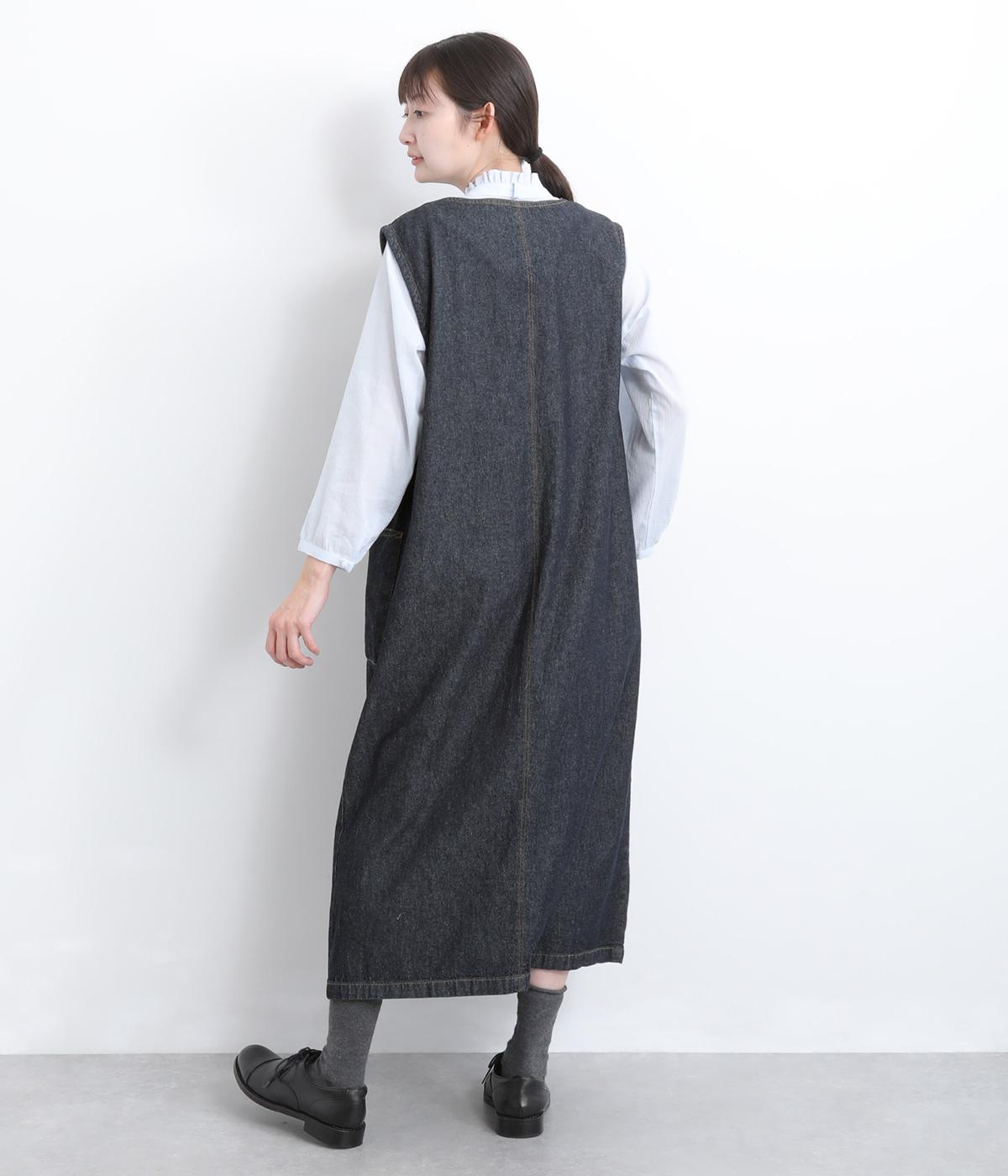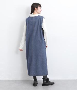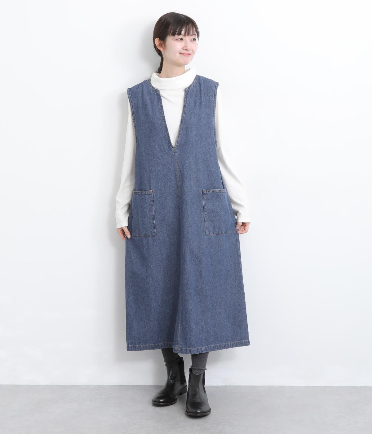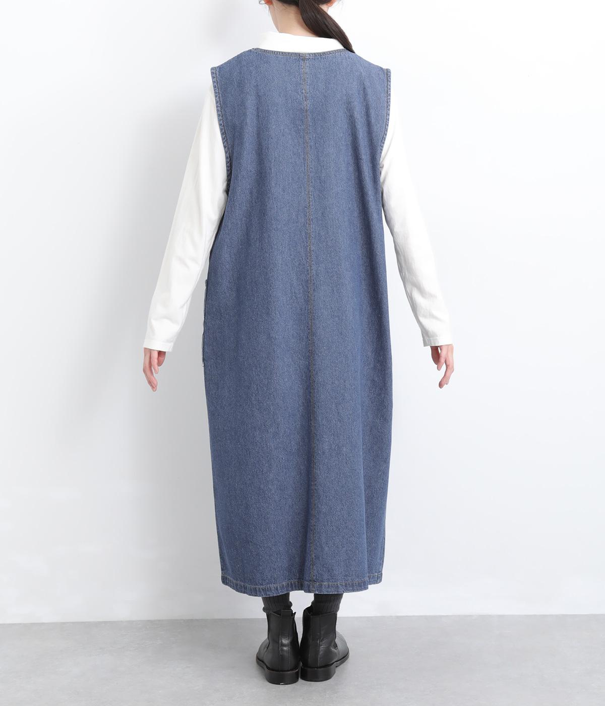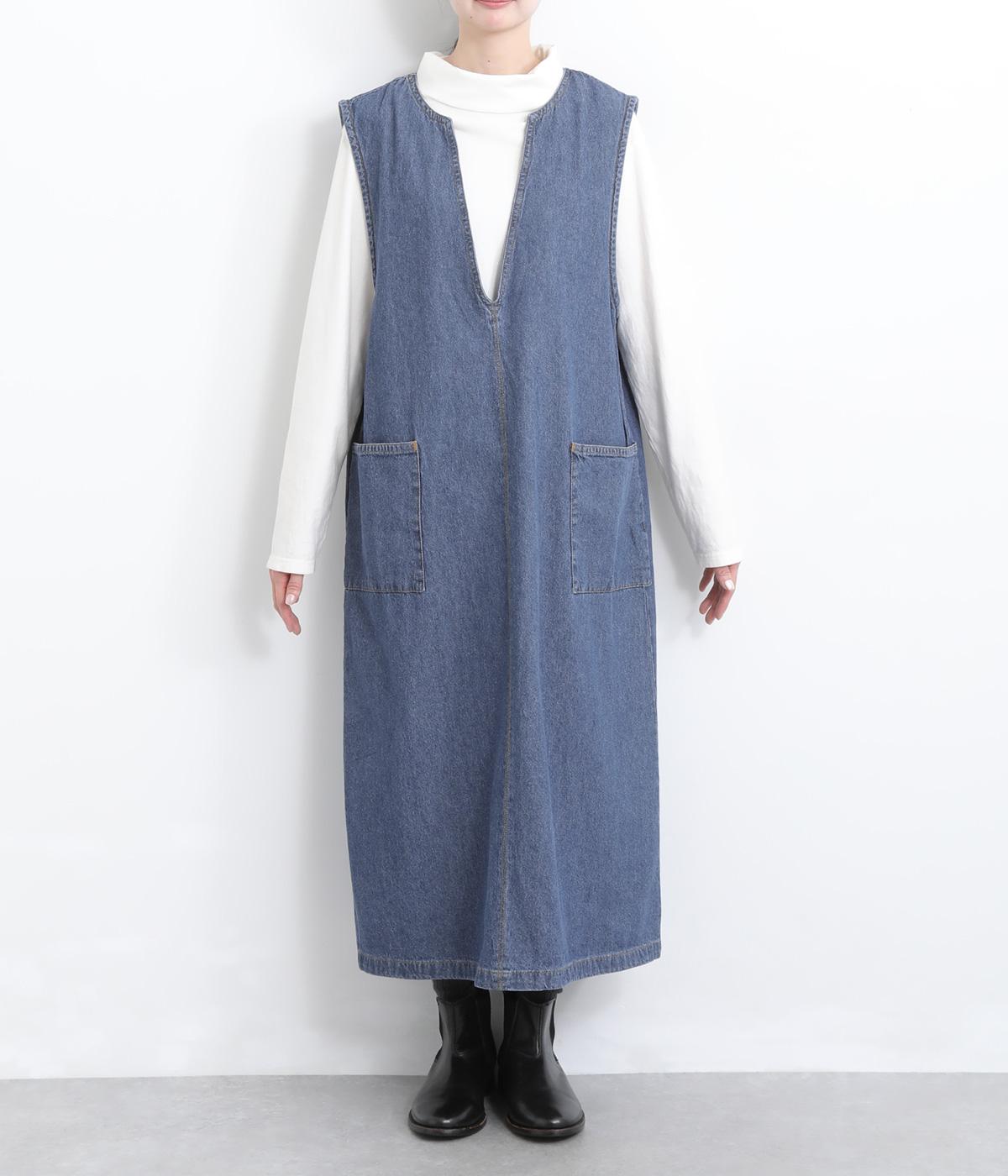 7.6ozデニムキーネックノースリーブワンピ(サックス-M)