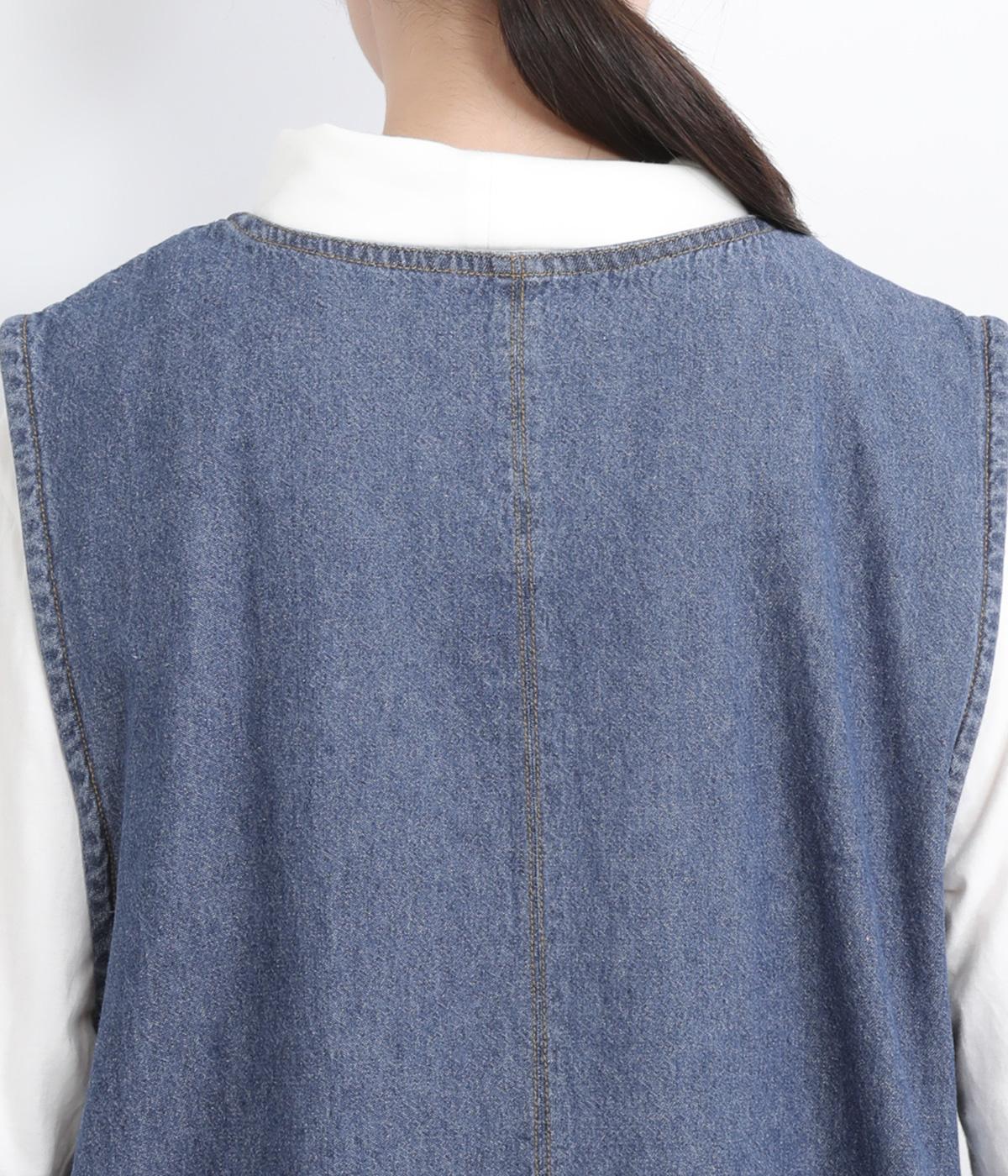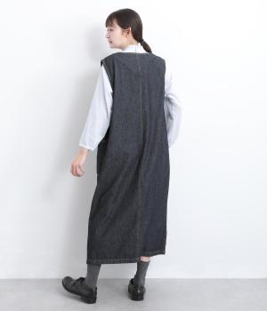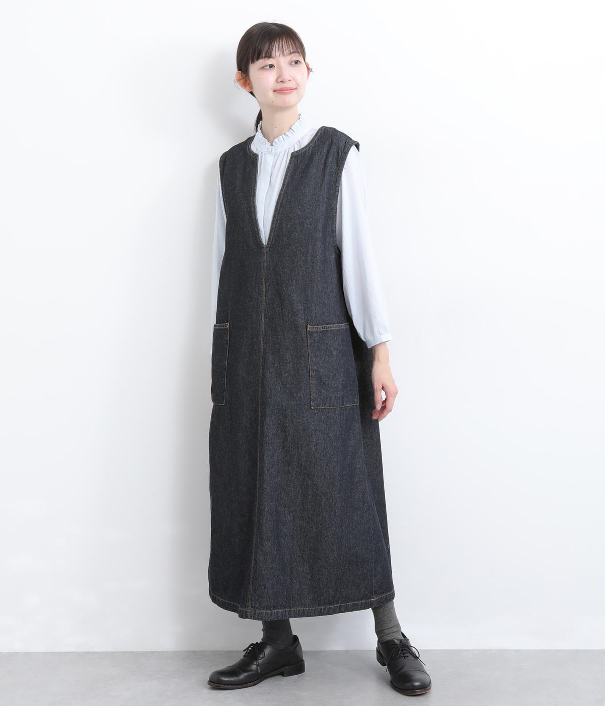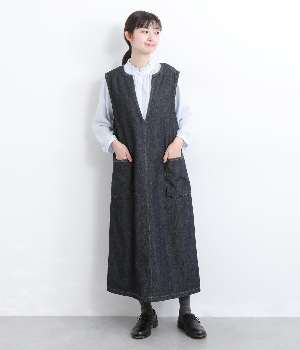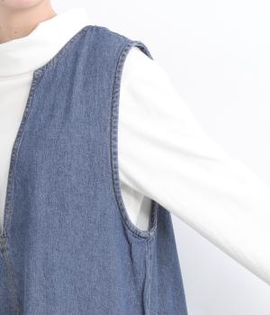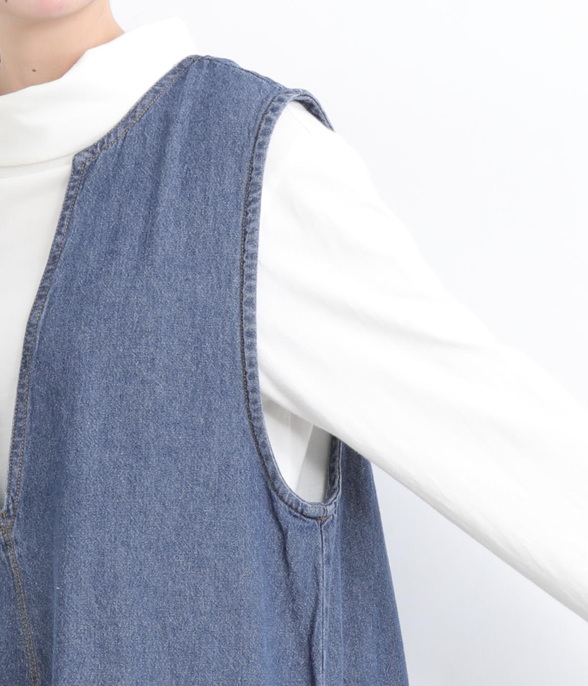 7.6ozデニムキーネックノースリーブワンピ(サックス-M)