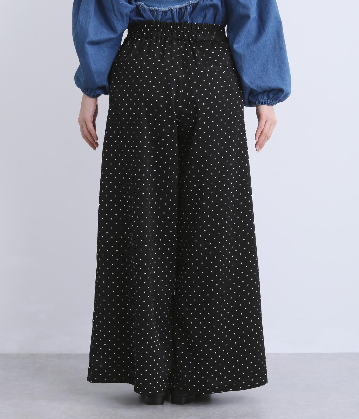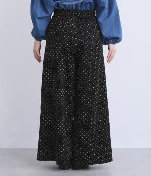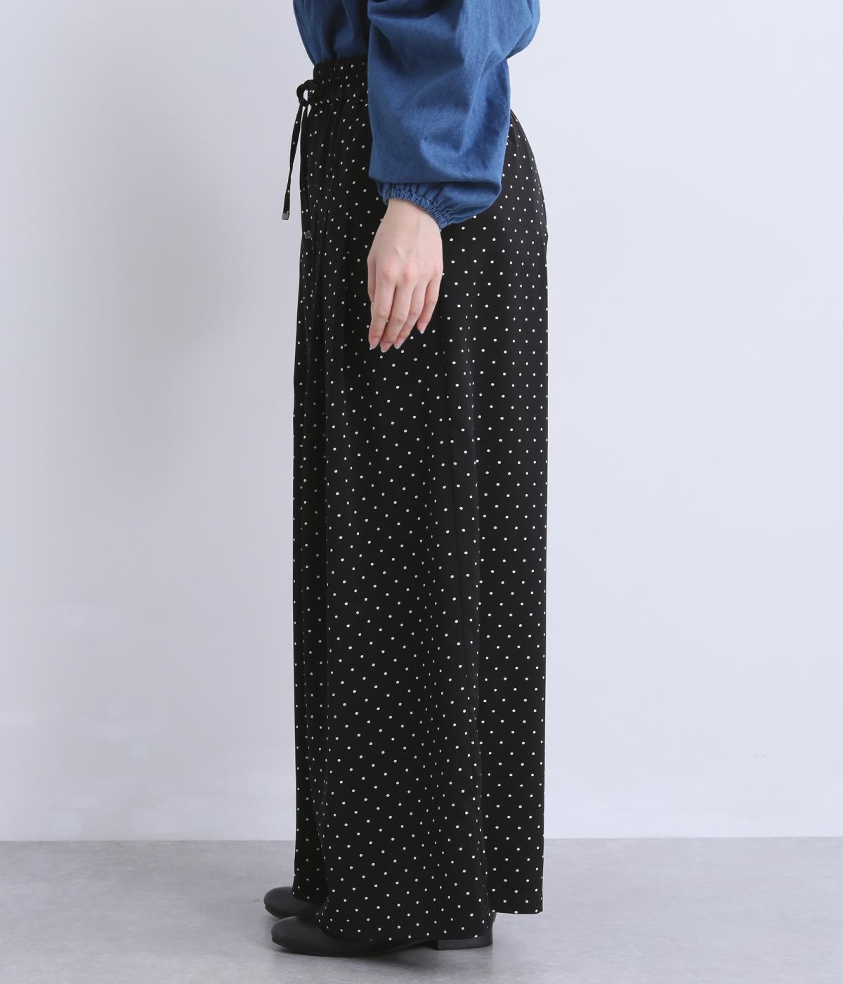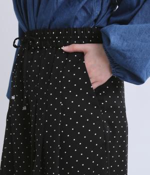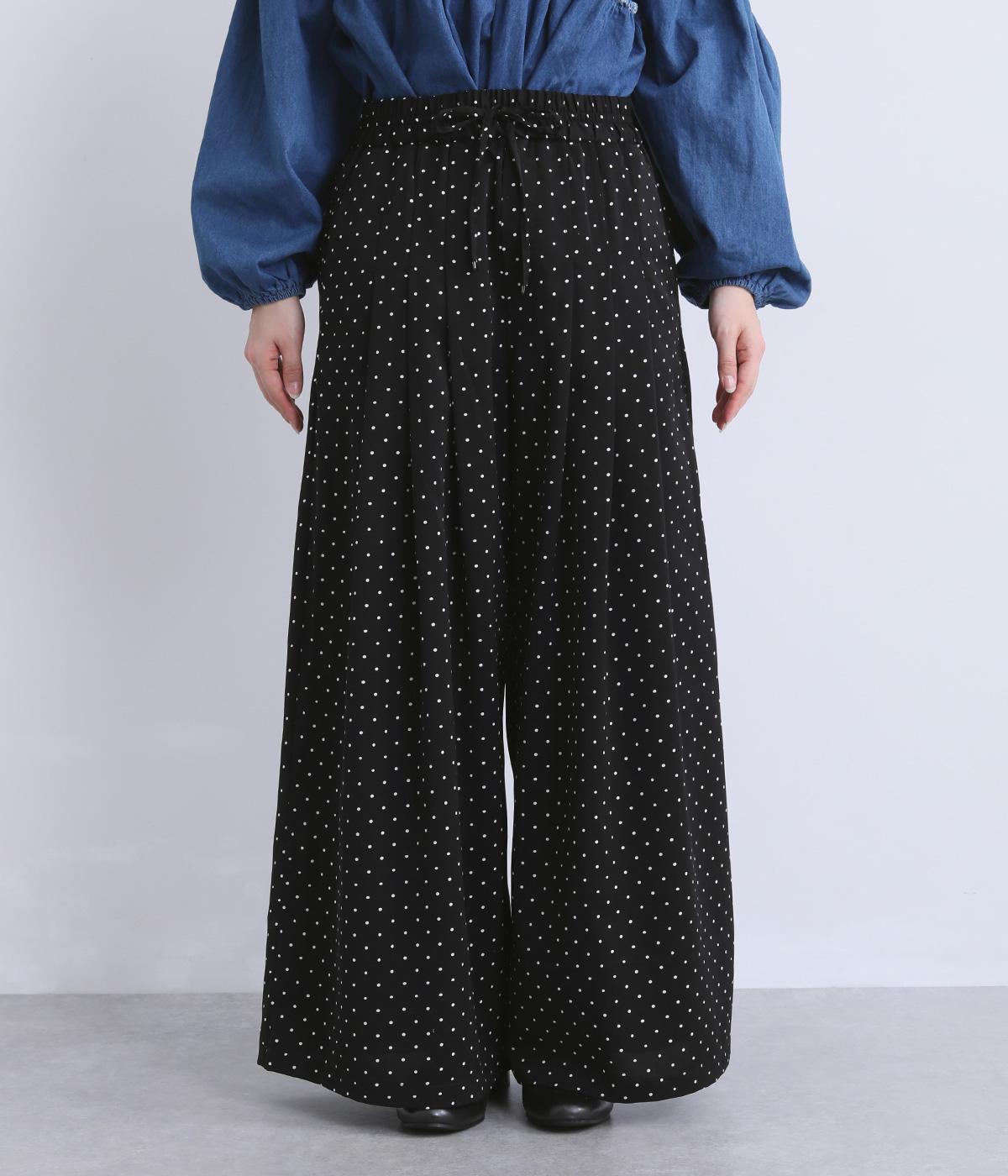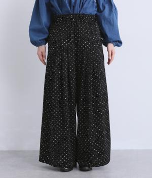 細かなドット柄で品のいい印象を与えるバギーパンツ。タックで腰まわりは広がりをおさえ、裾に向かってたっぷりとフレアに仕立てています。ウエストはオールゴムでフィット感が良く、紐を通しているので微調整も可能。