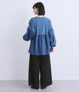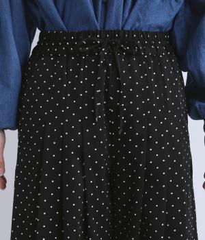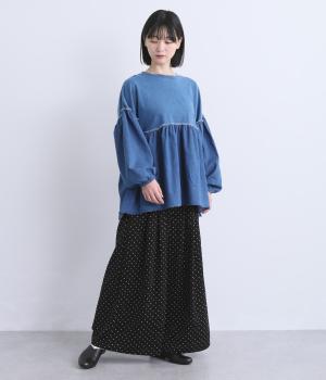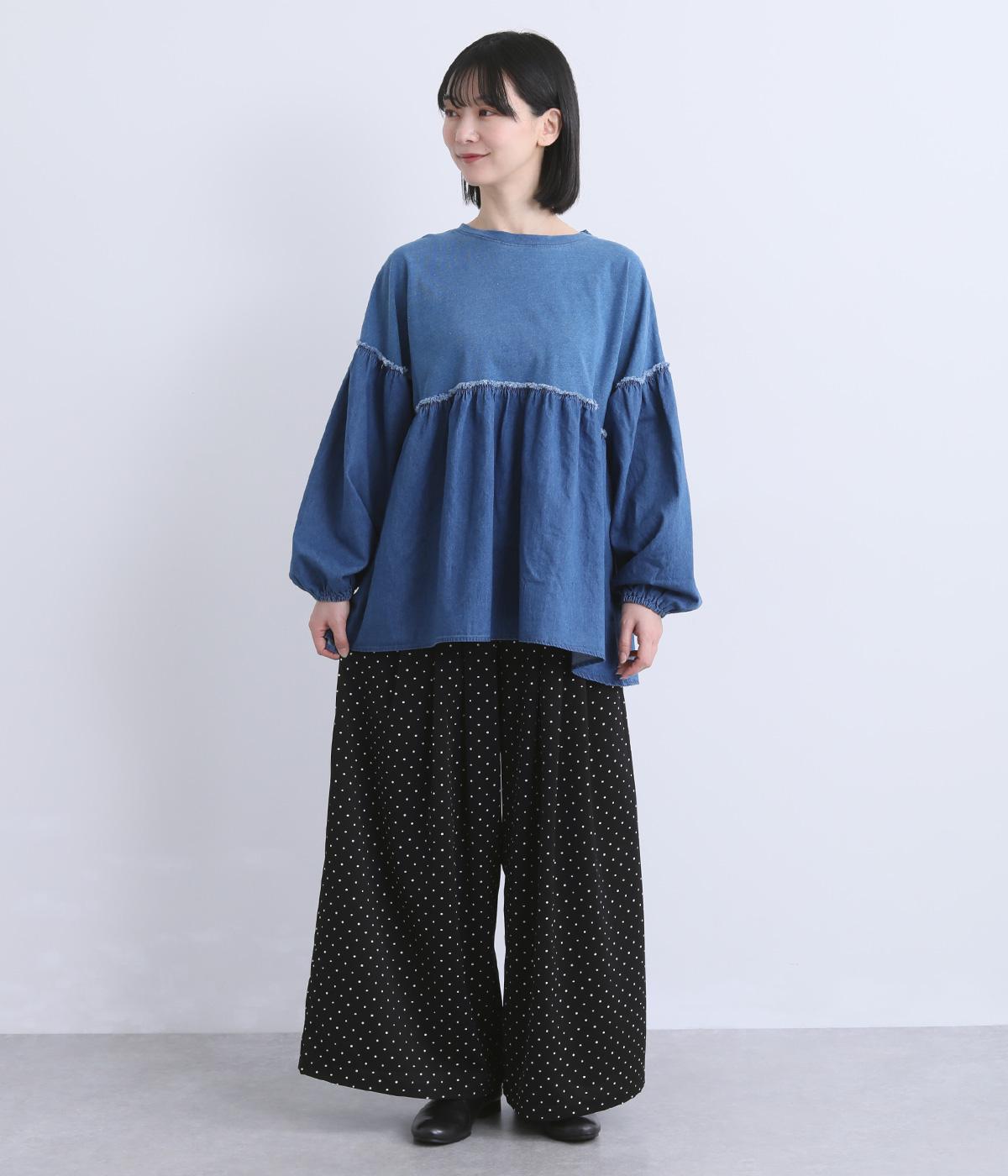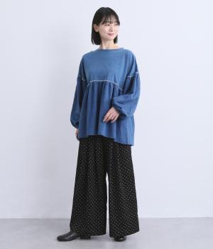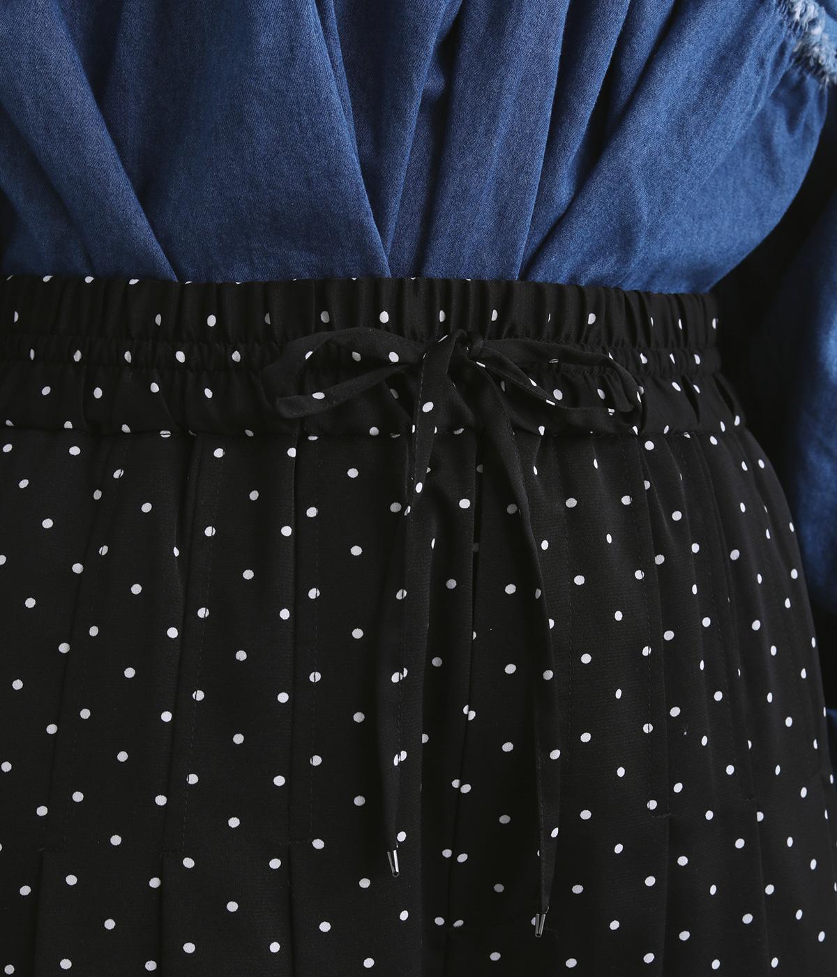 細かなドット柄で品のいい印象を与えるバギーパンツ。タックで腰まわりは広がりをおさえ、裾に向かってたっぷりとフレアに仕立てています。ウエストはオールゴムでフィット感が良く、紐を通しているので微調整も可能。