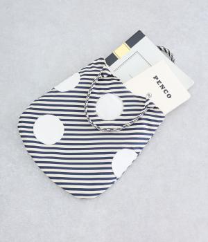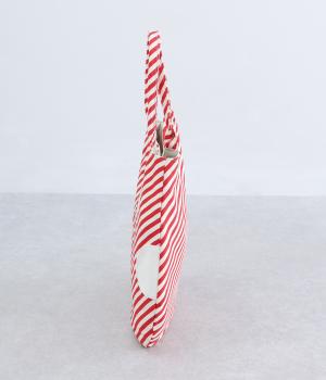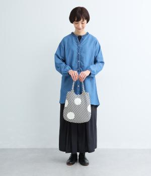 斜めにはしるストライプ生地に配した大きなドット柄が、コーディネートのアクセントになるバッグ。ドットのひとつはポケット仕様になっていて、さりげないこだわりを感じさせます。ちょっとしたお出かけにも持ちやすい、フラットですっきりとしたフォルムです。