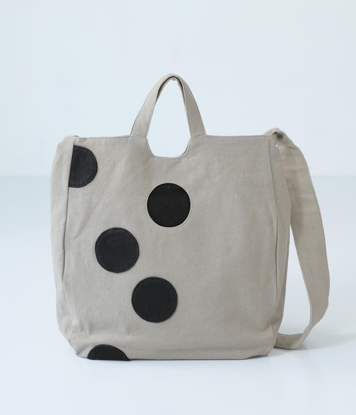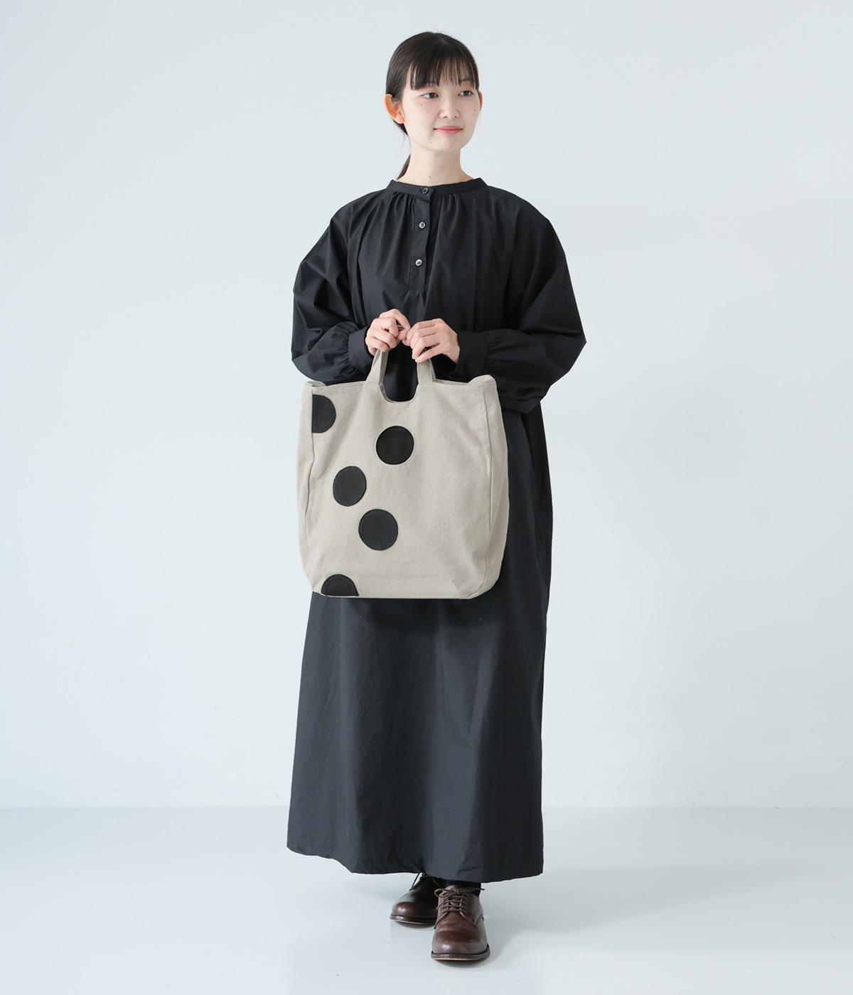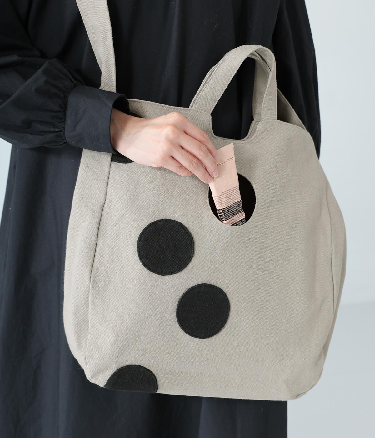 ランダムに配した大きなドットが印象的なバッグ。内ひとつのドットはポケットになった、遊び心あふれるデザインです。手持ちも肩掛けも可能な2way仕様で、内側にはファスナーポケットつき。マチを備えているので荷物をたっぷりと収納できます。