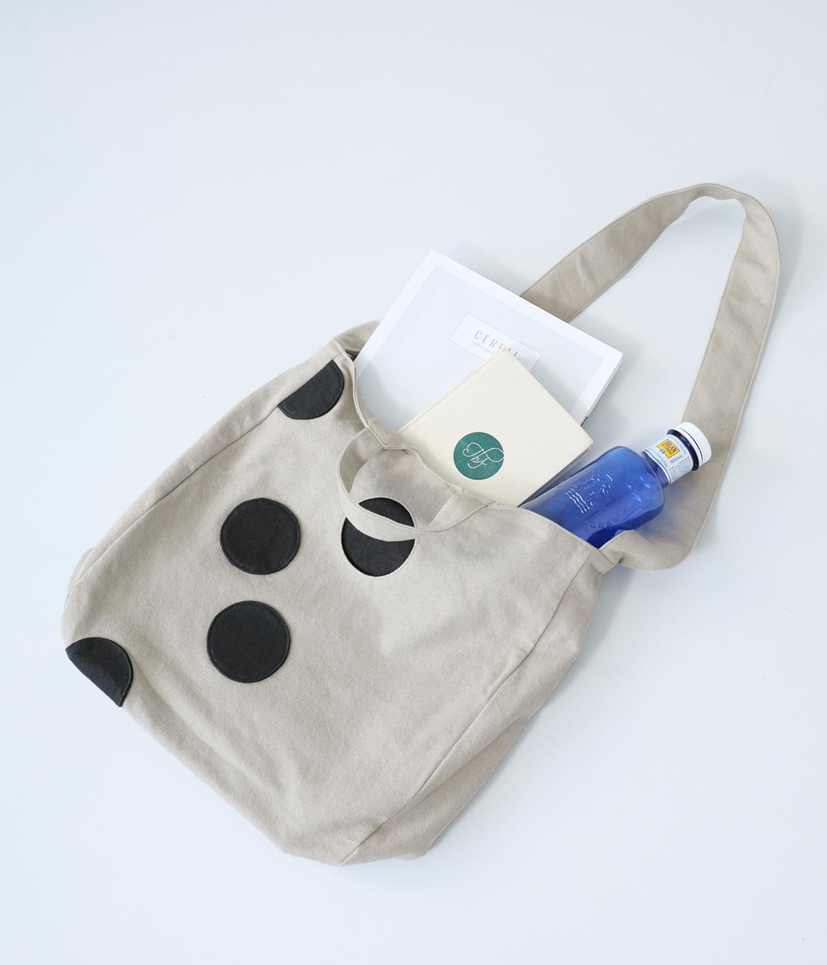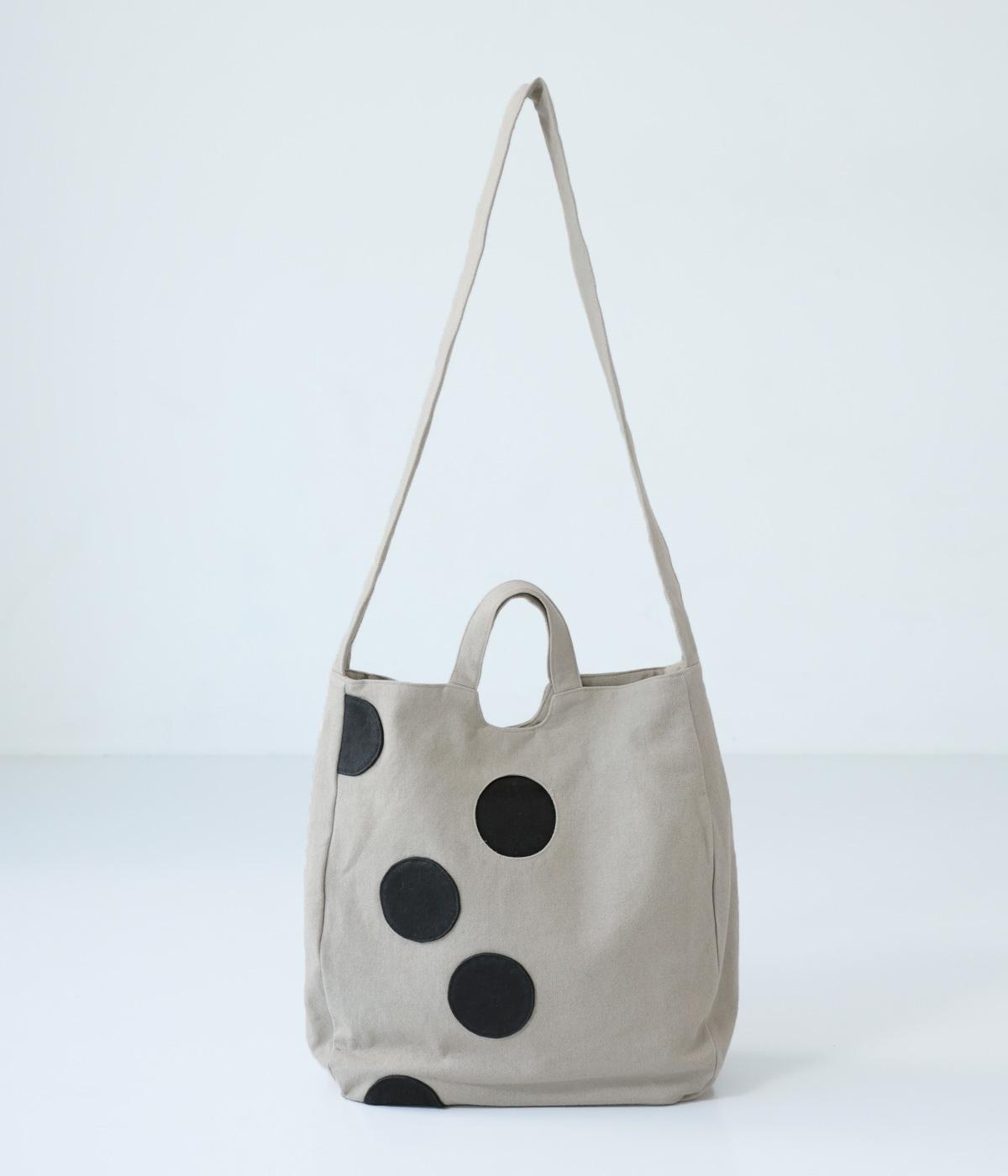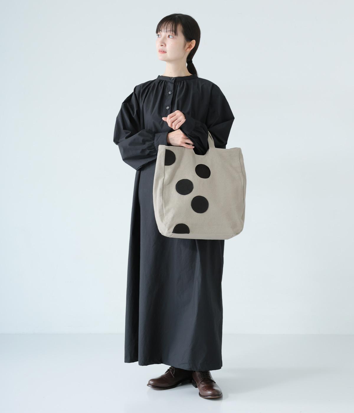 ランダムに配した大きなドットが印象的なバッグ。内ひとつのドットはポケットになった、遊び心あふれるデザインです。手持ちも肩掛けも可能な2way仕様で、内側にはファスナーポケットつき。マチを備えているので荷物をたっぷりと収納できます。