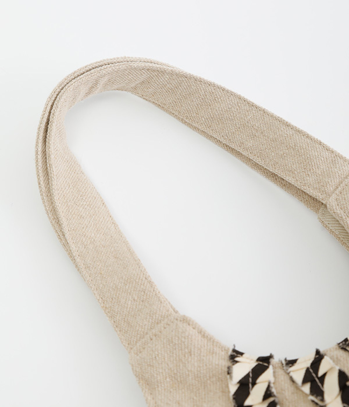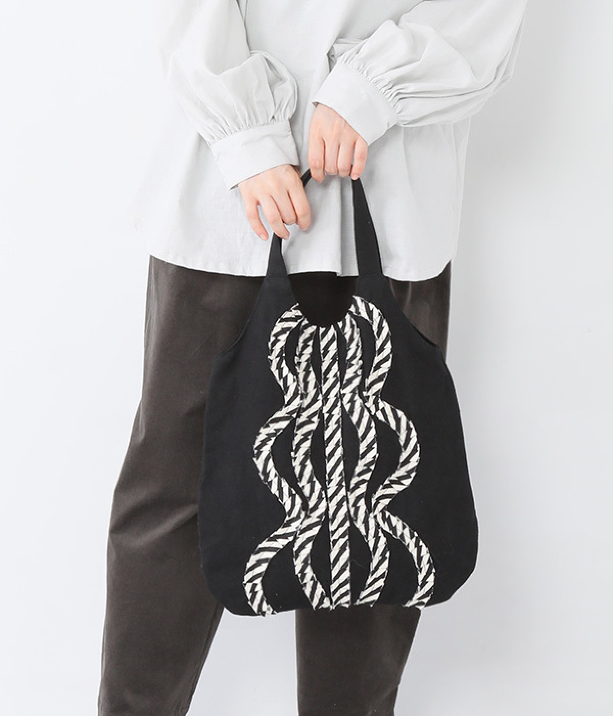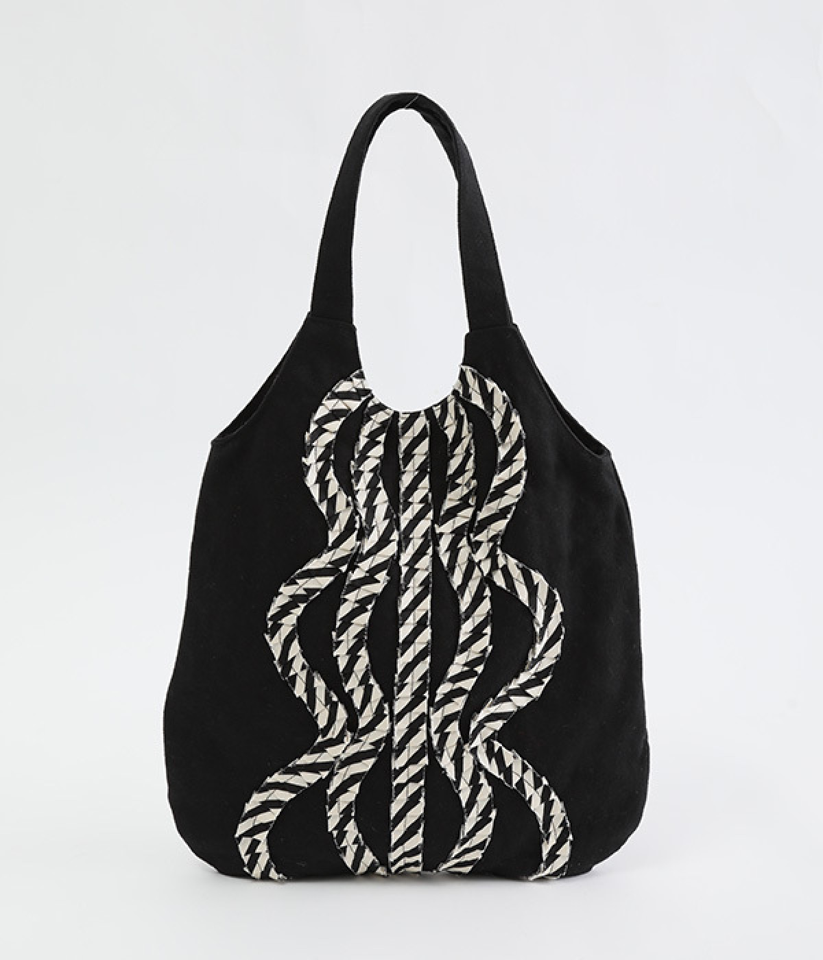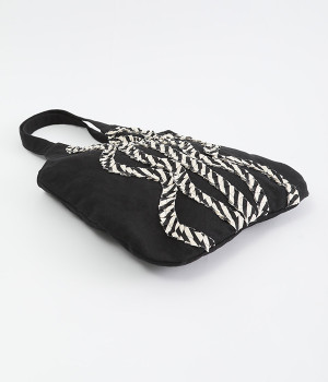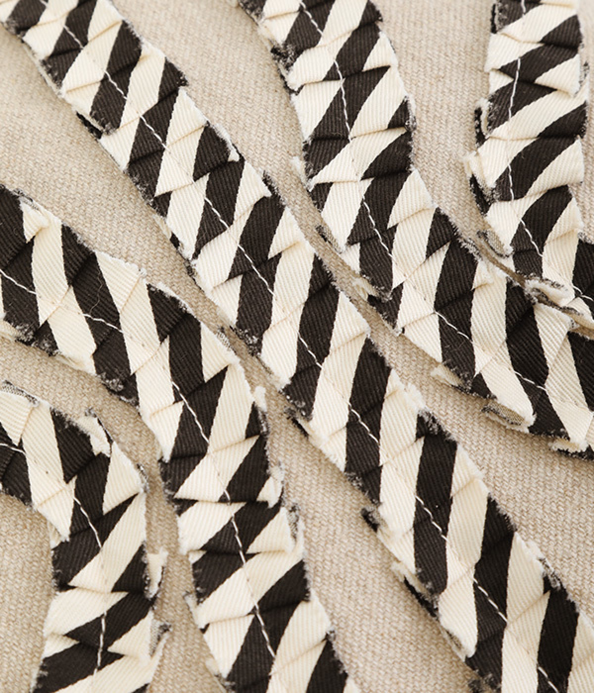 ストライプ布をシャコ貝のような形に縫いつけて遊び心を