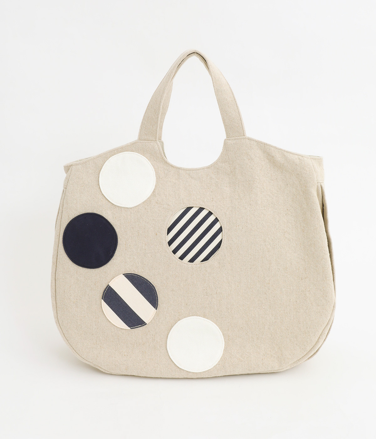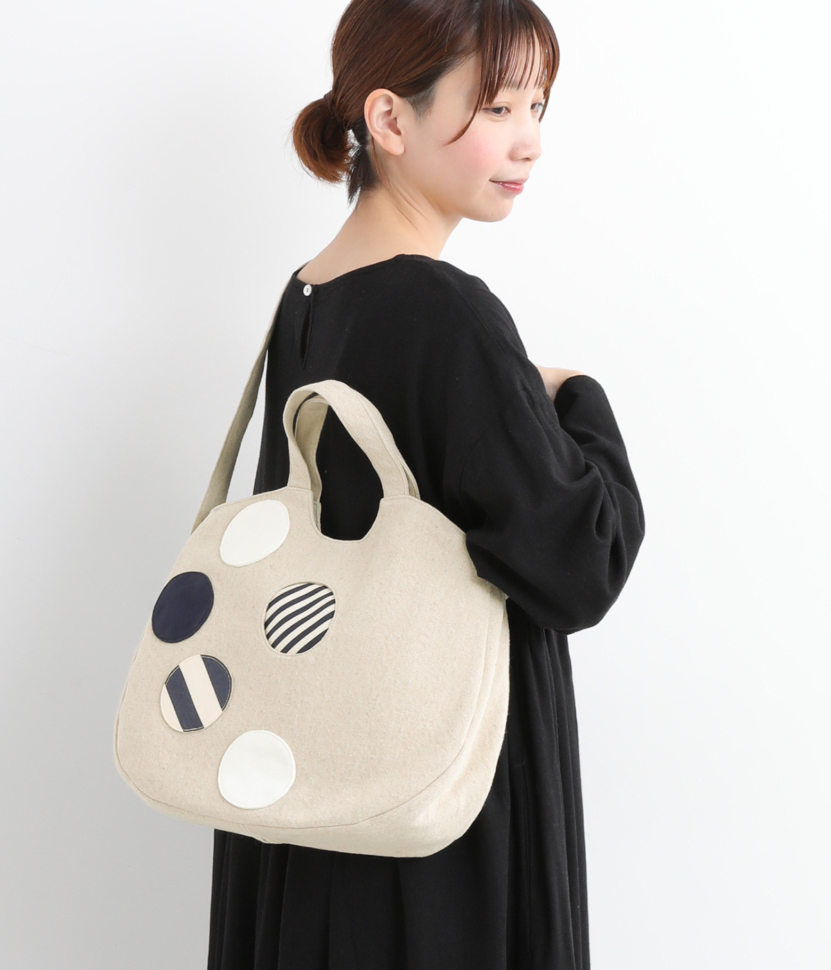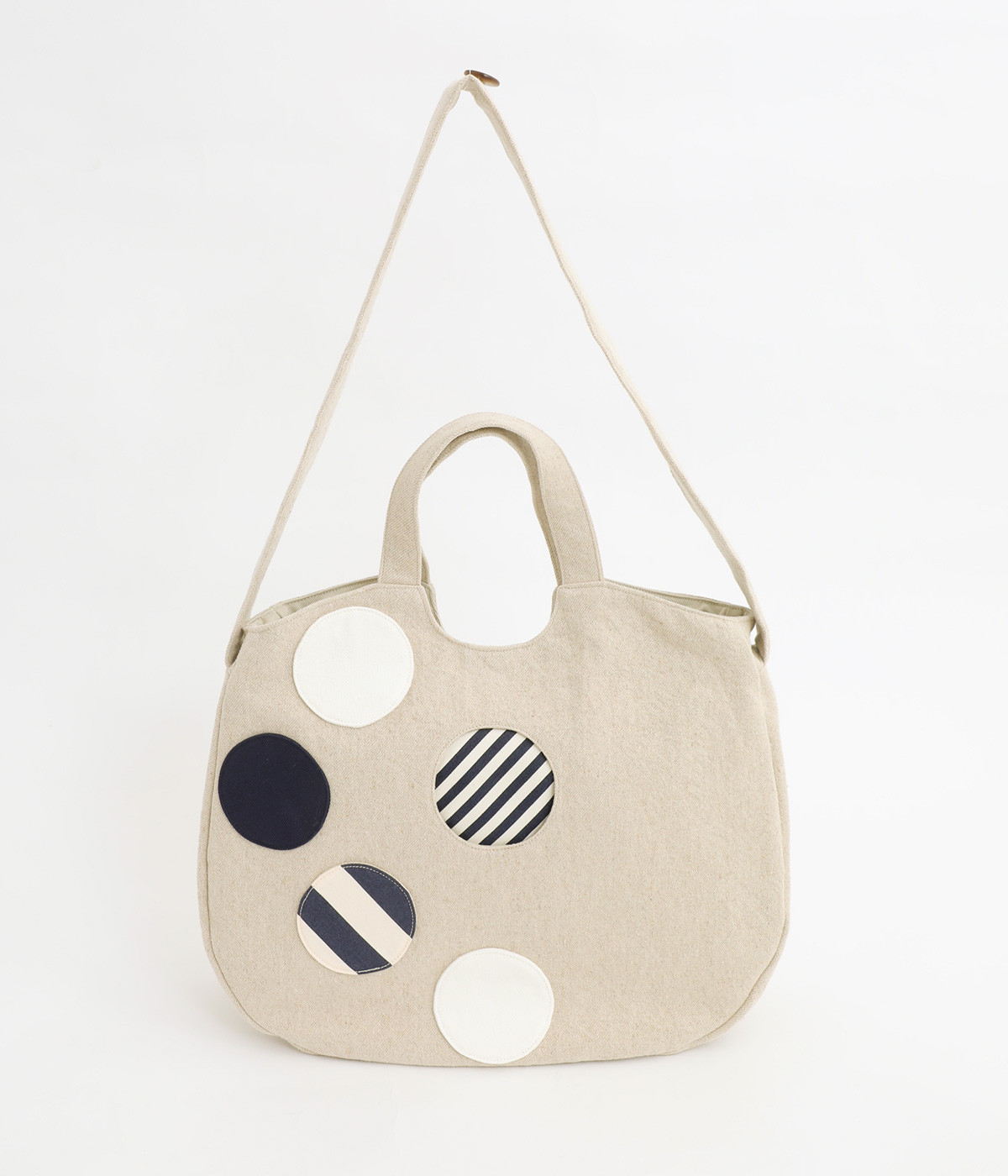 ポップなドットモチーフを散りばめ、一つがポケットとして使える遊び心と実用性を兼ね備えたバッグ。肩掛けもできる2way仕様で、ストラップは底のボタン留めで収納可能です。底マチや内ポケットもあり、収納力も◎。日常使いに活躍する一品です。