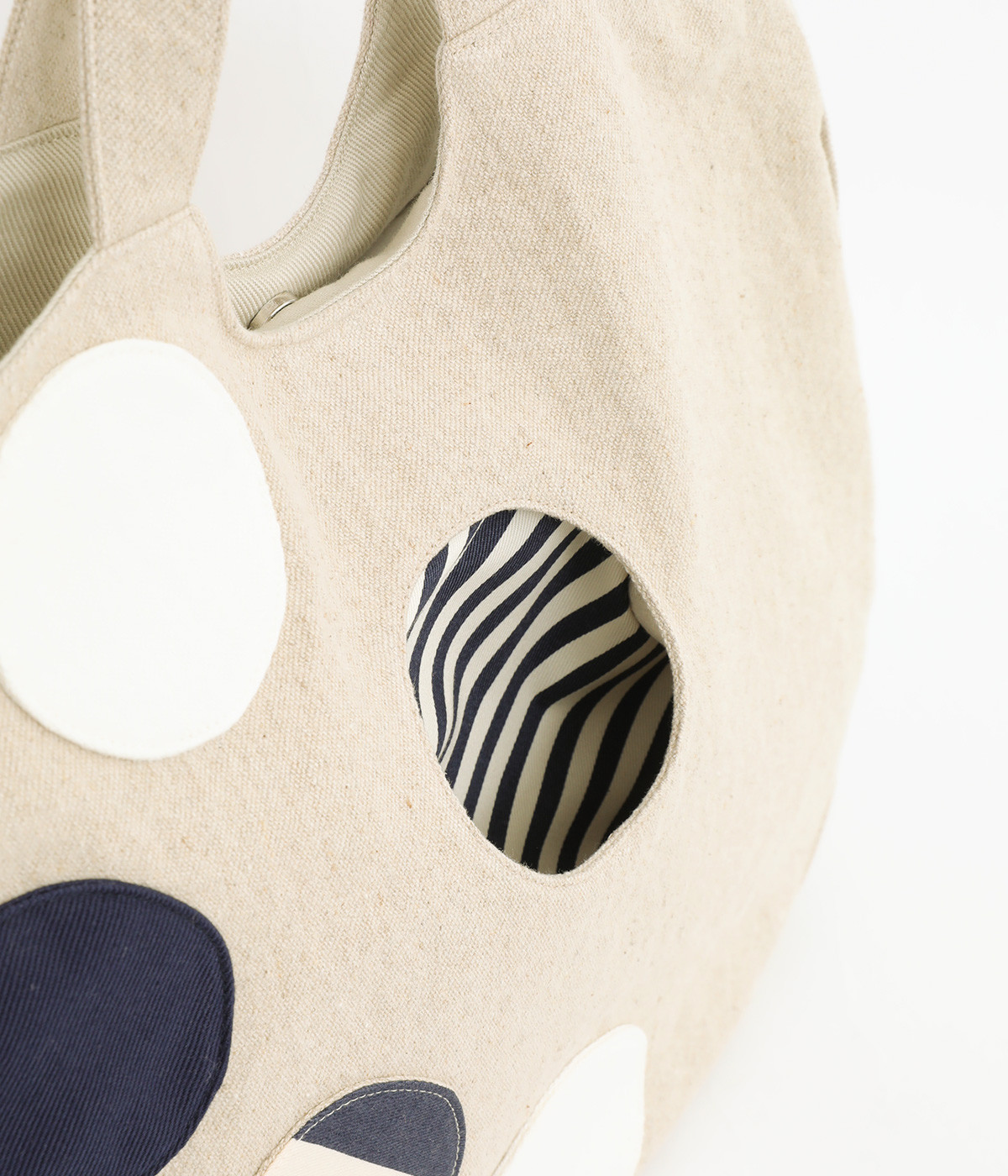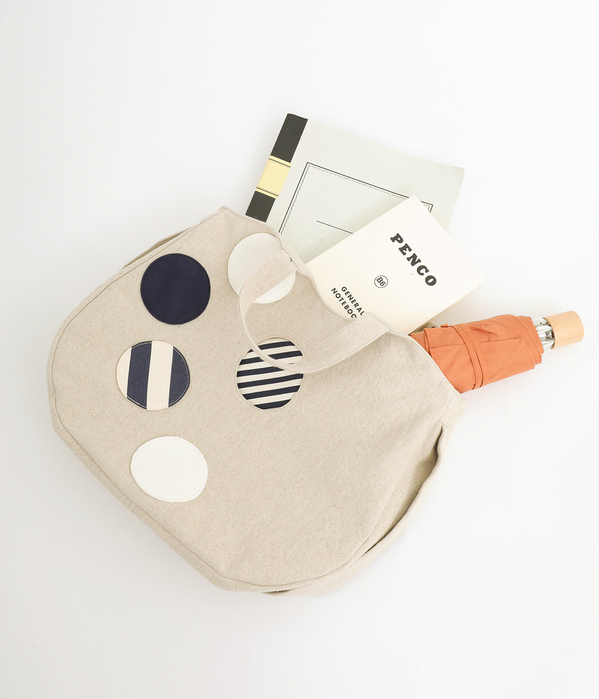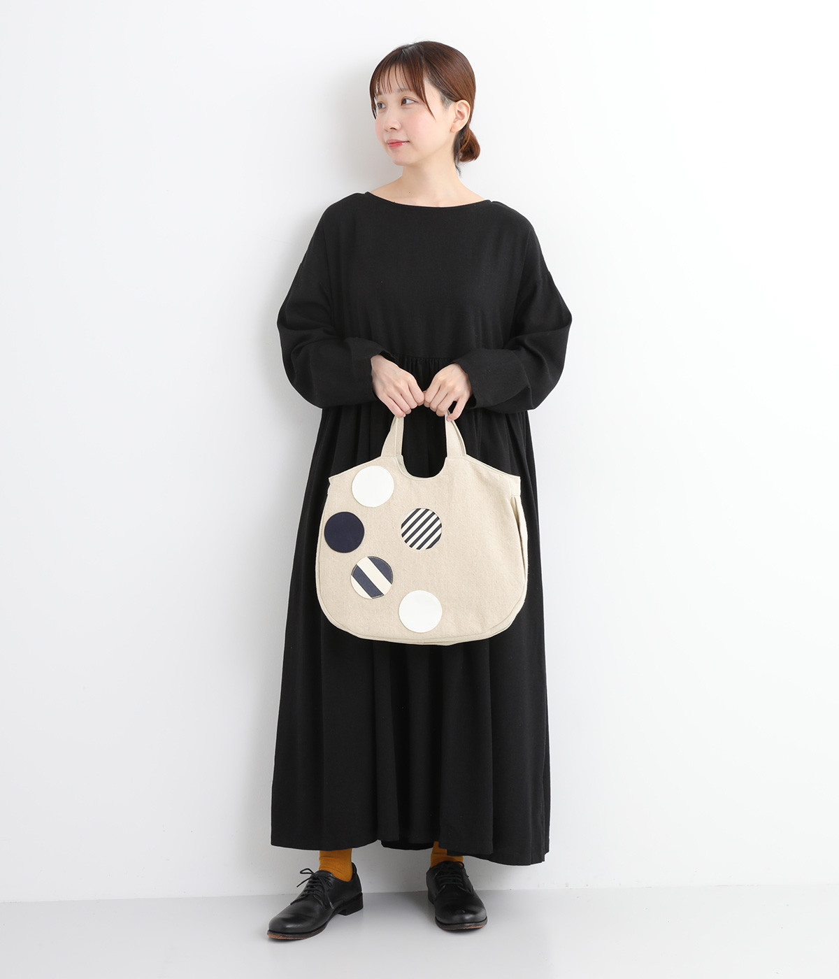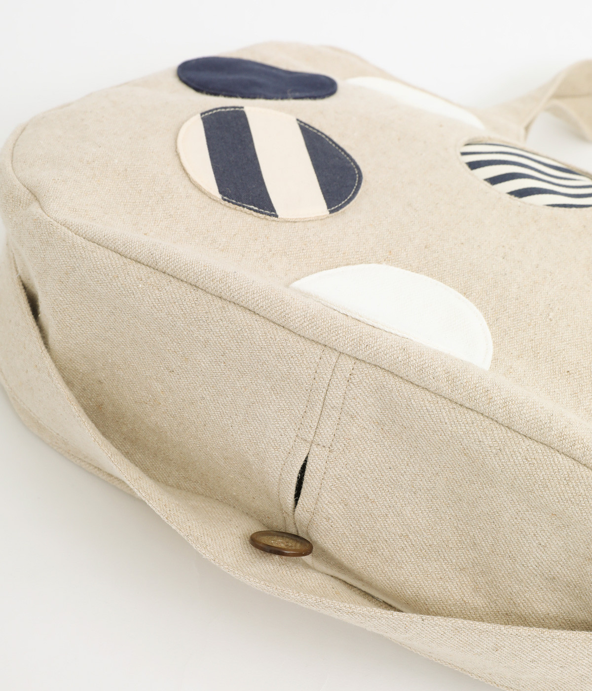 ポップなドットモチーフを散りばめ、一つがポケットとして使える遊び心と実用性を兼ね備えたバッグ。肩掛けもできる2way仕様で、ストラップは底のボタン留めで収納可能です。底マチや内ポケットもあり、収納力も◎。日常使いに活躍する一品です。