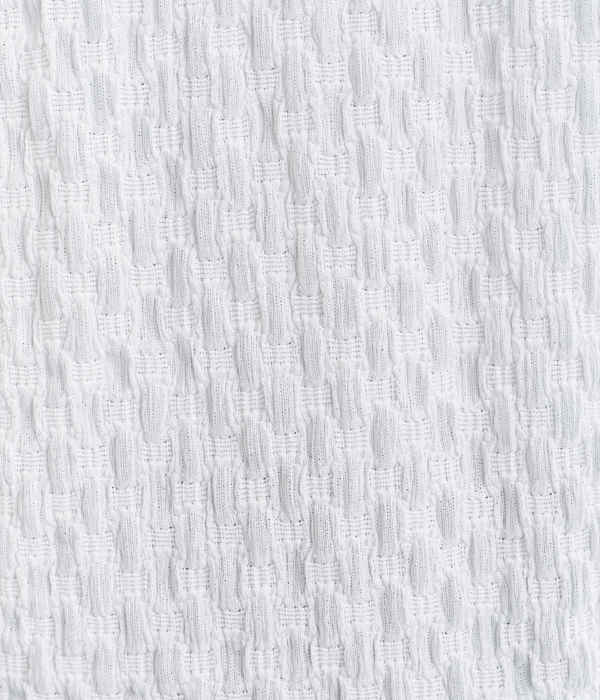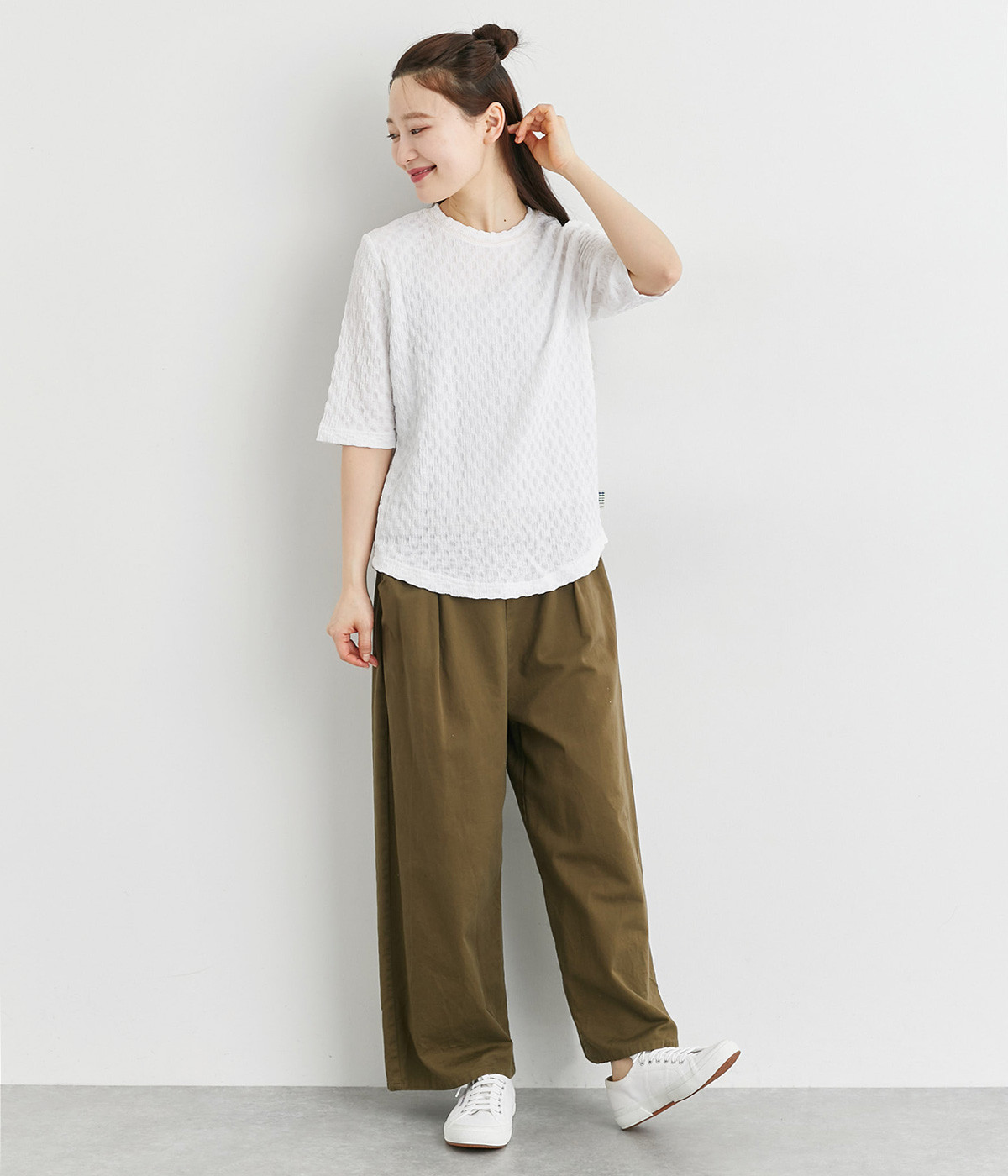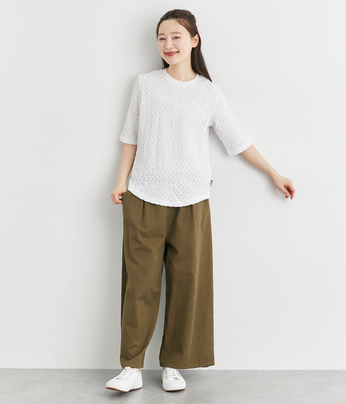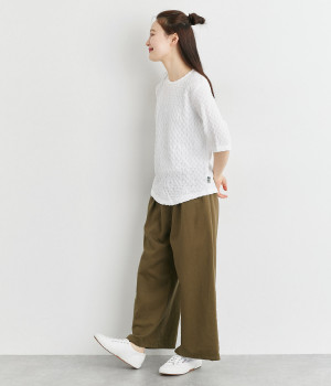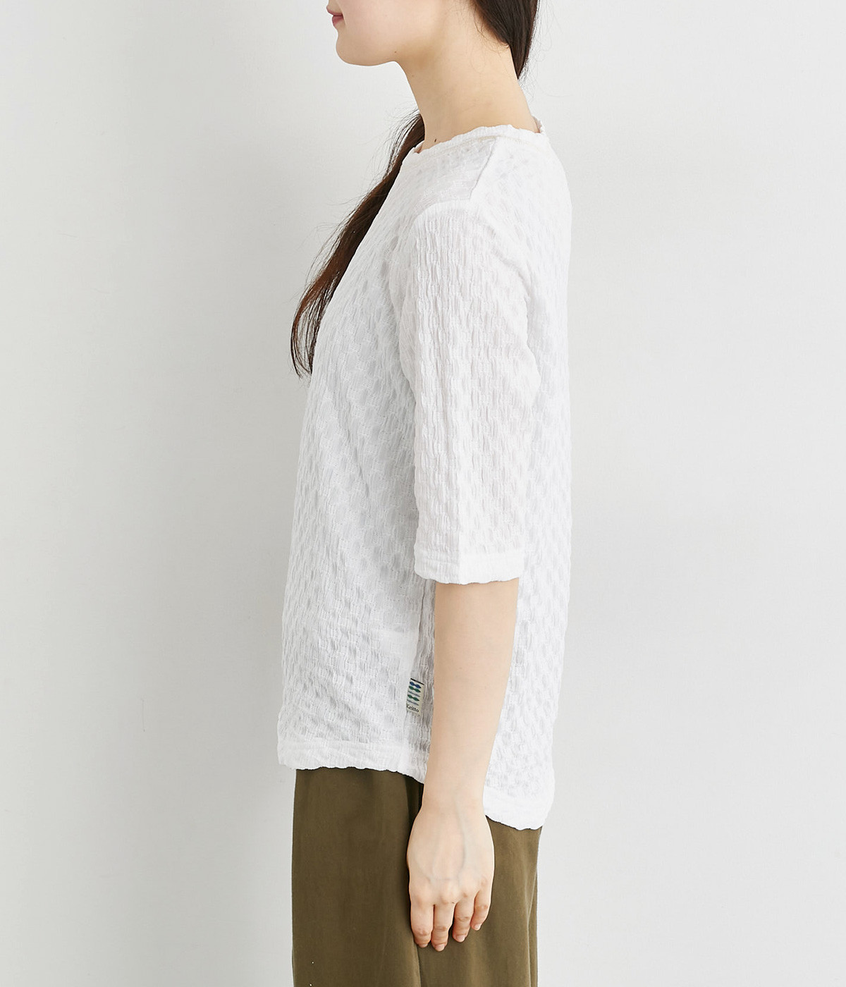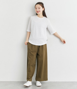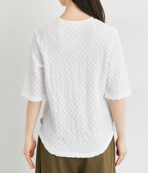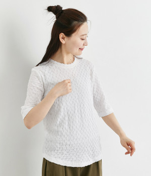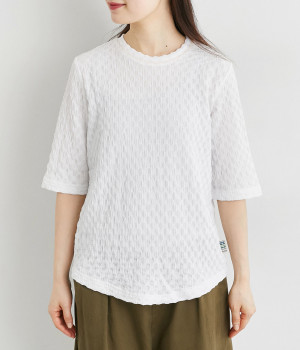 ブロック柄のシャーリング生地が特徴的なカットプルオーバーです。やや伸縮性があり肌へのまとわりが少ない生地感で、汗ばむ季節も快適に着用できます。