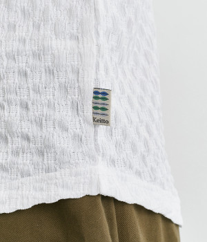 シンプルながらも生地感がアイキャッチになり、着こなしのメインにもなる仕上がりです。首まわりに入れたさりげない配色の3本針ステッチがこだわり。北欧食器をイメージした柄のピスネームをワンポイントにつけました。