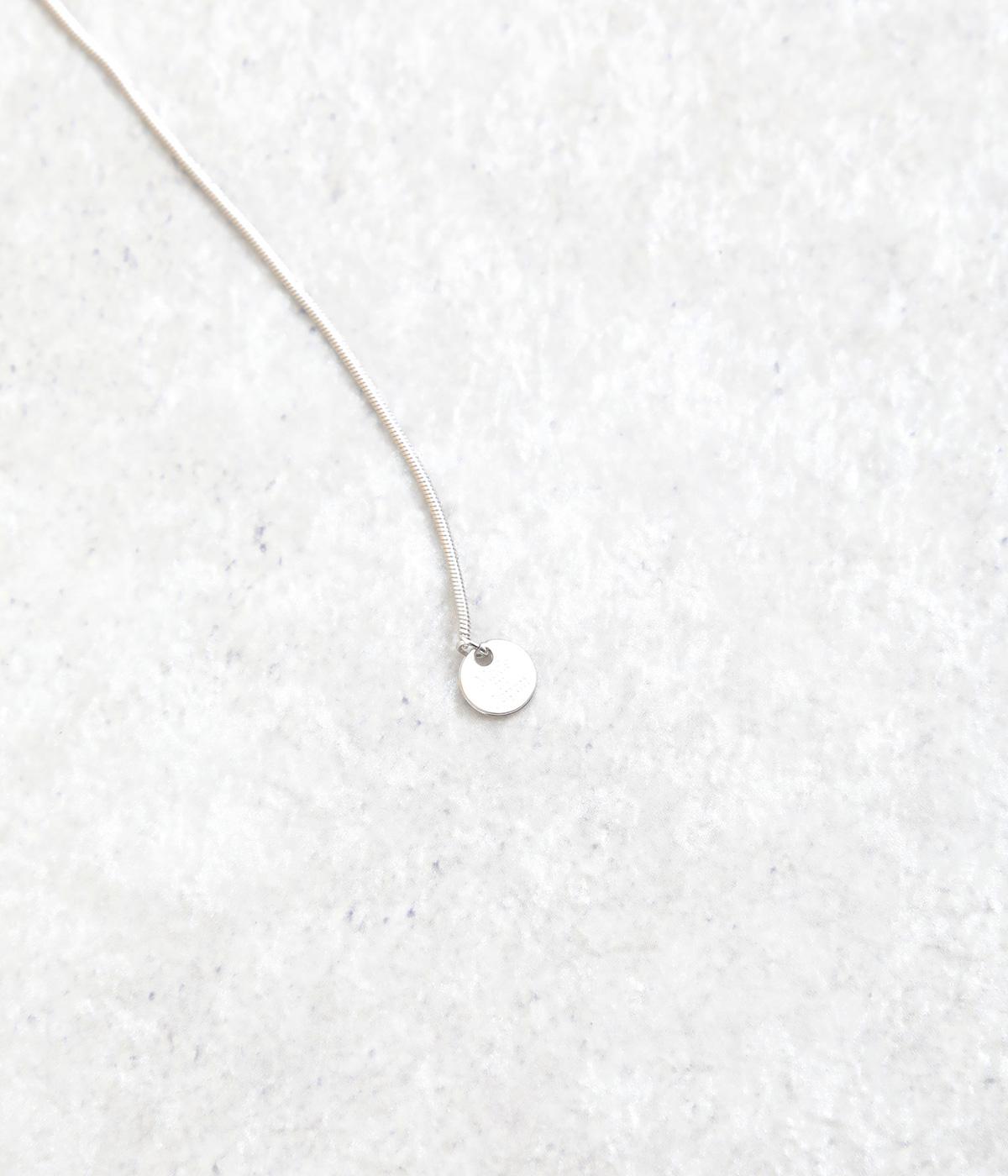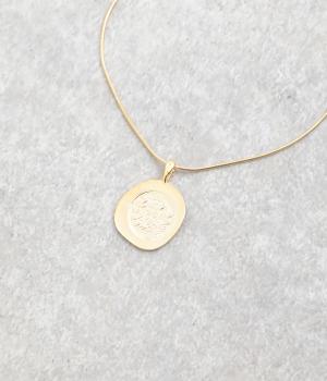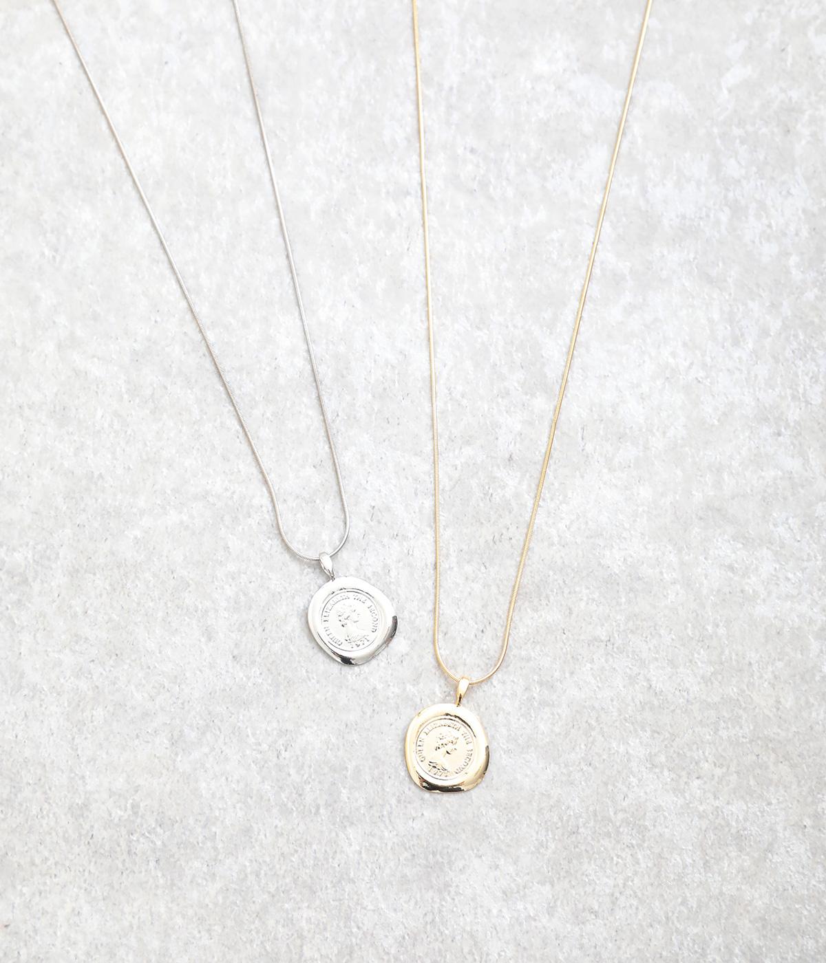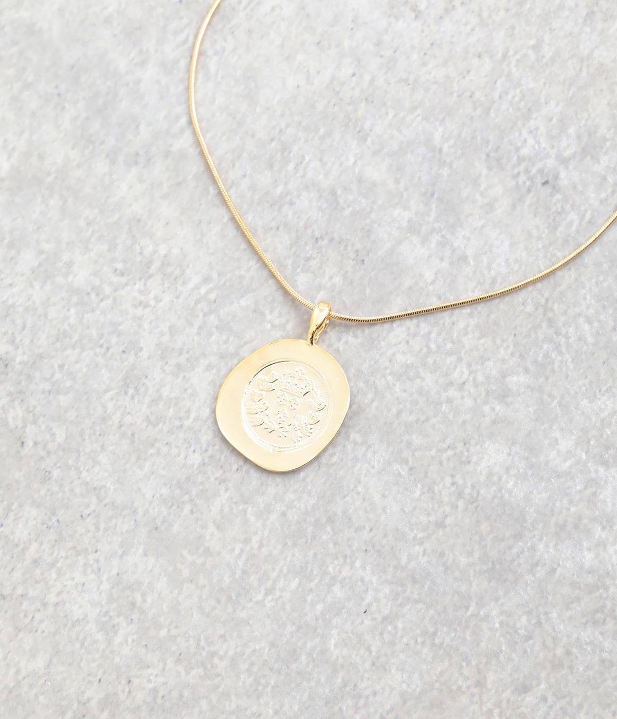 カジュアルからきれいめまで幅広く対応できるコインモチーフのネックレスです。ミディアムからショートまでお好みのバランスで着用できます。チェーンネックレスなどとの重ねつけもおすすめです。