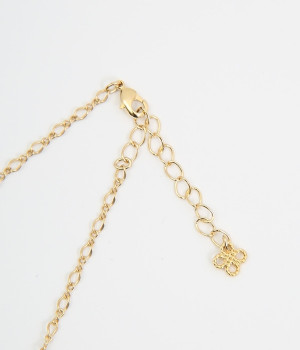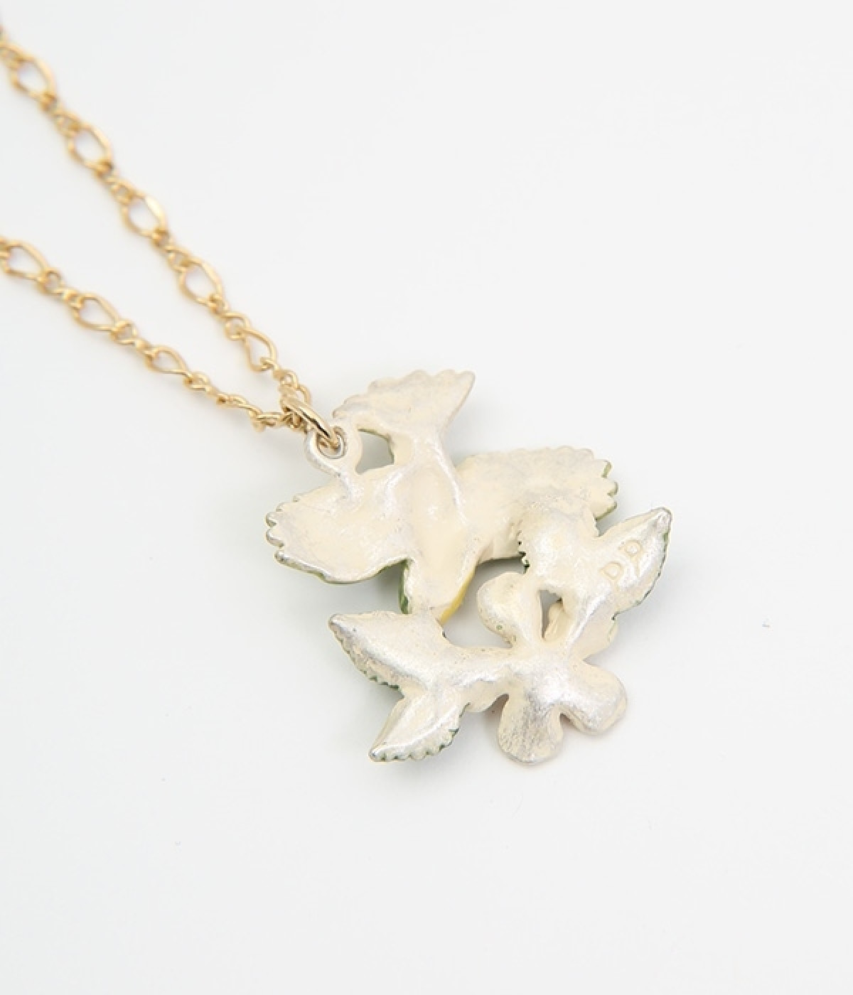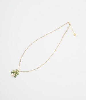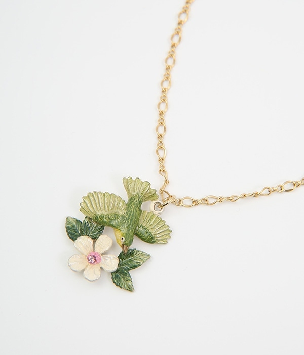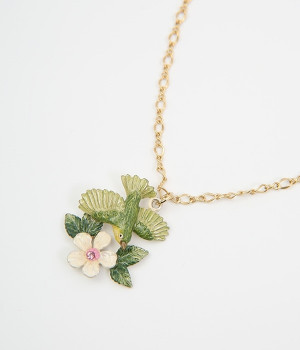 メジロがリンゴの花の蜜を吸いに飛んできた様子をイメージして作られたネックレスです。羽の重なりや毛並み、花脈など細部まで丁寧に作りこまれたアイテム。花芯にはキラキラと光るラインストーンをあしらいました。チェーンの長さを調節ができるアジャスター付き。存在感のあるデザインですが優しい色合いを採用しているので、大人の装いとも品よくマッチします。