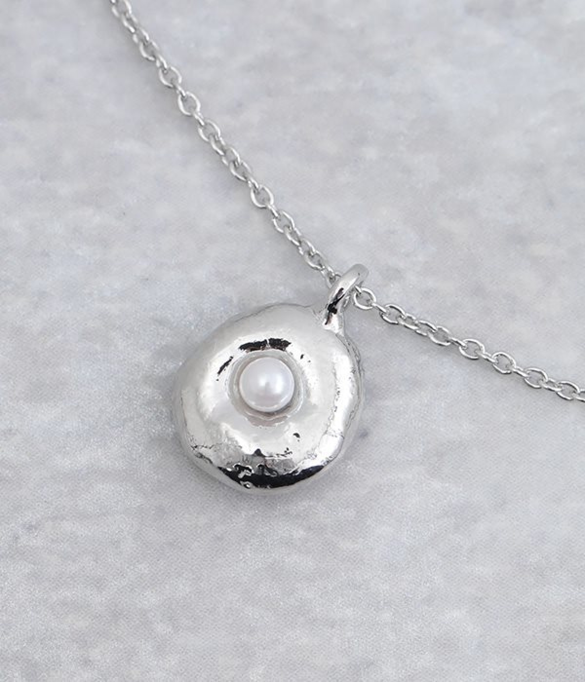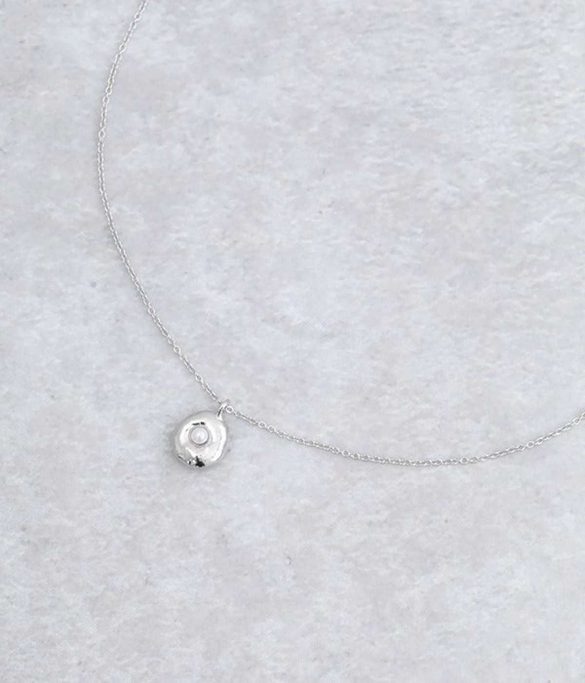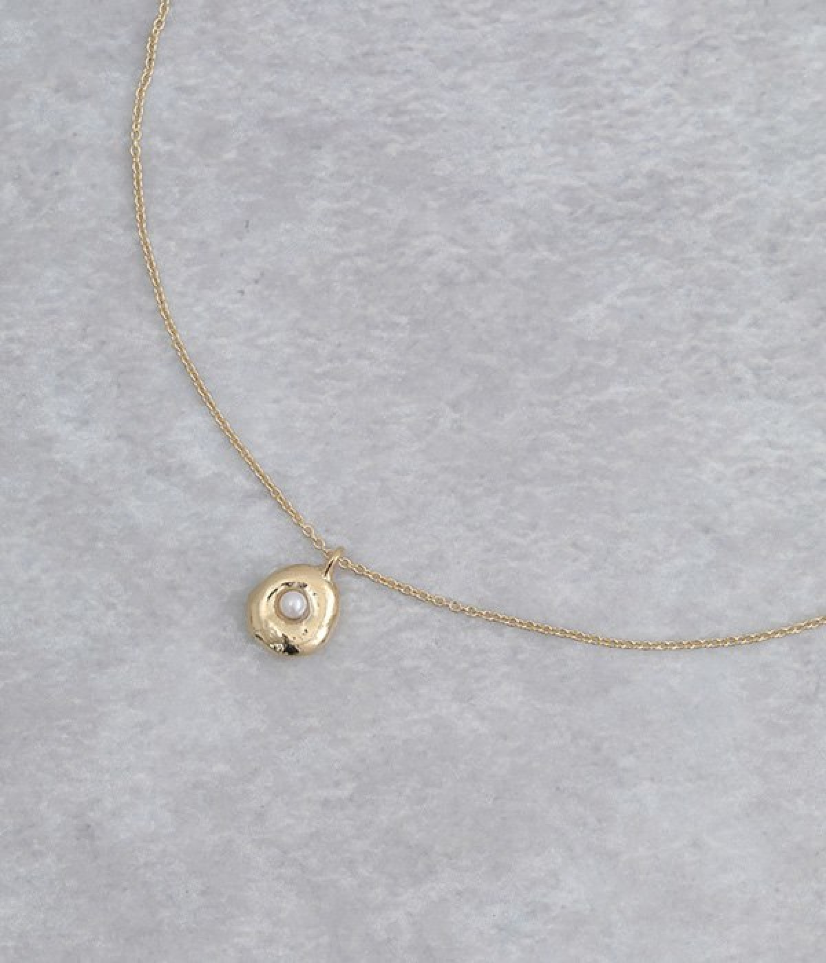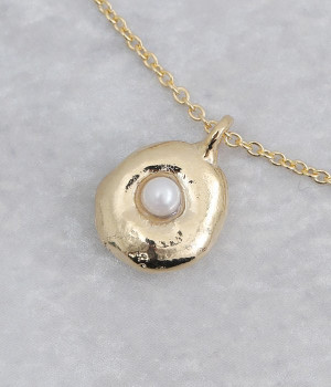 メタルパーツにパールが埋め込まれたモチーフが目を惹くネックレスです。いびつなフォルムがやわらかな光を放ち、首もとをさりげなく華やかに見せてくれます。小ぶりなデザインなので、短めのパールネックレスやシンプルなチェーンネックレスとの重ね付けも楽しめます。チェーンはアジャスターで長さの調整が可能なので、トップスに合わせてアレンジするのも◎。