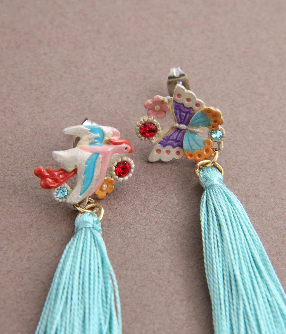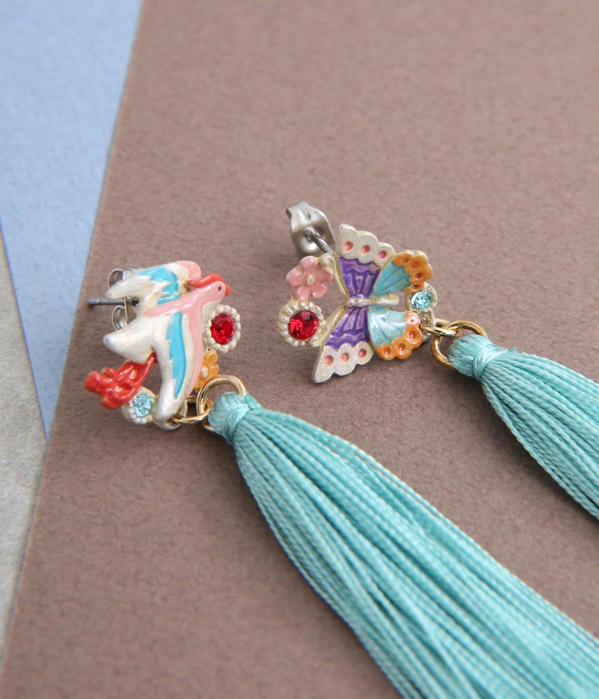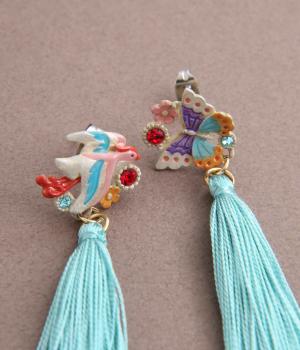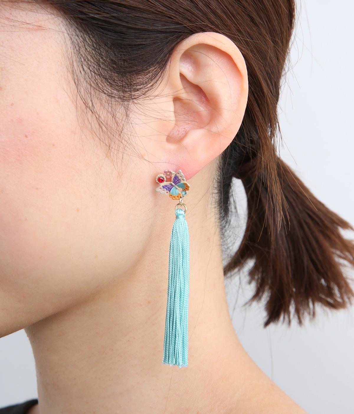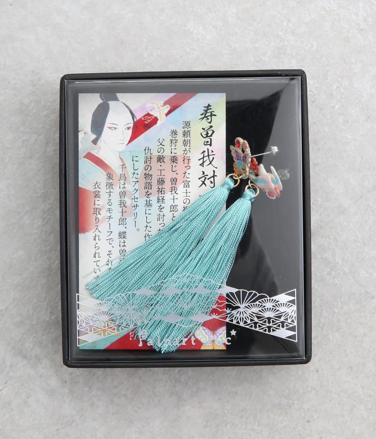 歌舞伎の演目『寿曽我対面』をモチーフにした、個性あふれるピアスです。物語に登場する、曽我兄弟の衣装モチーフや色彩をふんだんに取り入れました。桃色や橙色、紫などの鮮やかな差し色をちりばめ、身に付けるだけで、活気と華やかさを感じられるアイテムです。