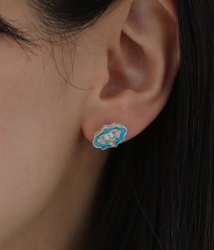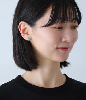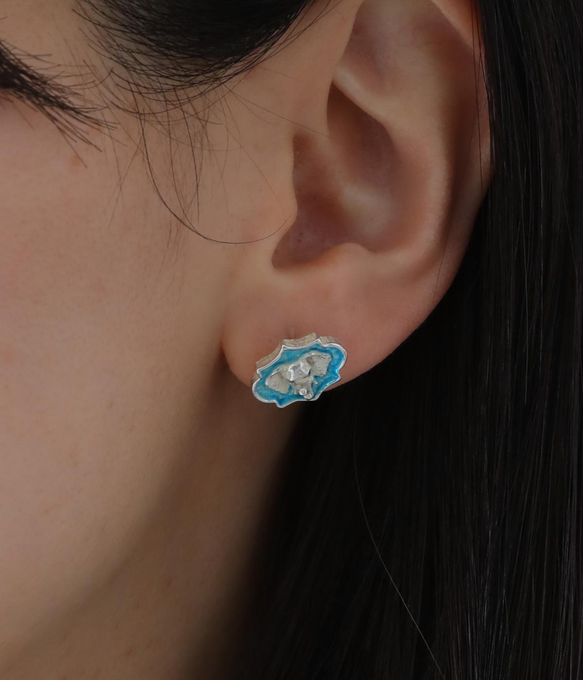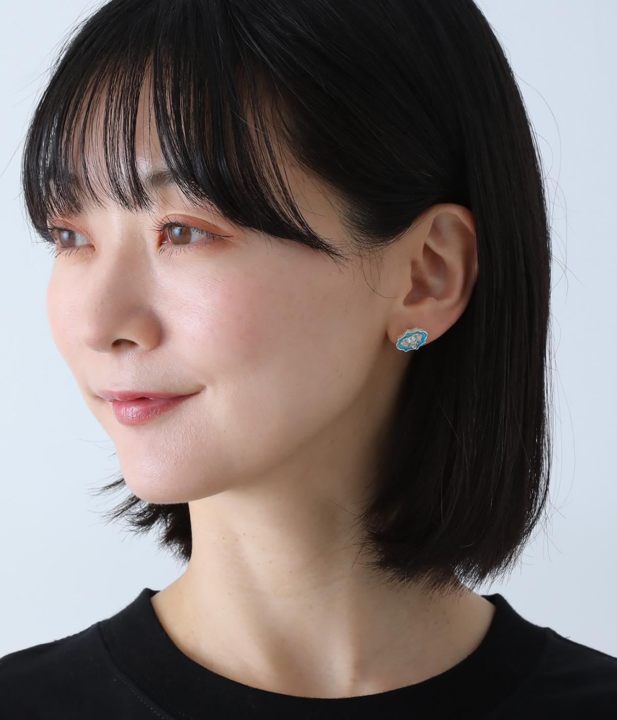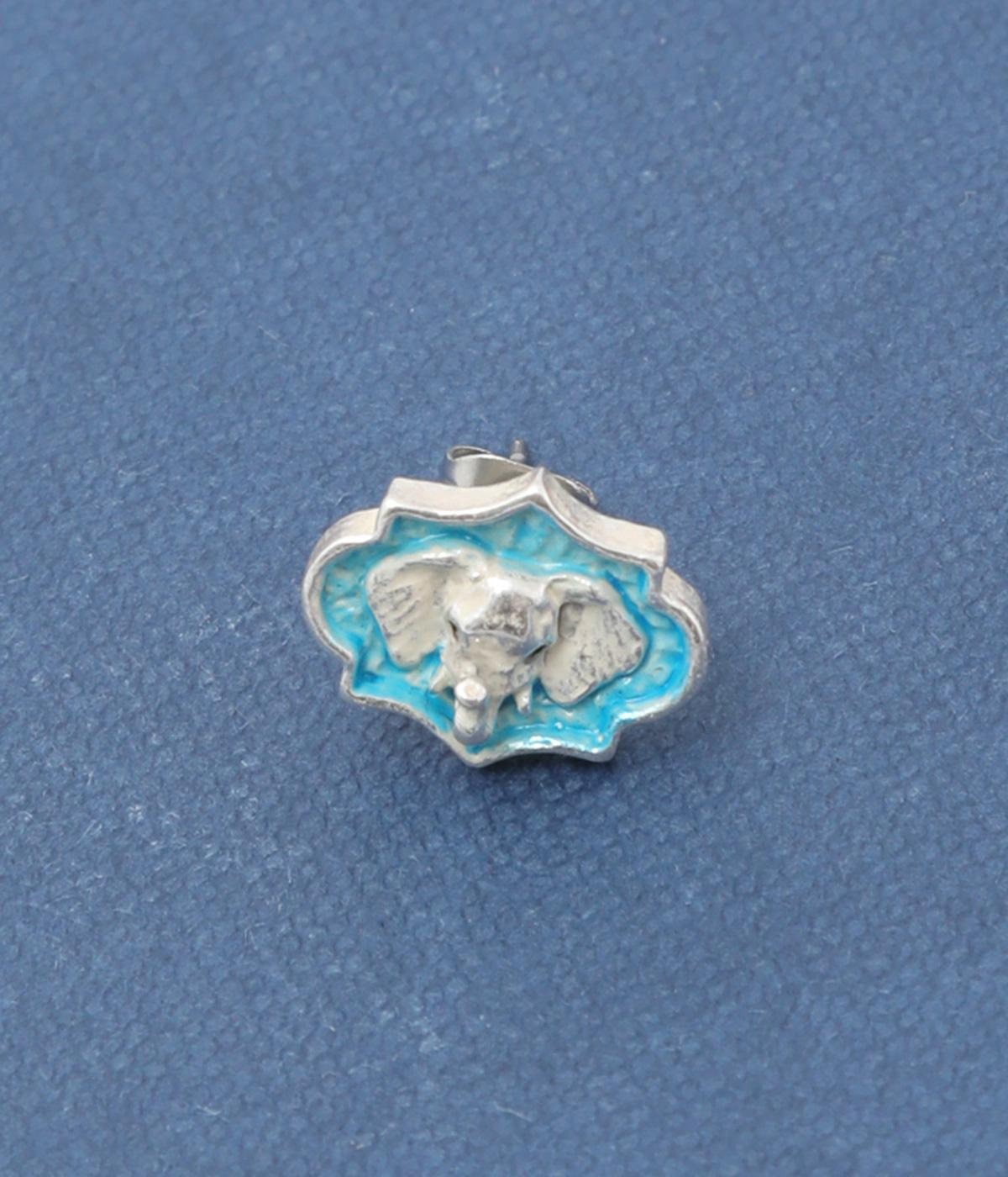 ゾウのエンブレムと楕円パーツのアシンメトリーピアス。ゾウが水浴びを楽しむ姿をイメージした、水色とシルバーを基調としたデザインです。沈着や聡明さを意味するアクアマリンをイメージした爽やかなカラーが、コーディネートを美しく引き立てます。