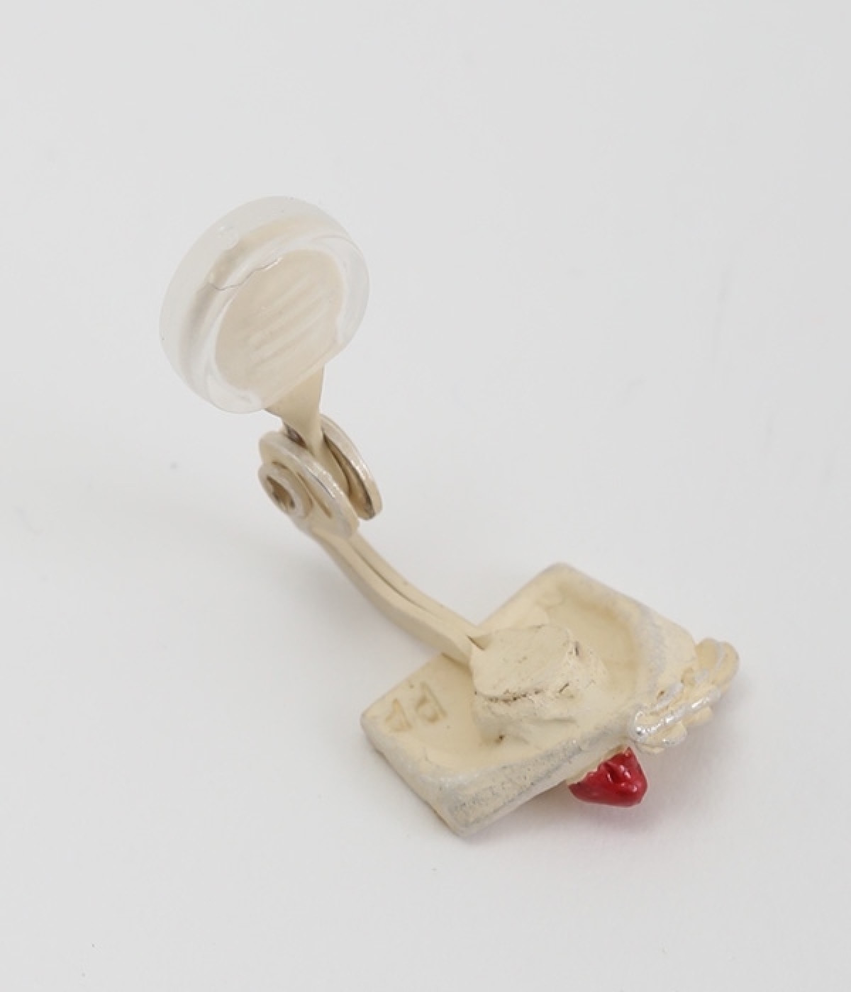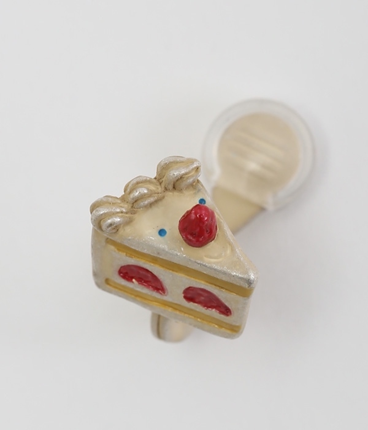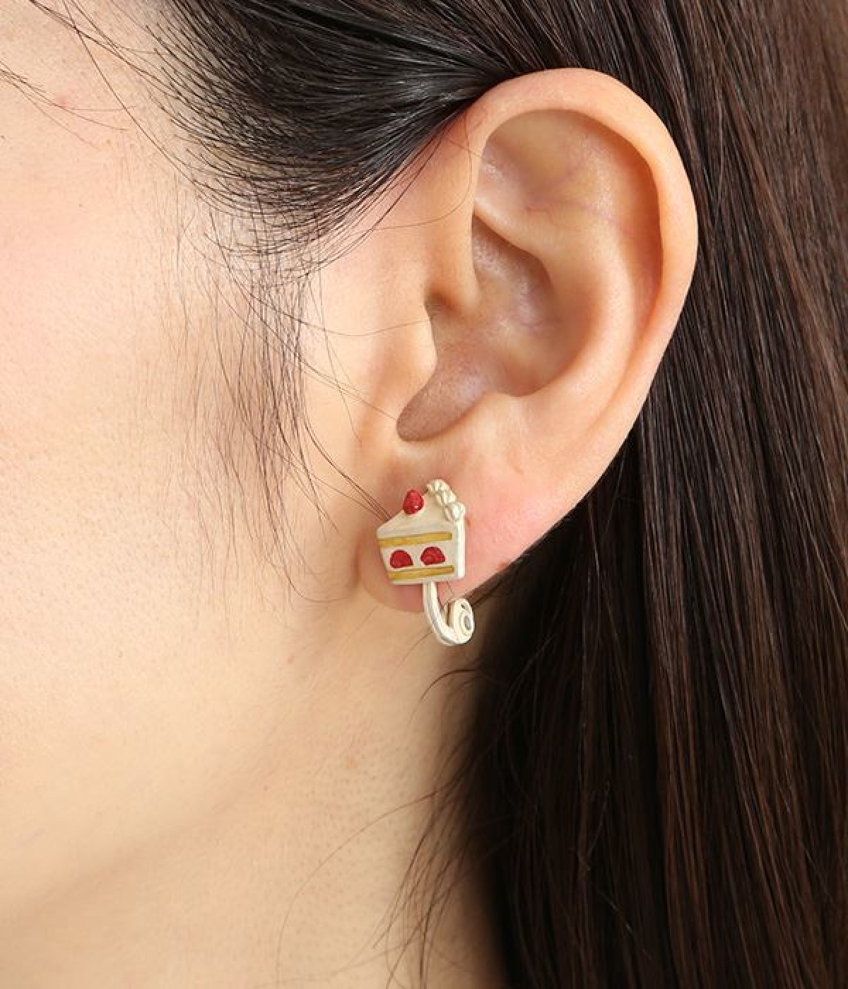 ショートケーキをモチーフにした立体的でかわいらしいデザインのイヤリングです。片方のイヤリングはいちごを鼻に見立てて顔が描かれたユーモアに溢れたデザインでホイップクリームが前髪のようにも見えるのもポイント。着けると思わず気分を上がるアイテムです。